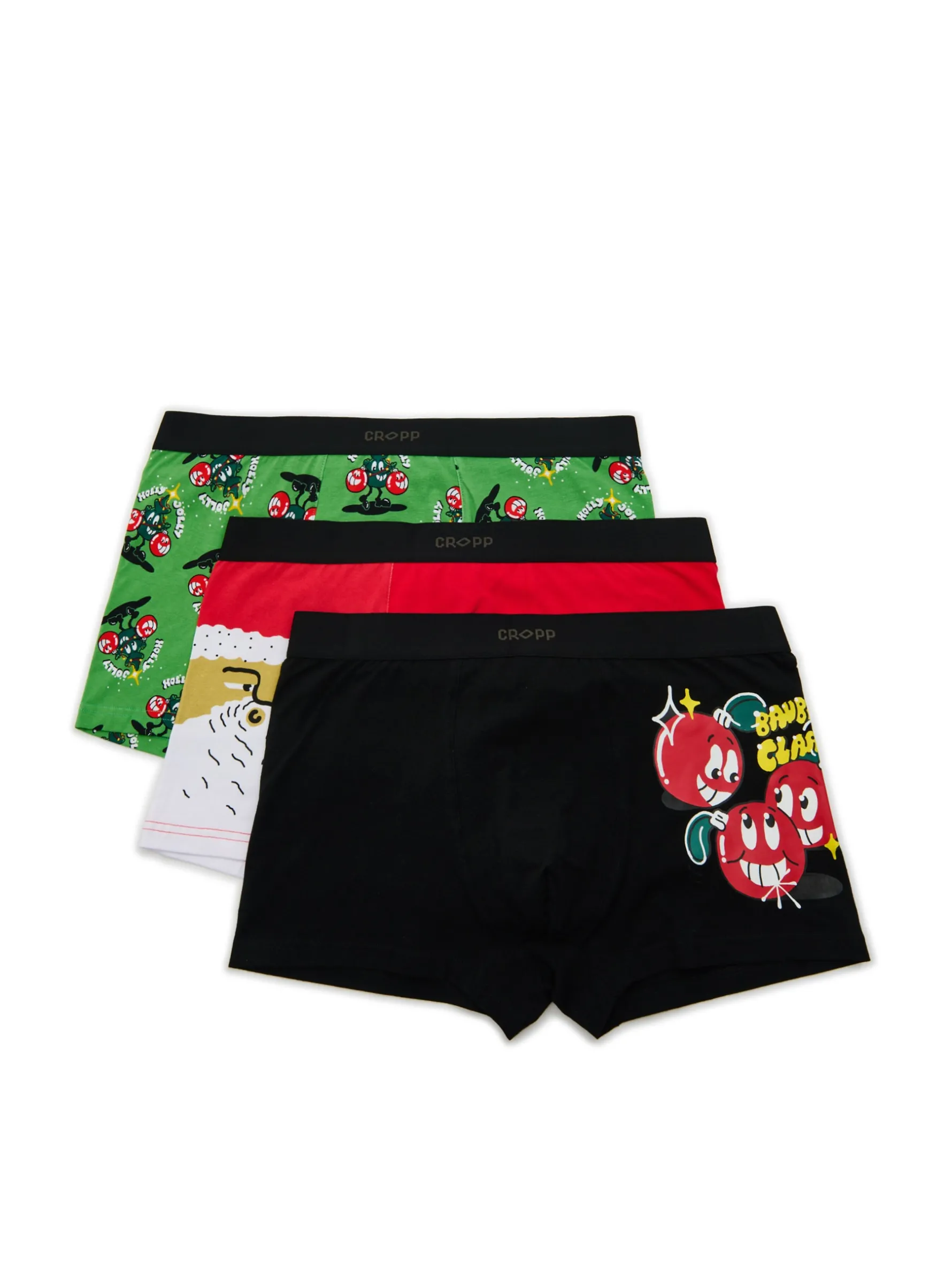 Bielizna ze świątecznym motywem dla Ciebie lub na prezent dla ziomeczka. Zestaw trzech par majtek typu bokserki uszytych z przyjemnego dla ciała materiału. Na całej powierzchni nadruki z bożonarodzeniowymi symbolami – choinką, mikołajem, bombkami. bawełna z dodatkiem elastycznych włókien regularny stan elastyczna gumka w pasie nadruk z motywem Xmas