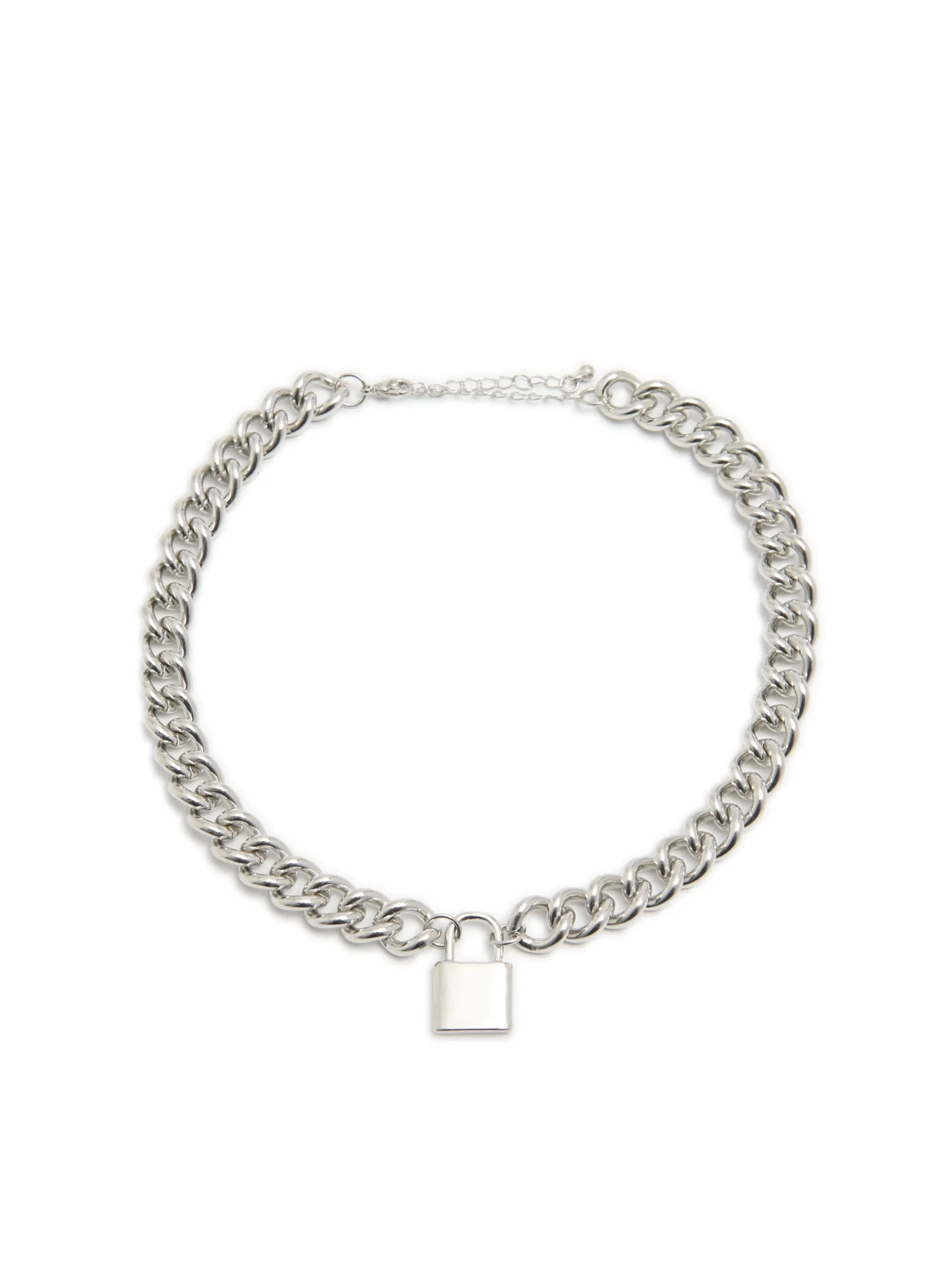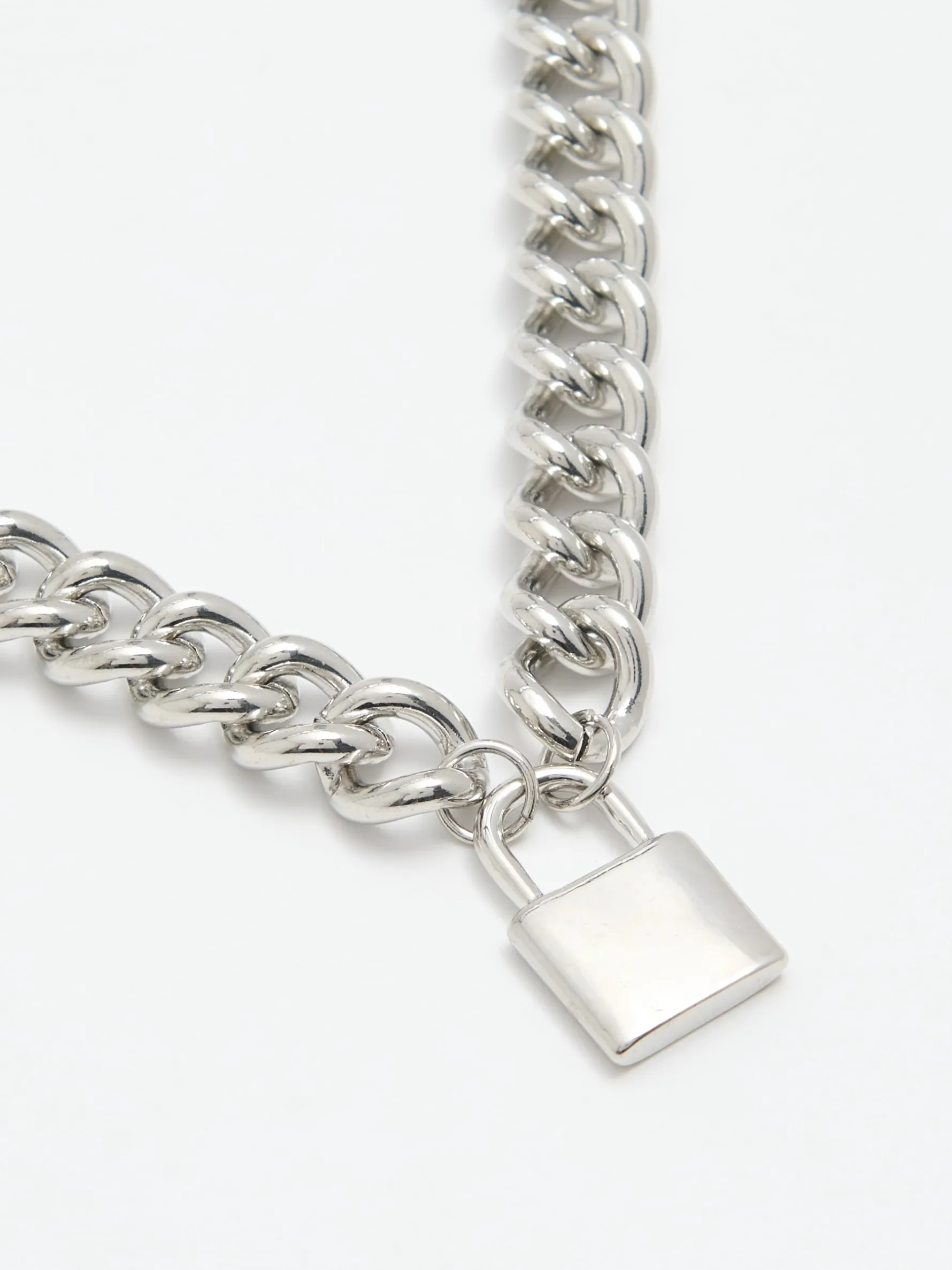 Męski naszyjnik w formie łańcucha w kolorze srebrnym, ozdobiony zawieszką w kształcie kłódki.