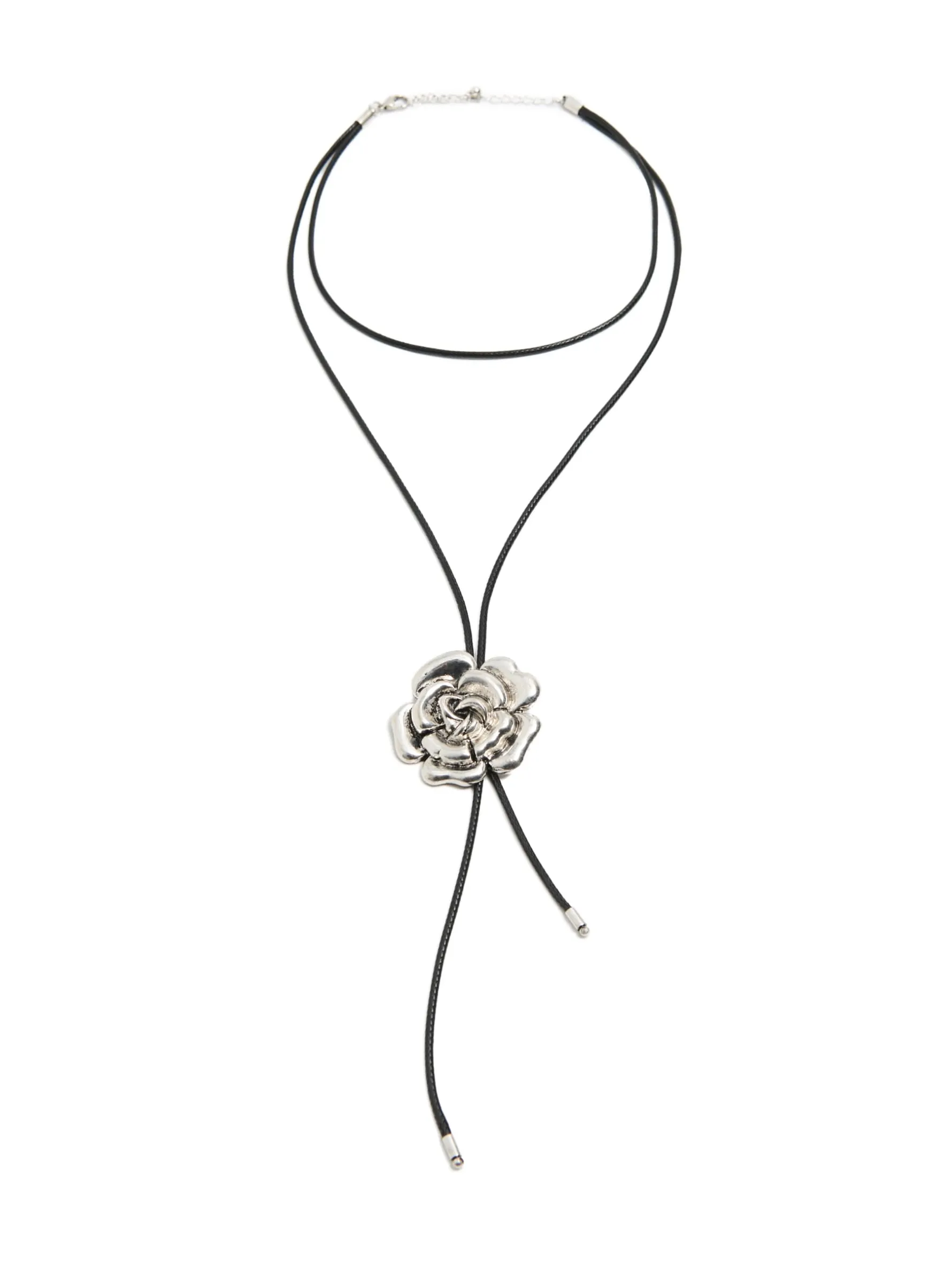 Damski naszyjnik z podwójną pętlą, zapinany na karabińczyk z możliwością regulacji obwodu. Ozdobą są detale w srebrnym kolorze, w tym unikatowa zawieszka w kształcie róży.