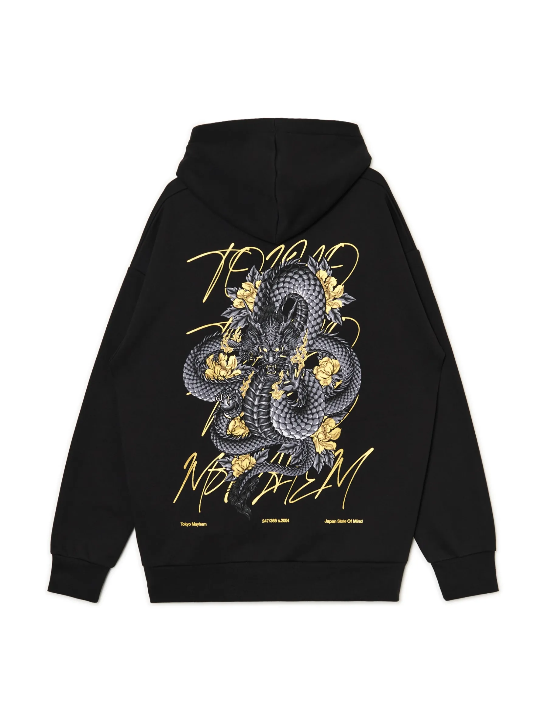 Bluza męska z kapturem o kroju loose, uszyta z mieszanki dzianin z dodatkiem miękkiej bawełny french terry. Z przodu drobny napis na piersi, a na plecach duży nadruk z motywem smoka. dzianinowy materiał z bawełną swobodny, luźny krój długie rękawy wykończone elastycznym ściągaczem obniżona linia ramion miękki kaptur kieszeń kangurka na przodzie dół wykończony delikatnym, prążkowanym ściągaczem mały nadruk na piersi, duży nadruk na plecach