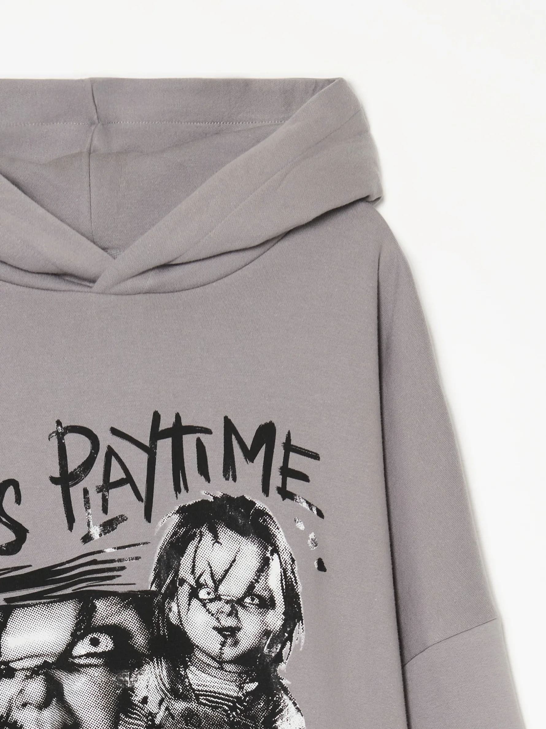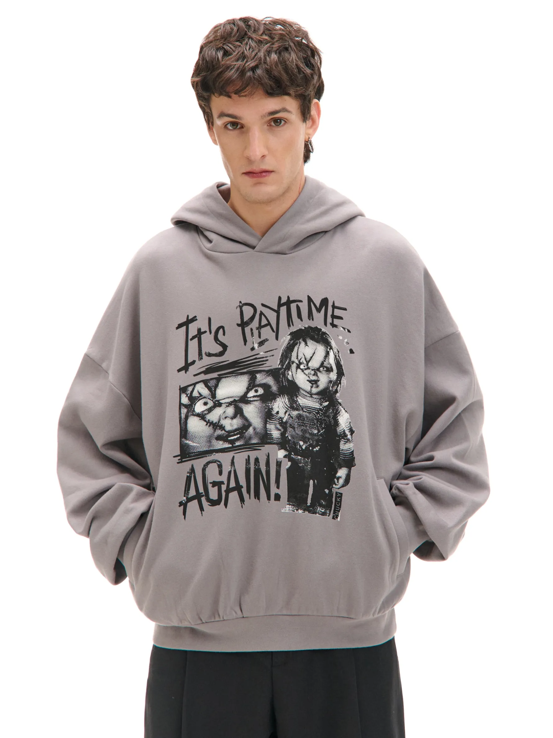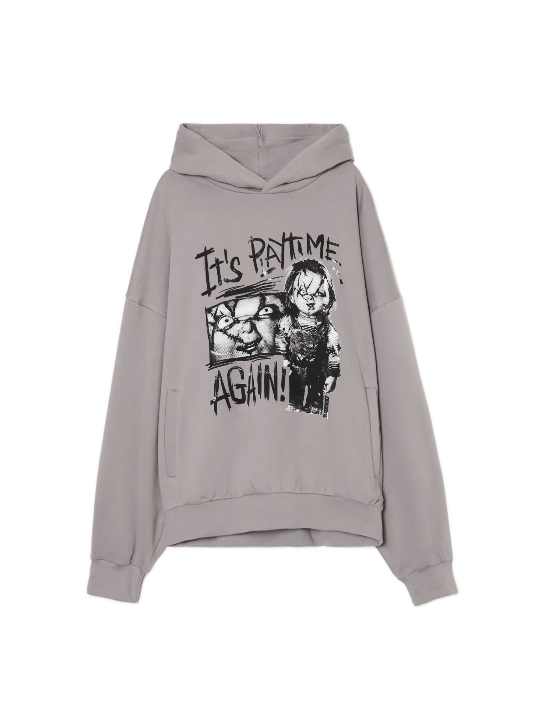Laleczka Chucky chętnie pobawi się na imprezie halloweenowej. Męska bluza hoodie uszyta z miękkiej i trwałej mieszanki dzianin w jasnoszarym kolorze. Na przodzie licencjonowana grafika z tą creepy lalką. Łap ten item! dzianinowy materiał z bawełną obszerny krój boxy miękki kaptur długie rękawy z obniżoną linią ramion dwie kieszenie boczne dół i rękawy wykończone prążkowanym ściągaczem nadruk z motywem Halloween CHUCKY FRANCHISE © UNIVERSAL CITY STUDIOS LLC. ALL RIGHTS RESERVED