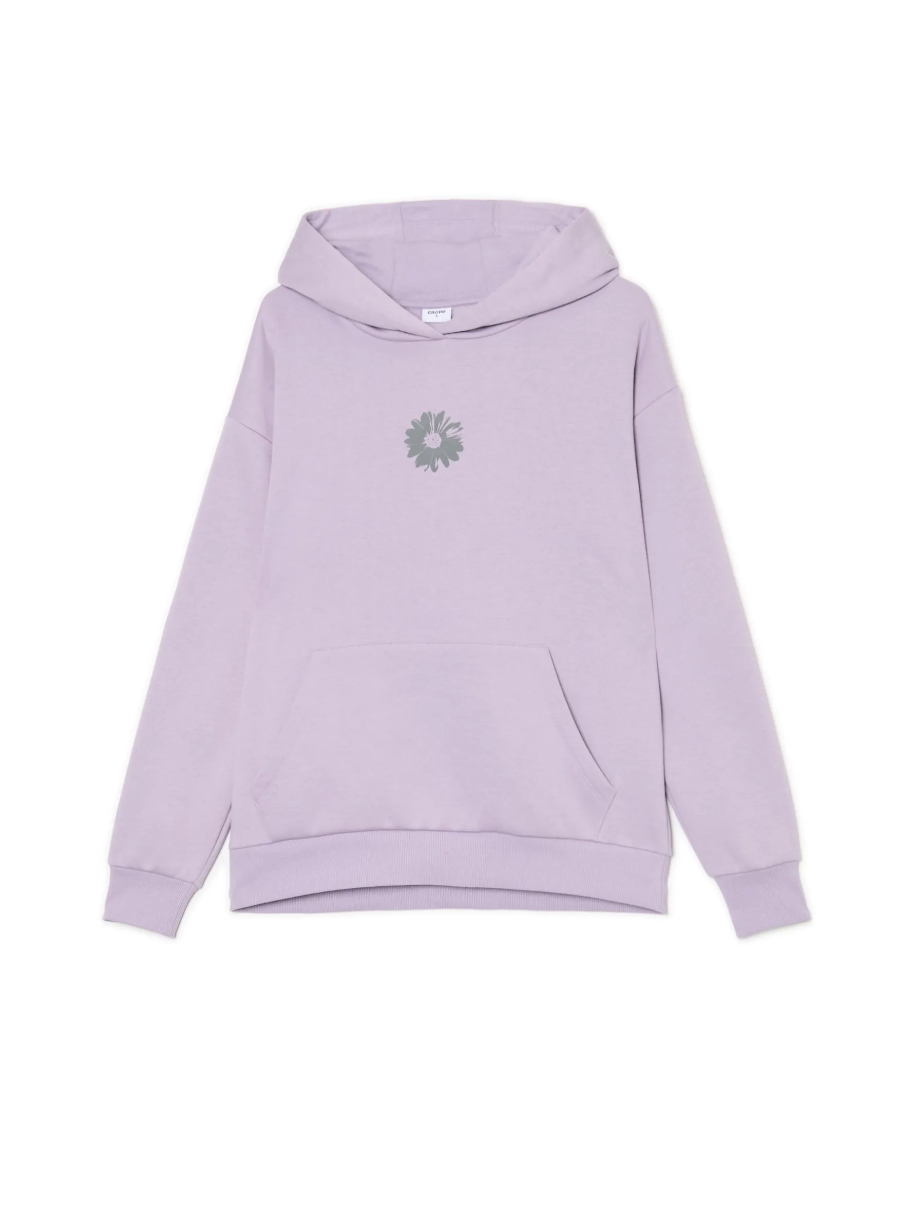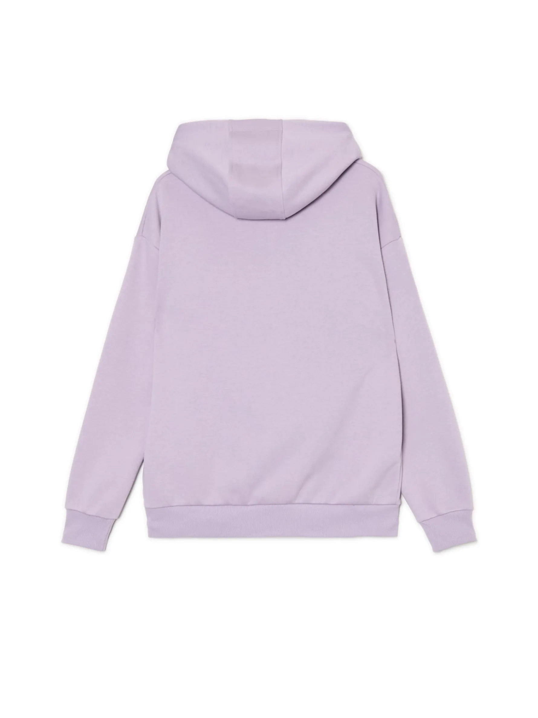 Ciepła damska bluza z kapturem uszyta z trwałej mieszanki dzianin w liliowym kolorze. Item, który otuli Cię w chłodne wieczory. uszyta z miękkiej dzianiny z bawełną regularny krój obszerny kaptur długie rękawy z obniżoną linią ramion z przodu duża kieszeń typu kangurka dół i rękawy wykończone prążkowanym ściągaczem niewielki nadruk z przodu