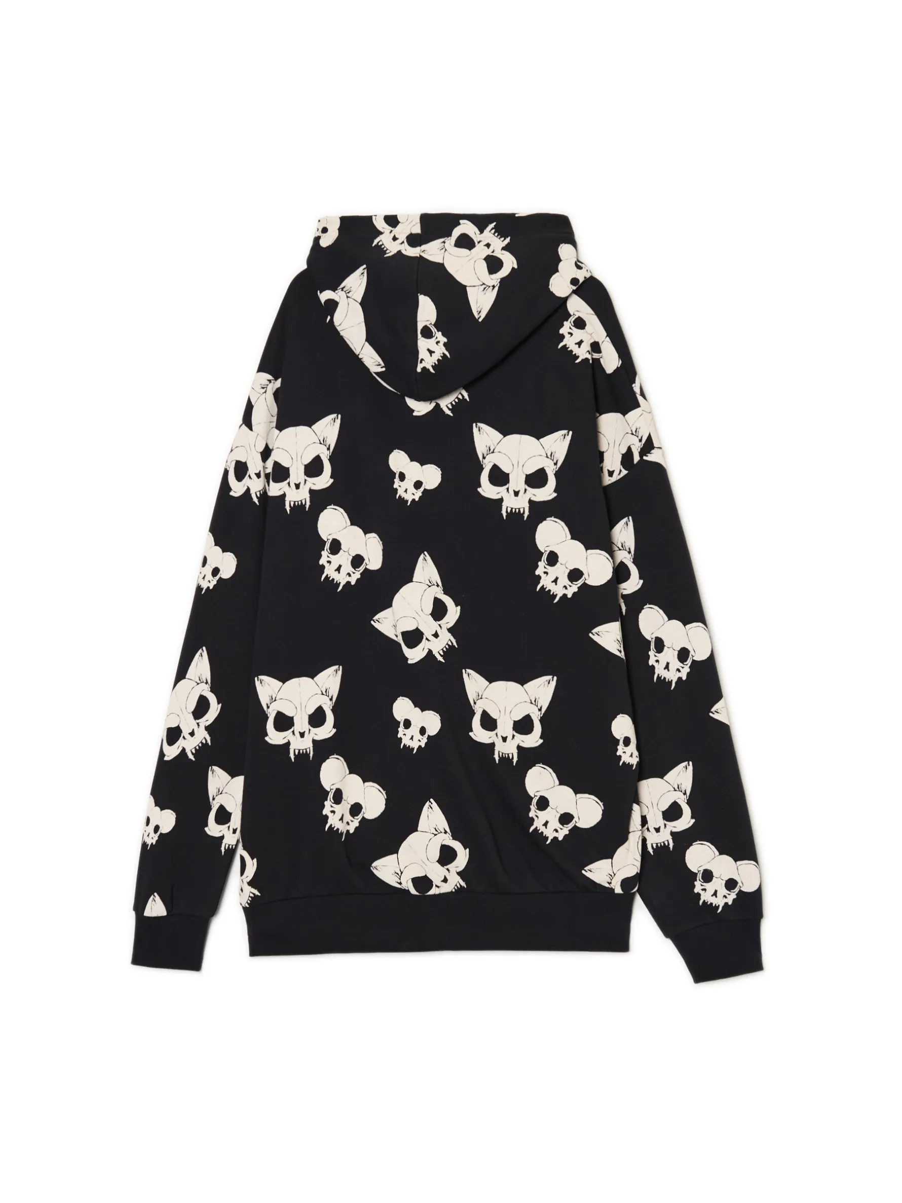 Mamy dla Ciebie casualowy item na beforek halloweenowy i nie tylko. Męska bluza z kapturem o luźnym kroju, uszyta z czarnej mieszanki dzianin z bawełną. Na całej powierzchni creepy nadruk z czaszkami kotów i myszy. Buaaaah! uszyta z miękkiej dzianiny z bawełną swobodny, luźny krój miękki kaptur długie rękawy z obniżoną linią ramion kieszeń kangurka na przodzie dół i rękawy wykończone prążkowanym ściągaczem niewielki haft z przodu nadruk z motywem Halloween