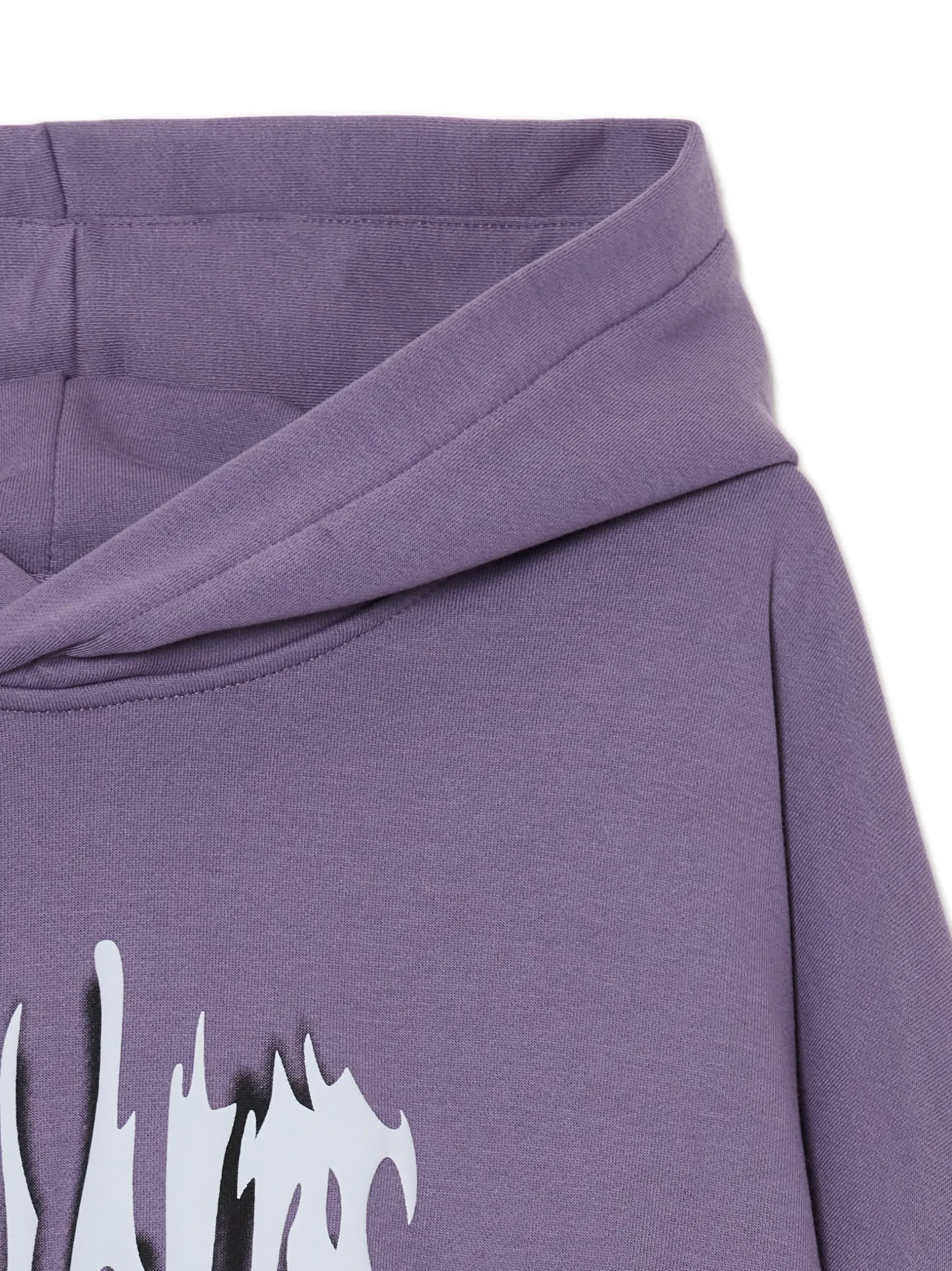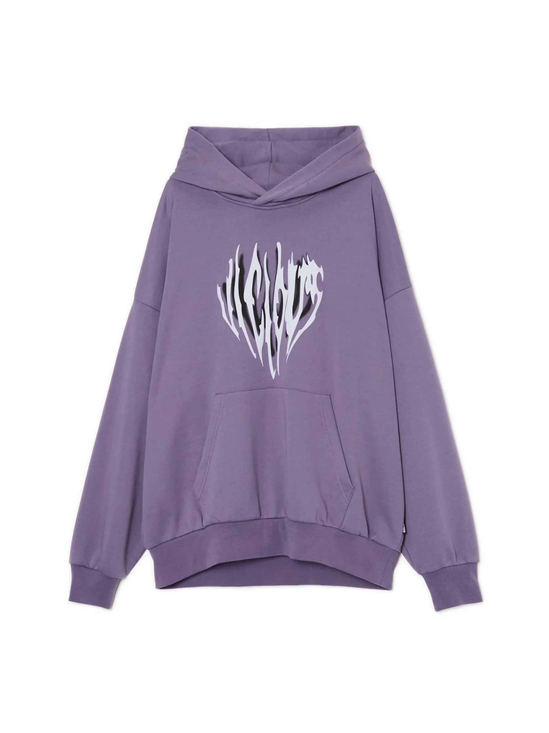 Fioletowa bluza męska z kapturem, zakładana przez głowę. Uszyta z mieszanki dzianin z solidną bawełną french terry. Na przodzie kieszeń kangurka i nadruk z efektem sprania. dzianinowy materiał z bawełną krój oversize szeroki kaptur dół i rękawy wykończone ściągaczem duża kieszeń typu kangurka z przodu oryginalny print Gramatura: 340 Wzrost modela: 185 cm