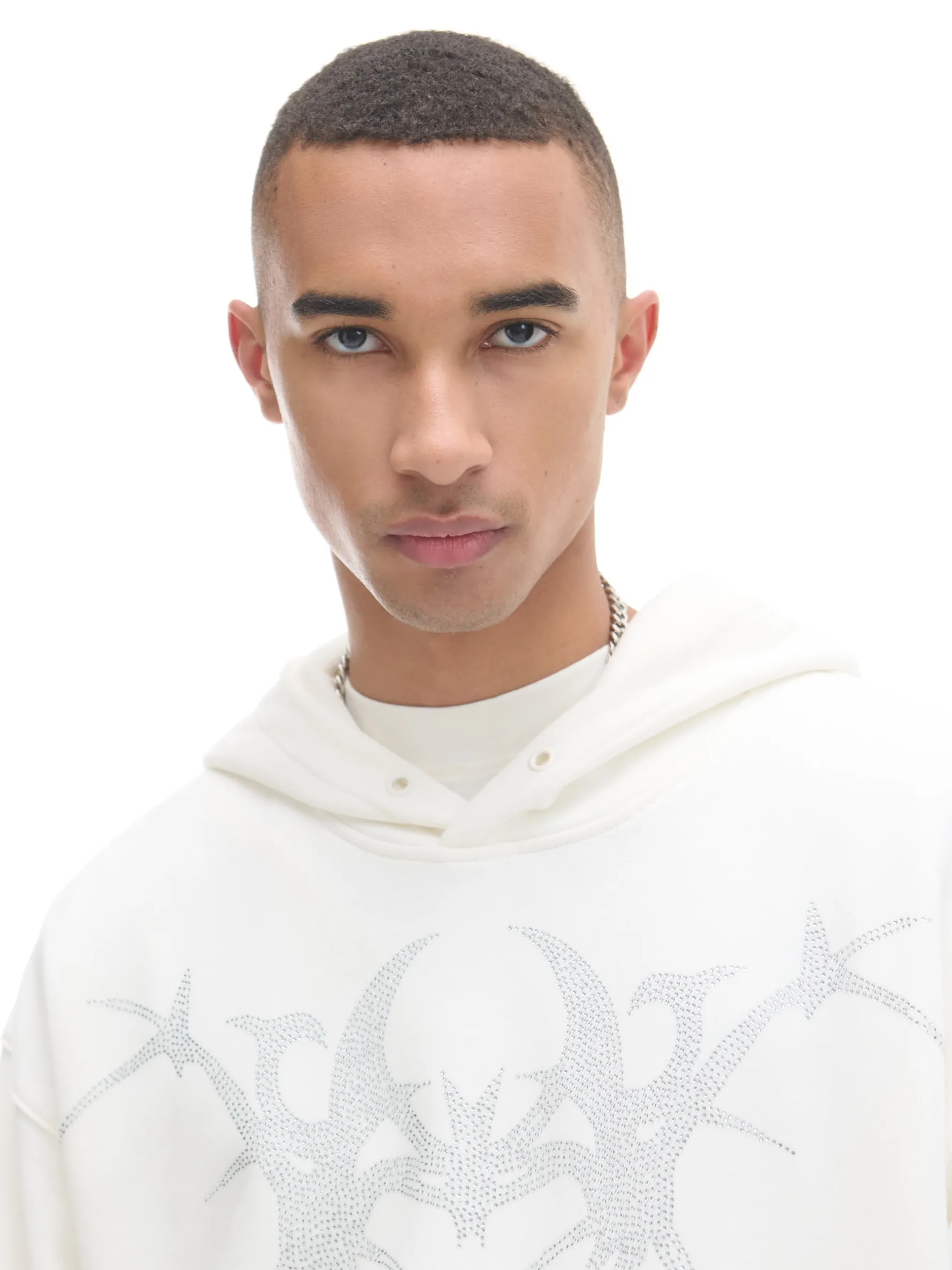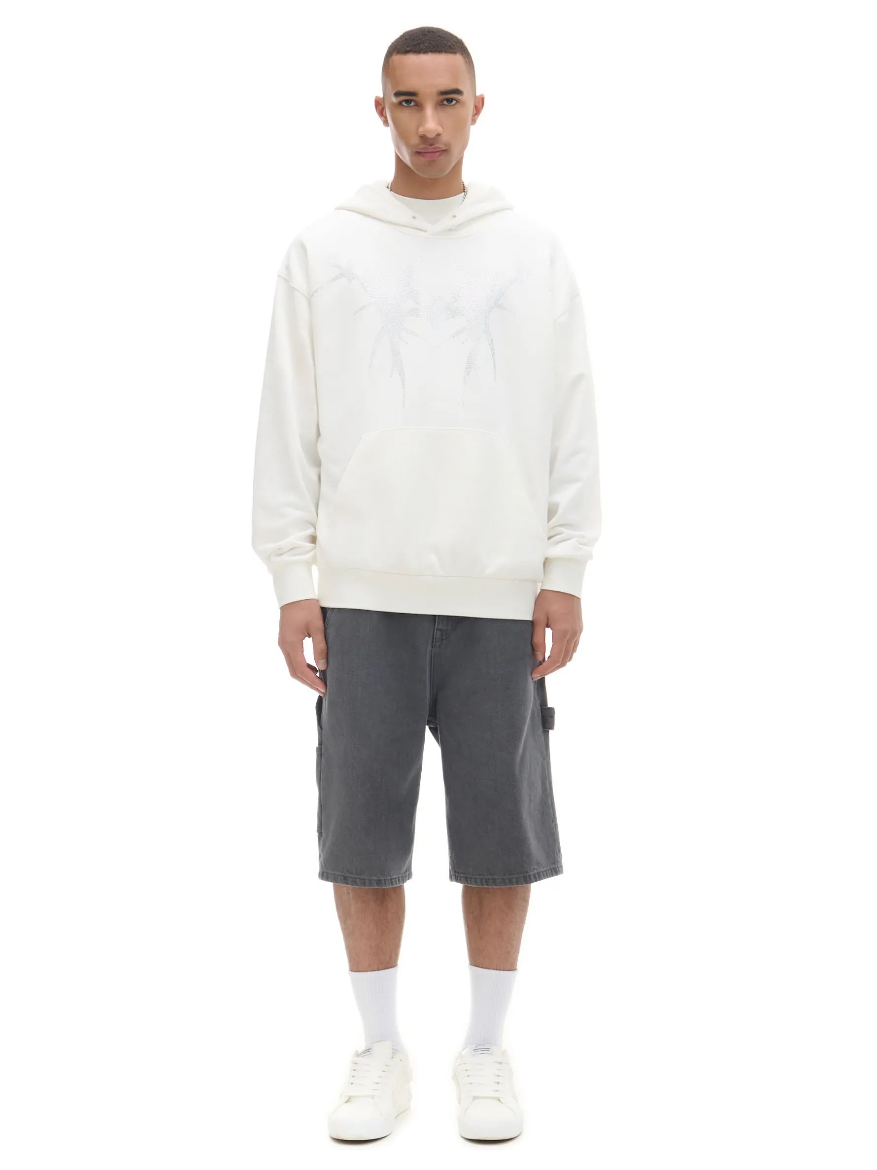 Męska bluza o luźnym kroju, uszyta z mieszanki dzianin, w tym z pętelkowej bawełny french terry. Przyjemny w dotyku materiał otuli Cię w chłodne dni! dzianinowy materiał z bawełną luźny fason z obniżoną linią ramion obszerny kaptur dół i mankiety wykończone ściągaczami duża kieszeń typu kangurka z przodu z przodu aplikacja Gramatura: 300 gsm Wzrost modela: 185 cm