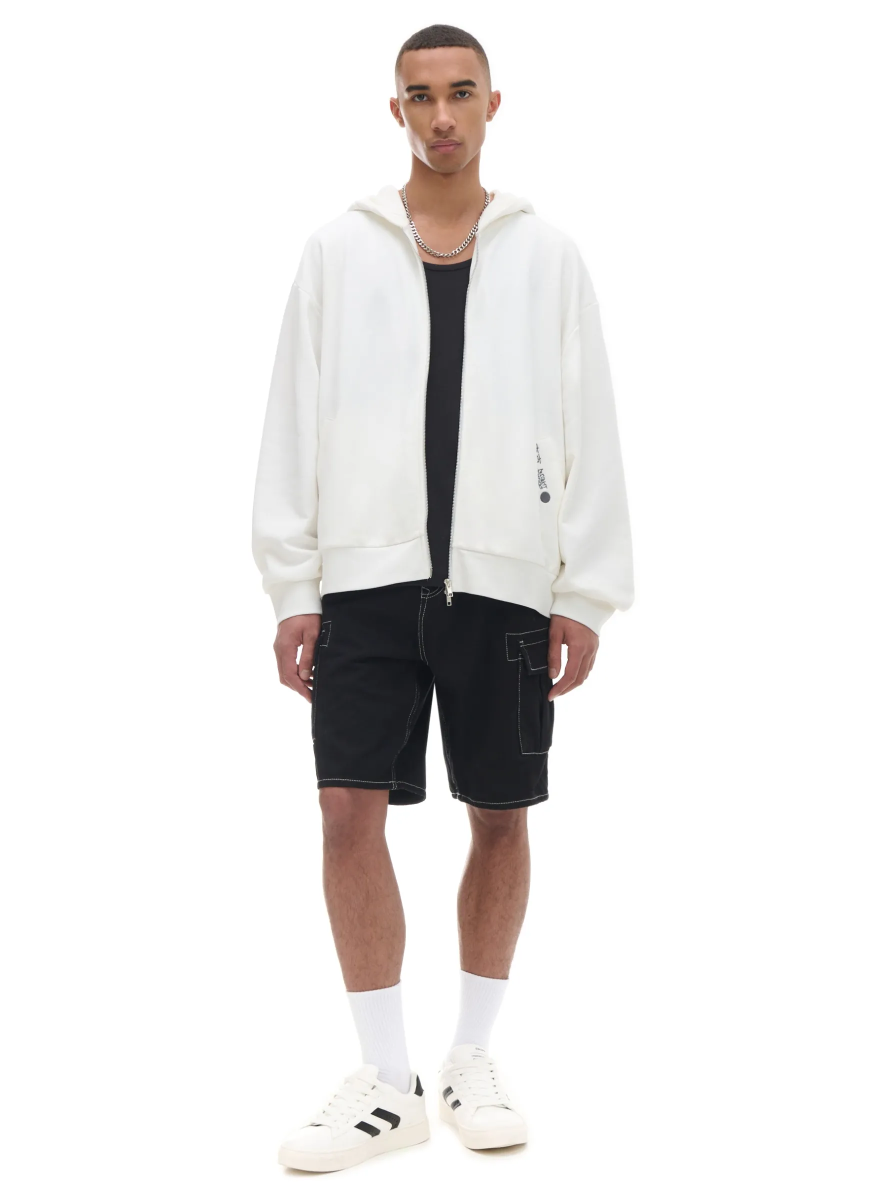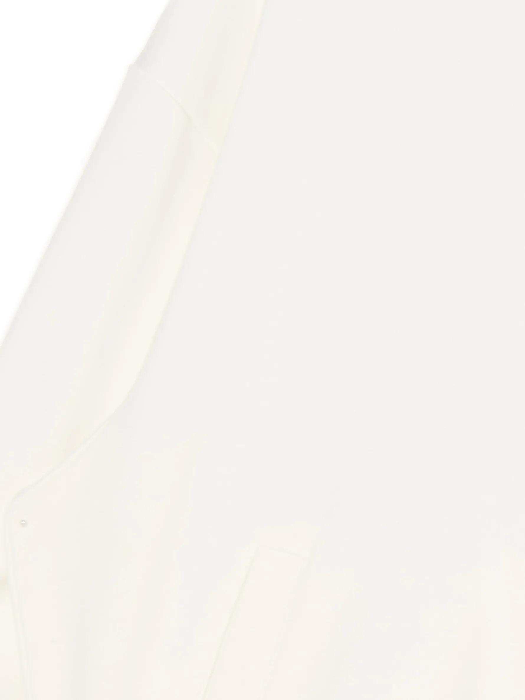 Męska bluza z kapturem, uszyta z dzianiny z dodatkiem bawełny w kremowym kolorze. Wyróżnia się podwójnym zapięciem i efektownym nadrukiem na plecach. dzianinowy materiał z bawełną luźny krój zapięcie na podwójny zamek szeroki kaptur dół i mankiety wykończone ściągaczami duży nadruk z motywem smoka Wzrost modela: 185 cm