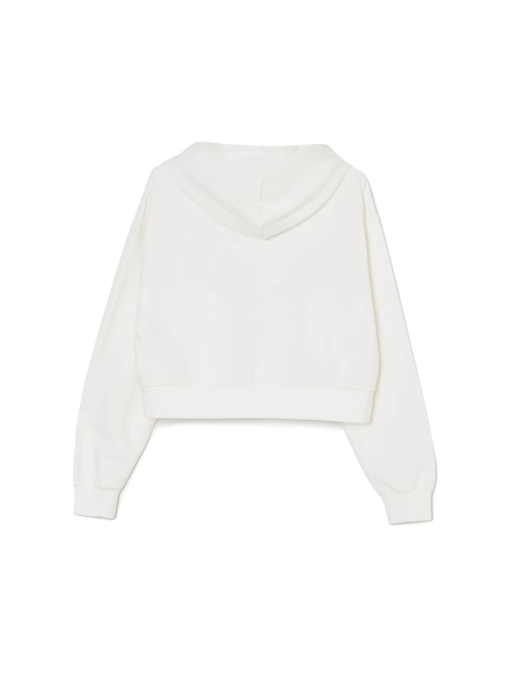Biała damska bluza o krótkim kroju, uszyta z mieszanki dzianin zawierającej bawełnę. Must have na letnie wypady z ekipą! krótki krój typu crop z przodu zapięcie na suwak kaptur regulowany sznurkiem dwie kieszenie z przodu dół i rękawy wykończone ściągaczem ozdobna denimowa aplikacja w kształcie motyla Wzrost modelki: 172 cm
