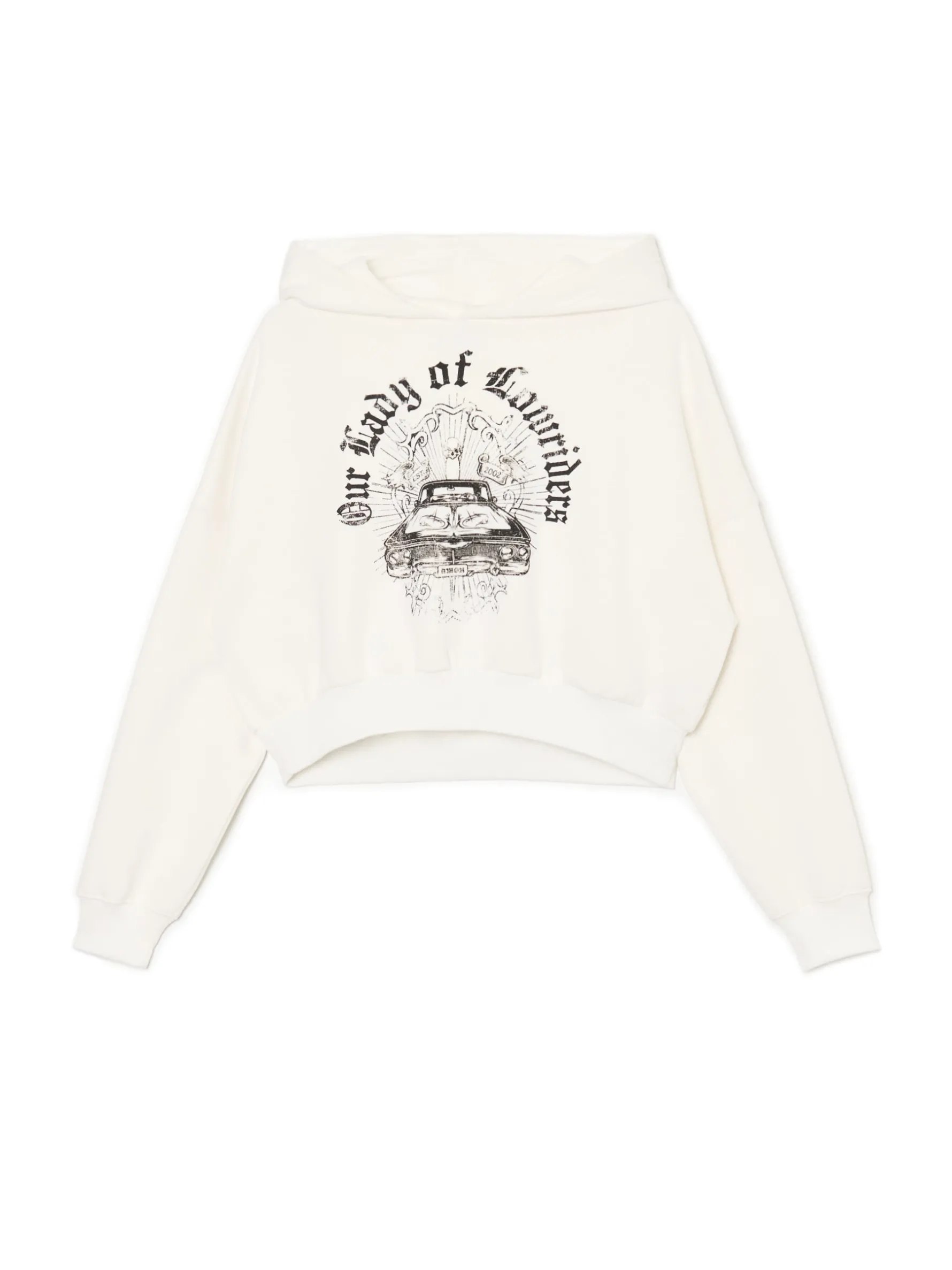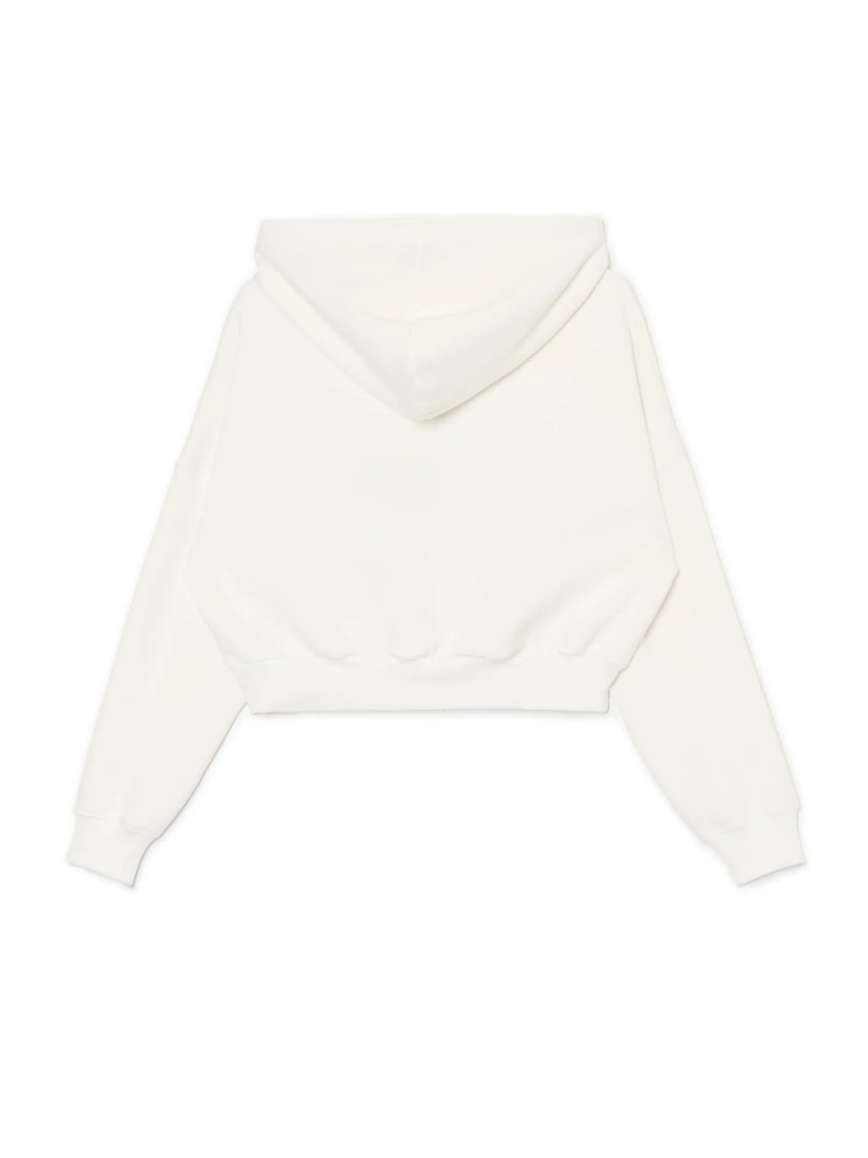 Damska bluza typu hoodie crop, uszyta z mieszanki dzianin w jasnym kolorze. Ten item wyróżnia szeroki kaptur, krótki krój i print z delikatnym efektem sprania. dzianinowy materiał z bawełną krótszy krój obszerny kaptur długie rękawy z obniżoną linią ramion dół i mankiety wykończone ściągaczami kontrastowy nadruk z przodu Wzrost modelki: 172 cm