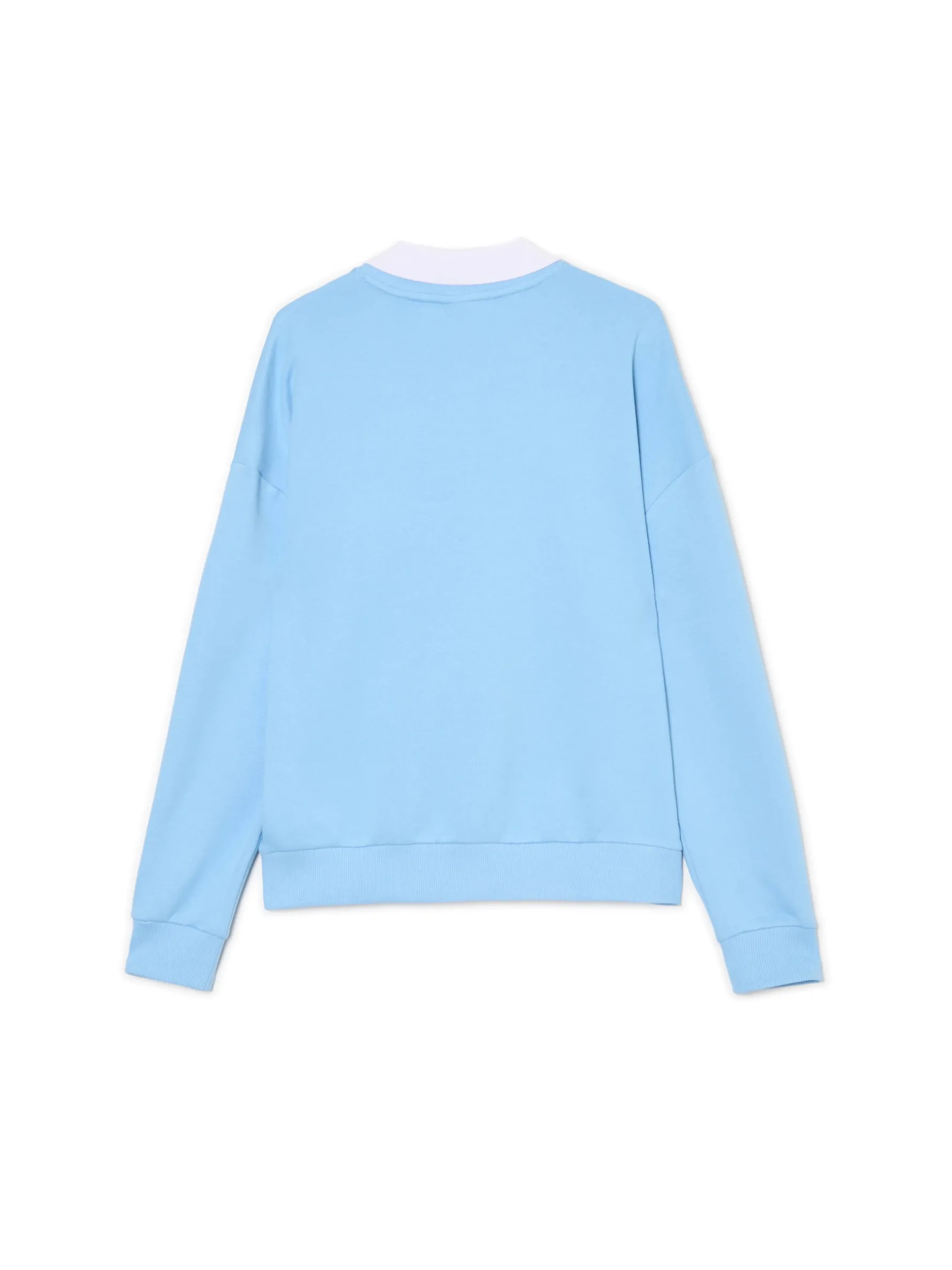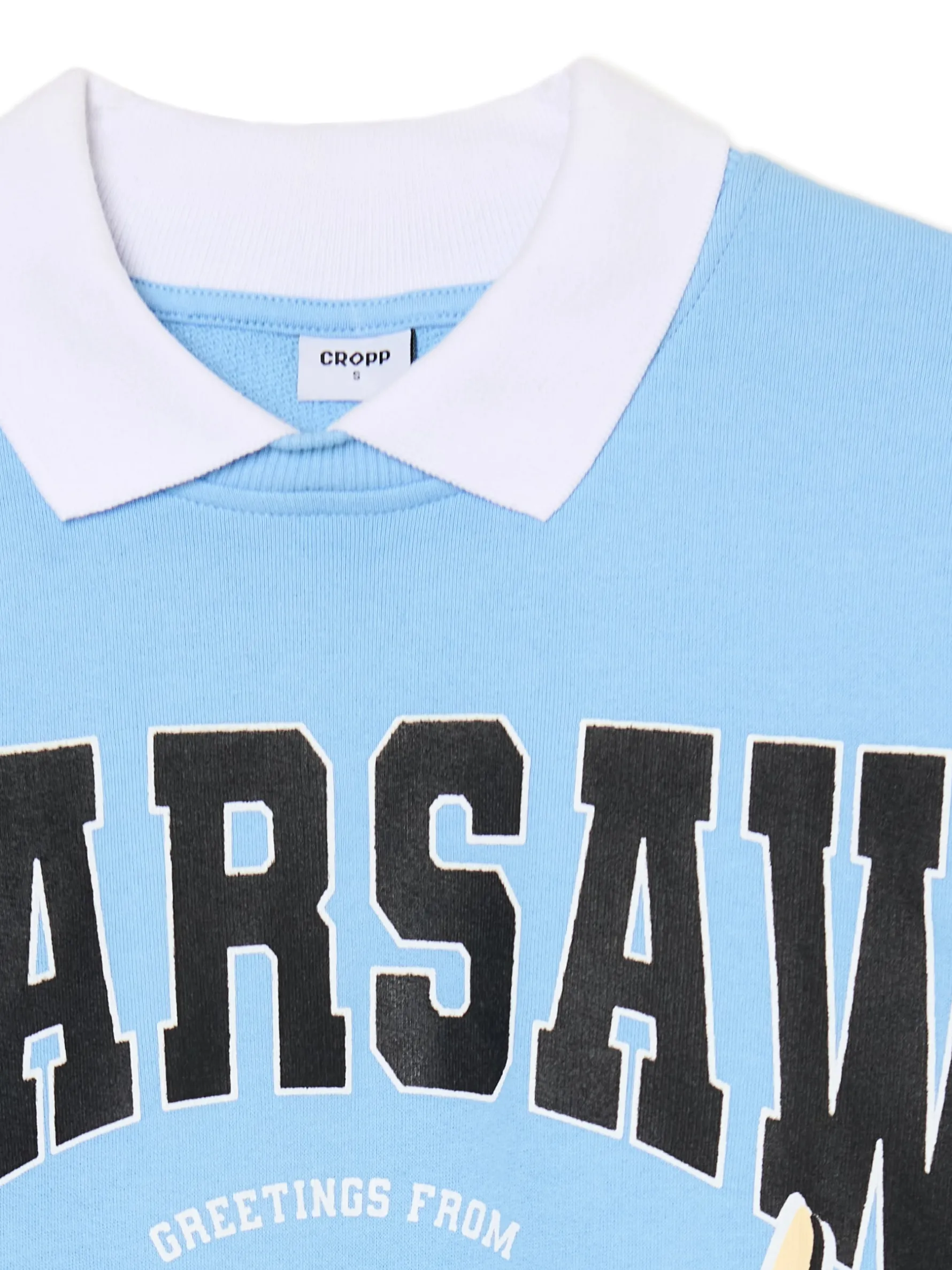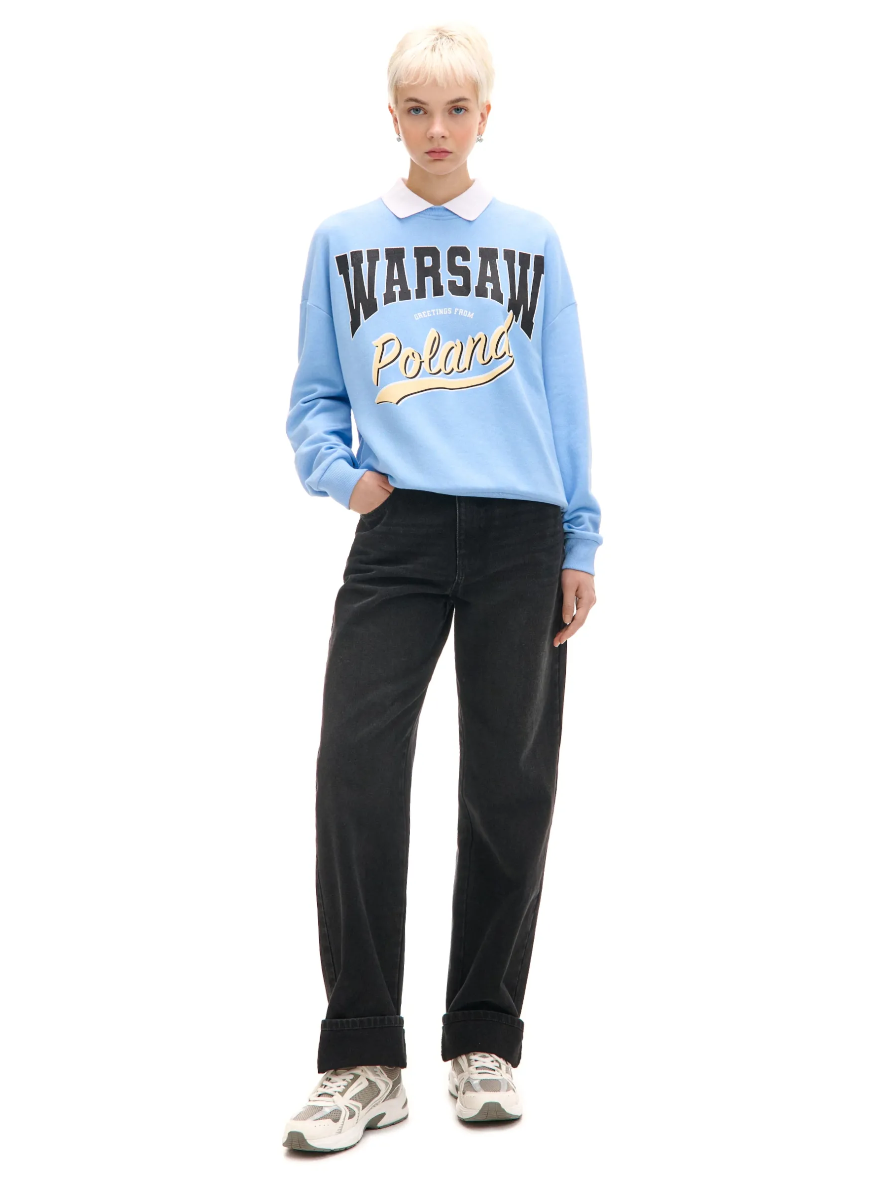 Damska bluza w modnym, błękitnym kolorze z tekstowymi nadrukami na przodzie i białym kołnierzykiem przy dekolcie. Ciekawy item do pracy, szkoły, czy na uczelnię. dzianinowy materiał z bawełną swobodny, luźny krój okrągły dekolt z lamówką klasyczny kołnierzyk długie rękawy z obniżoną linią ramion dół i rękawy wykończone prążkowanym ściągaczem z przodu nadruki tekstowe