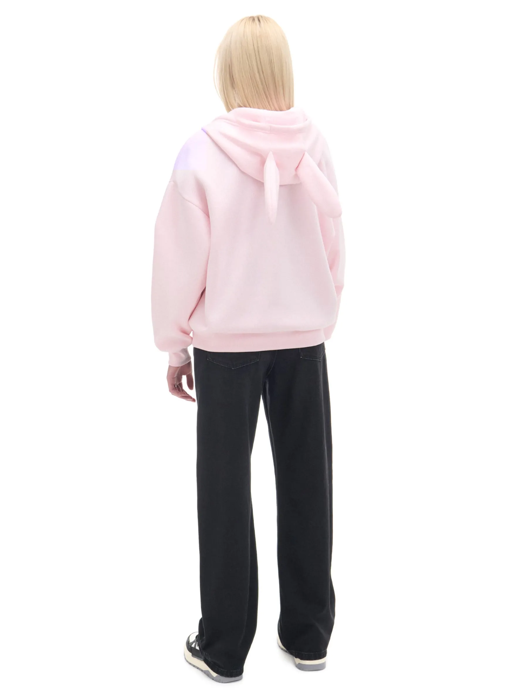 Damska rozpinana bluza, uszyta z różowej, przyjemnej w dotyk dzianiny zawierającej bawełnę. luźny krój oversize zapięcie na suwak dół i rękawy zakończone dzianinowym ściągaczem kaptur z króliczymi uszkami My Melody dwie kieszenie haft z motywem My Melody Wzrost modelki: 177 cm © 2024 SANRIO CO., LTD.