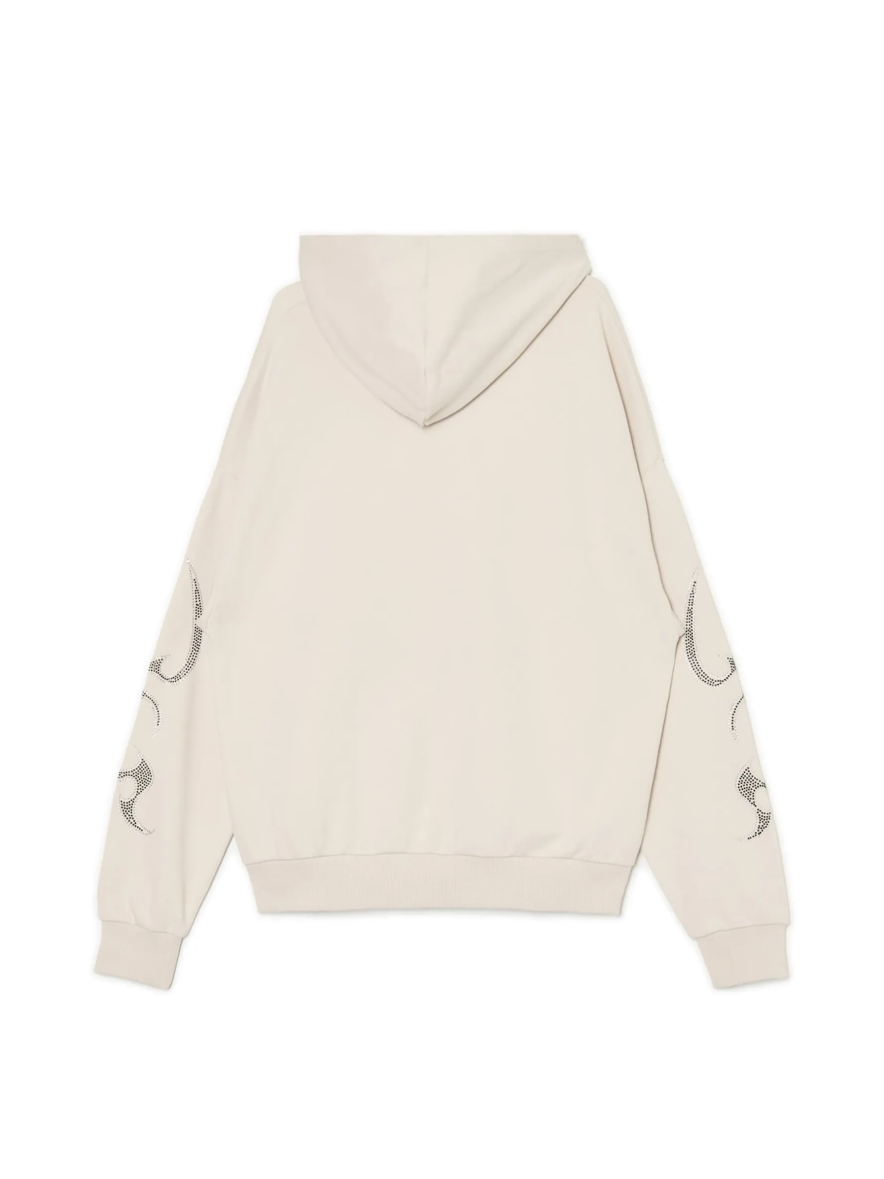 Bluza damska typu hoodie, uszyta z dzianiny z dodatkiem miękkiej bawełny french terry. Ozdobne cekinowe aplikacje to oryginalne wykończenie tego modelu. dzianinowy materiał z bawełną swobodny, luźny krój zapięcie na metalowy zamek miękki kaptur dół i mankiety wykończone ściągaczami otwarte kieszenie po bokach ozdobna aplikacja z przodu i na rękawach Wzrost modelki: 172 cm