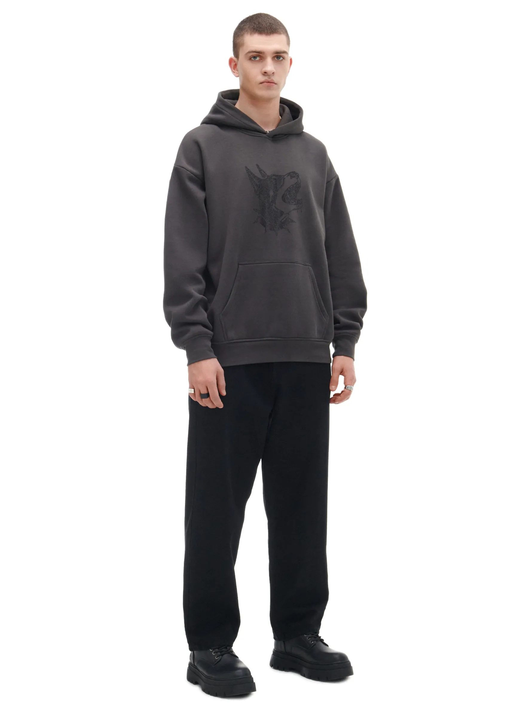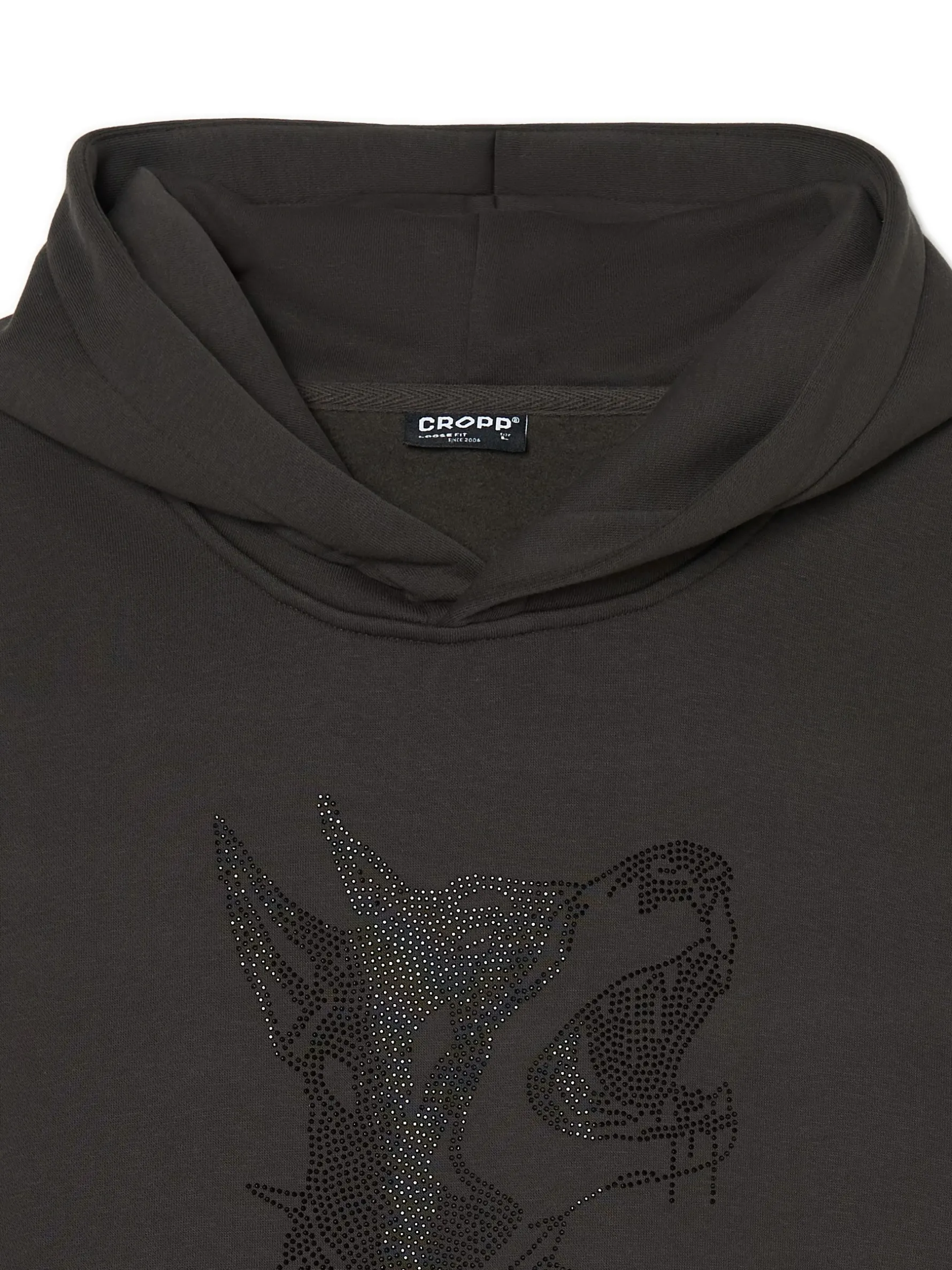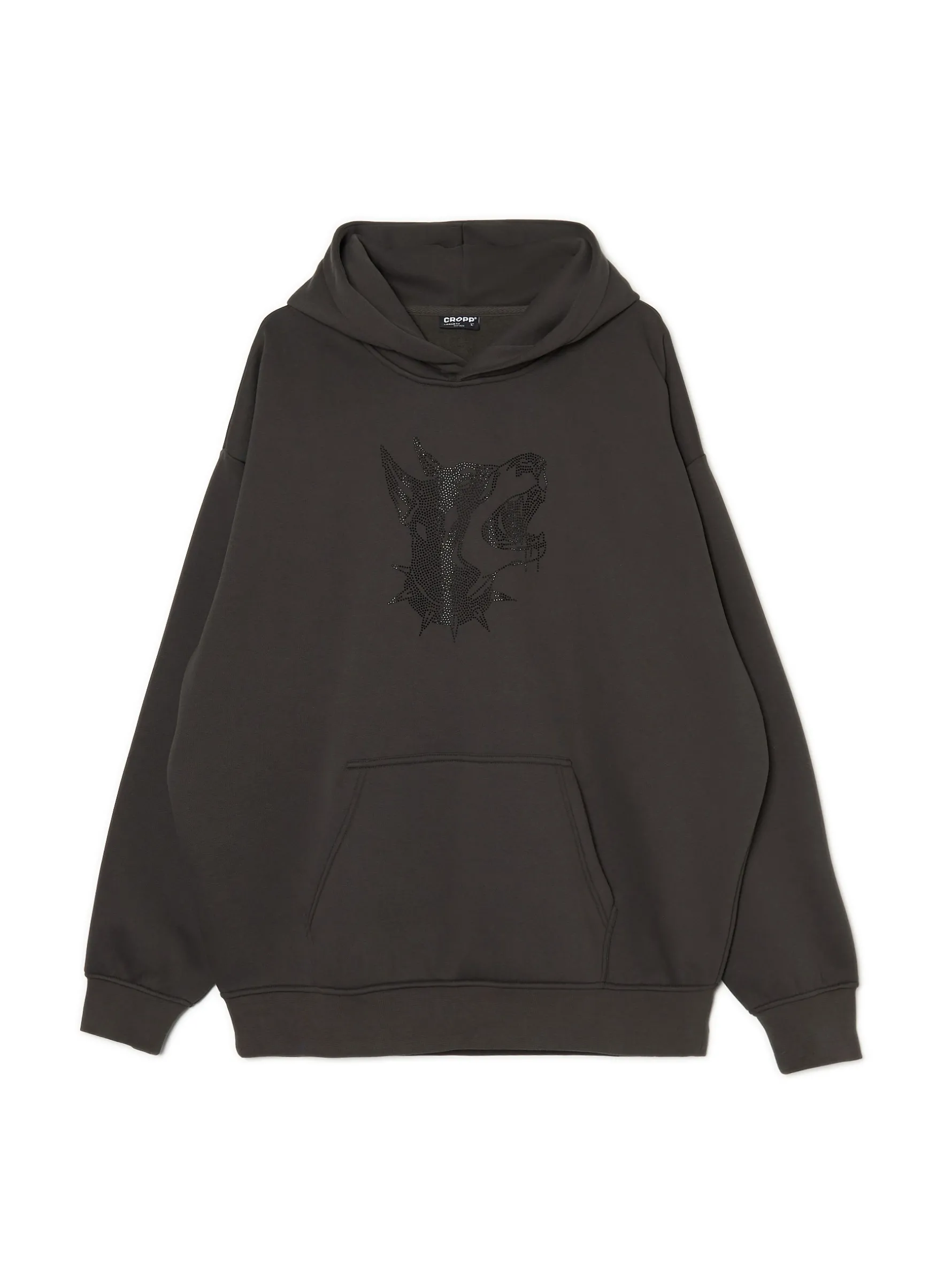 Szara męska bluza z kapturem, uszyta z dzianiny zawierającej bawełnę. krój loose rękawy i dolny brzeg zakończone ściągaczami miękki kaptur kieszeń kangurka aplikacja ze sztucznych kryształków w kształcie psa dobermana