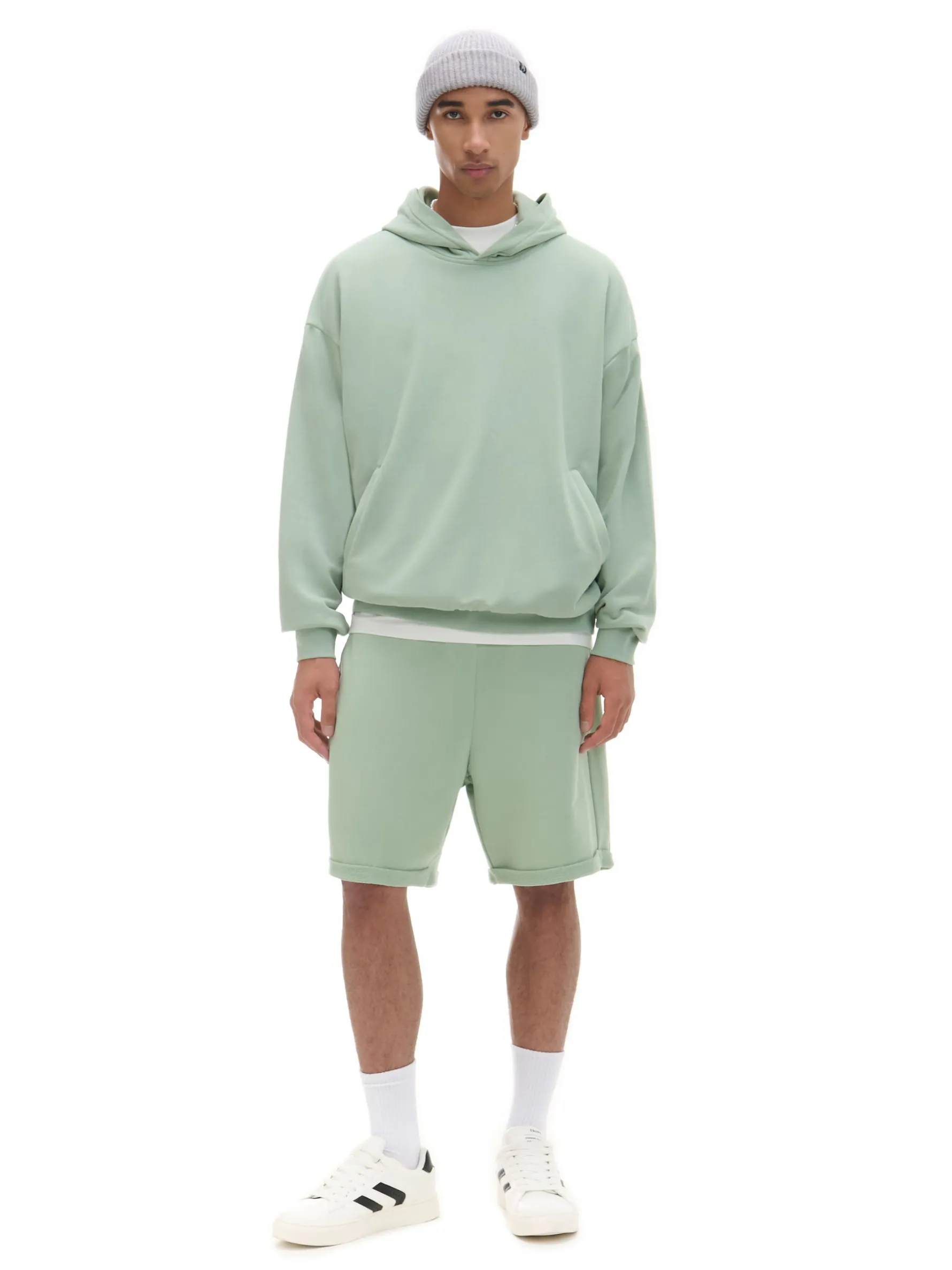 Męska dresowa bluza, zakładana przez głowę. Uszyta z miękkiej, miłej w dotyku dzianiny zawierającej bawełnę. luźny krój obniżona linia ramion miękki kapur dół i rękawy wykończone ściągaczem dwie kieszenie z przodu Wzrost modela: 185 cm