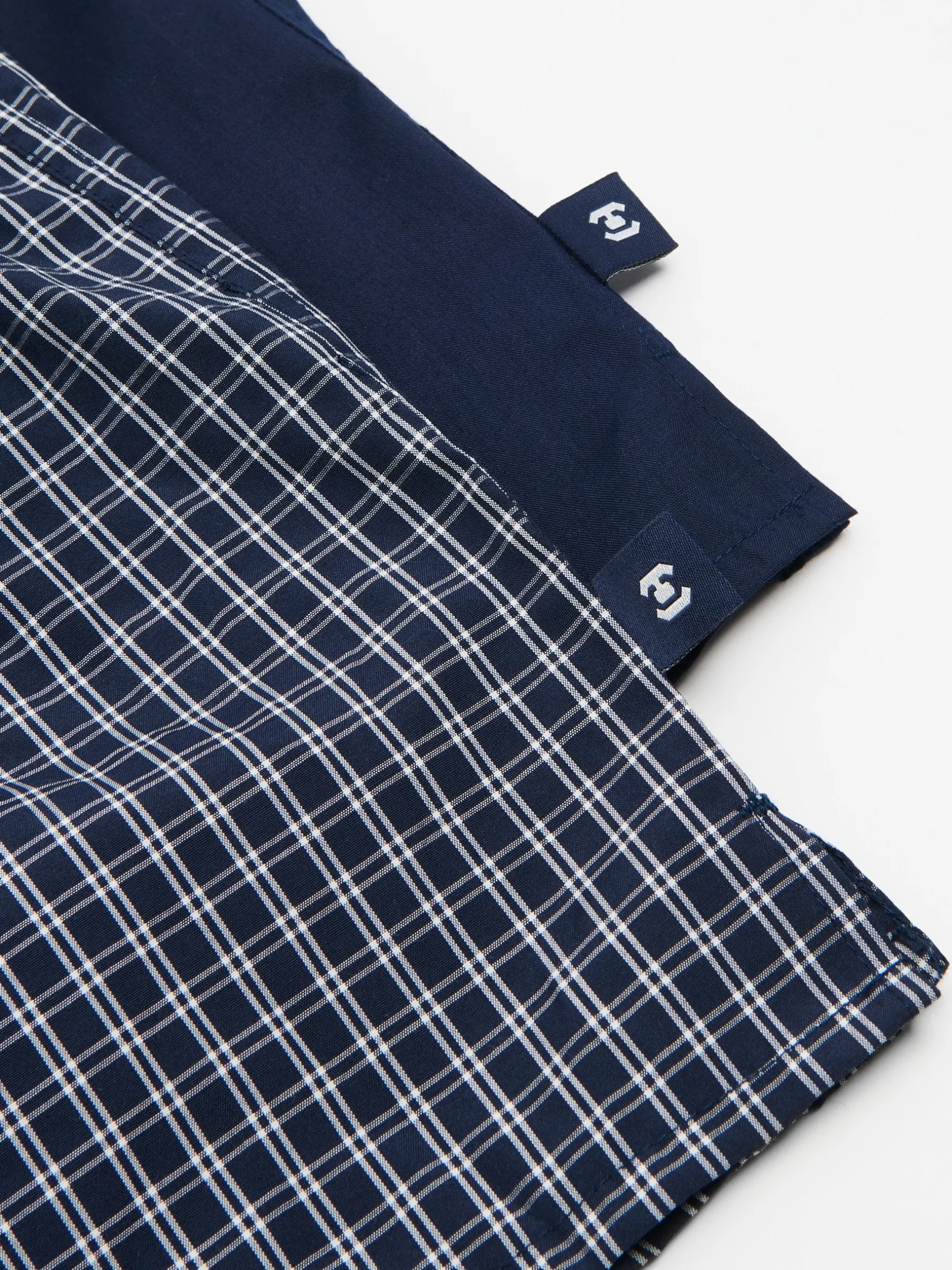 Zestaw dwóch par męskich bokserek uszytych z bawełnianej tkaniny. Swobodny, luźny krój zapewnia komfort noszenia. Dostępne również w innym wariancie kolorystycznym. 100% bawełny regularny stan elastyczna gumka w pasie wzór w kratę na całej powierzchni gładki wzór na drugim modelu naszywka Cropp