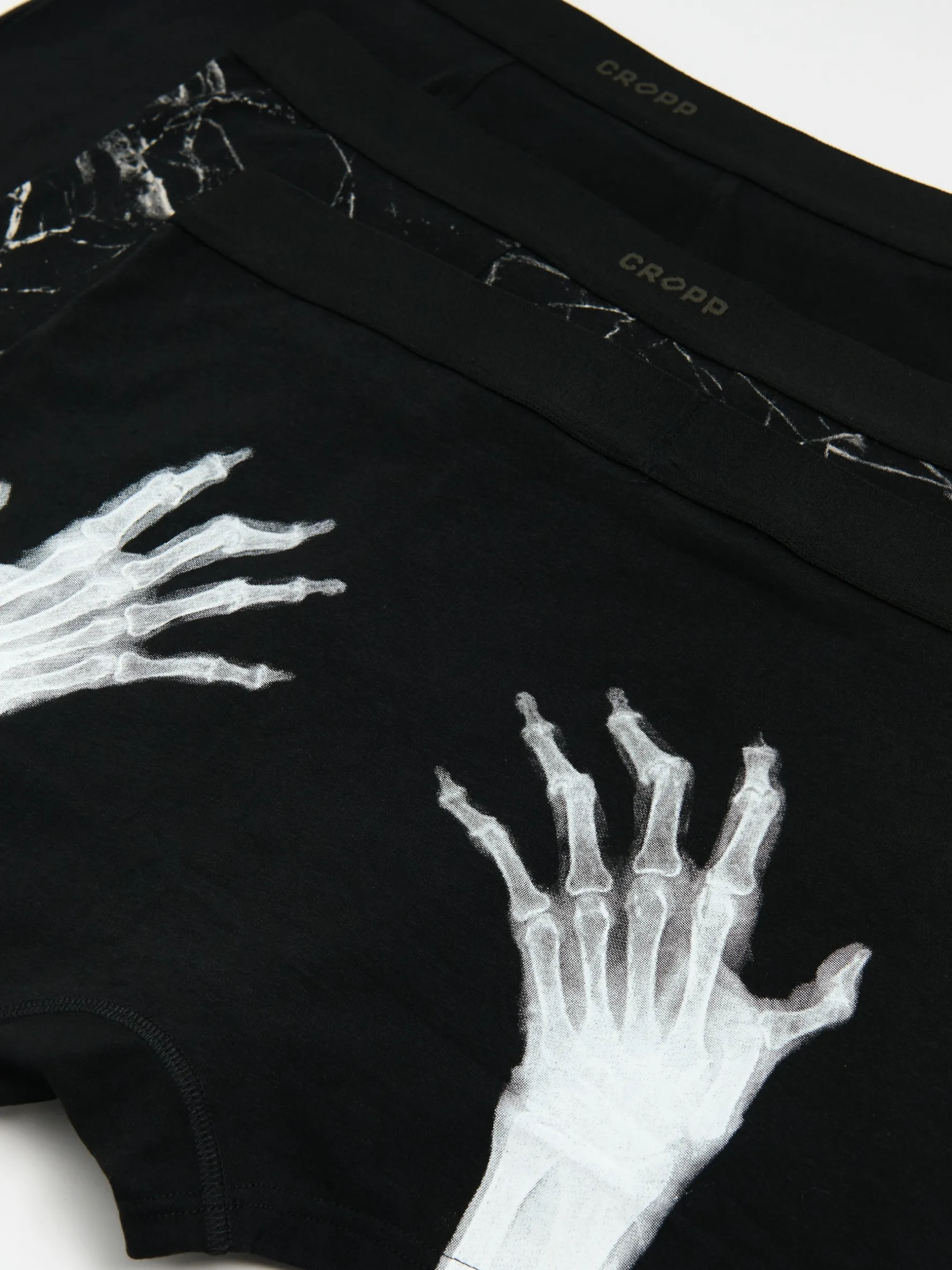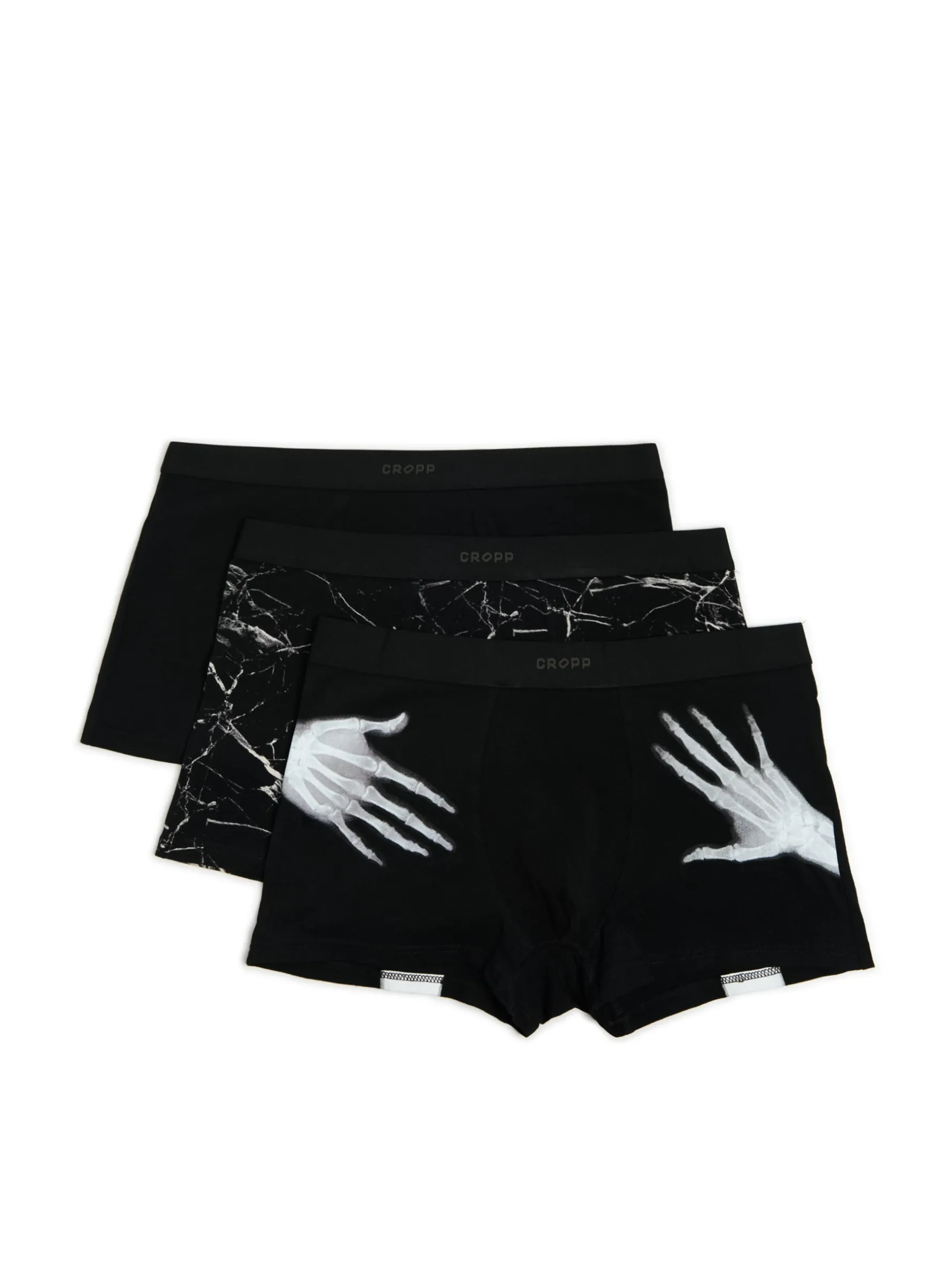 Zestaw trzech męskich bokserek, uszytych z mieszanki bawełny i elastycznych włókien z kontrastowymi nadrukami. bawełna z dodatkiem elastycznych włókien prosty krój kontrastowy nadruk z przodu