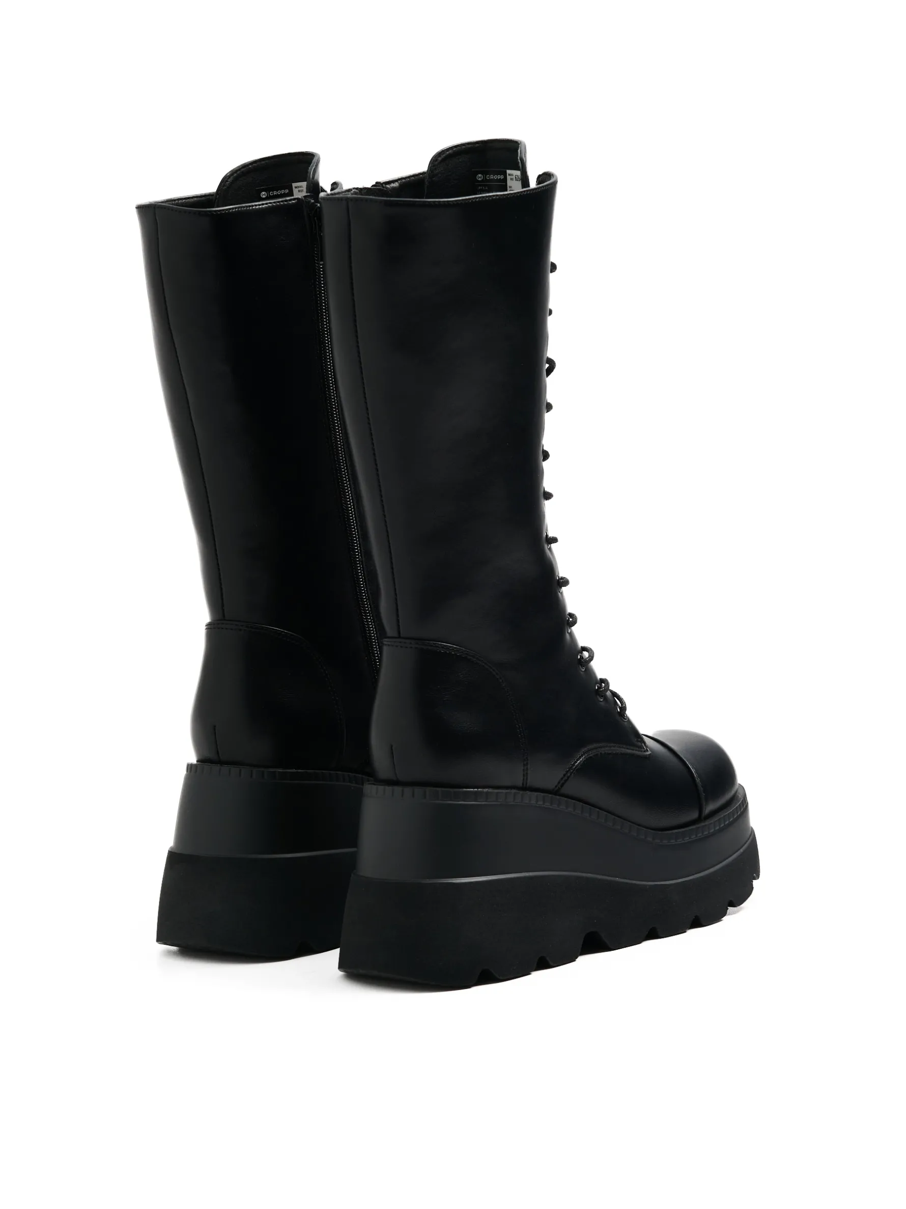Czarne damskie botki za kostkę, wykonane z lekko połyskującej imitacji skóry. Otwory przeznaczone do przeciągania sznurówki mają metalowe zakończenie. Są trwałe, a sznurowanie na 13 par oczek podobno przynosi szczęście. True story! przejściowe botki za kostkę uszyte z imitacji skóry sznurowanie i zapięcie na zamek z boku gruba, solidna podeszwa na platformie ozdobne przeszycia metalowe detale