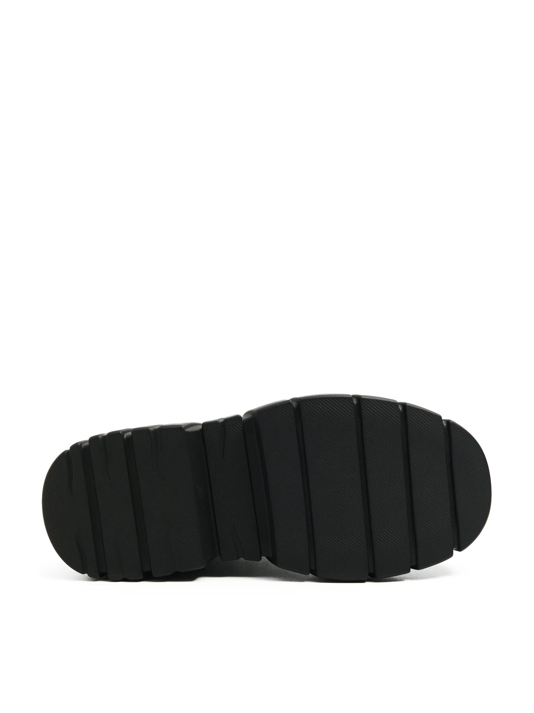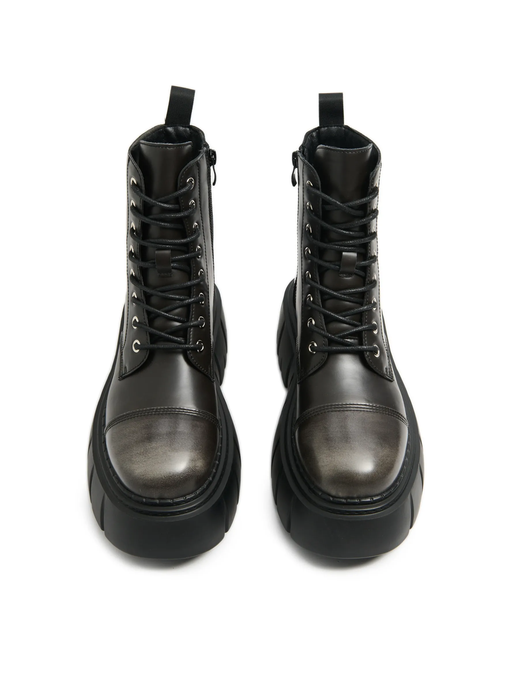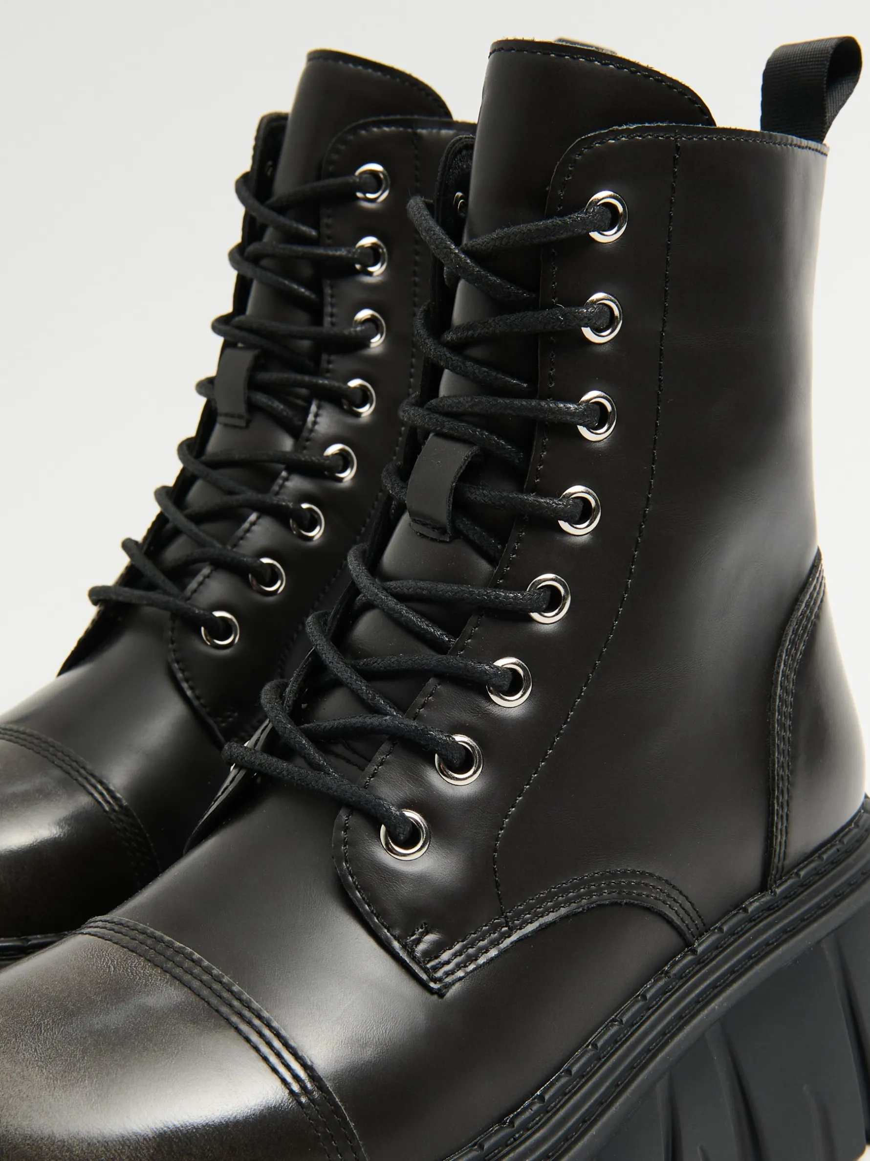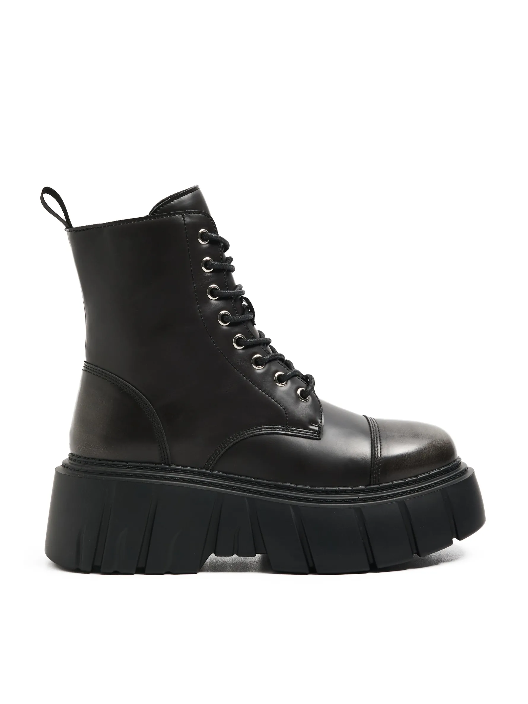 Damskie botki z wysoką cholewką, wykonane z materiału imitującego skórę. Wyposażone w solidne podeszwy idealne na sezon jesienno-zimowy. botki za kostkę cholewka z imitacji skóry traperowa, masywna podeszwa wiązane na czarne sznurowadła metalowe detale wygodny uchwyt do wkładania i zdejmowania butów nosek wykończony materiałem z beżowymi przetarciami