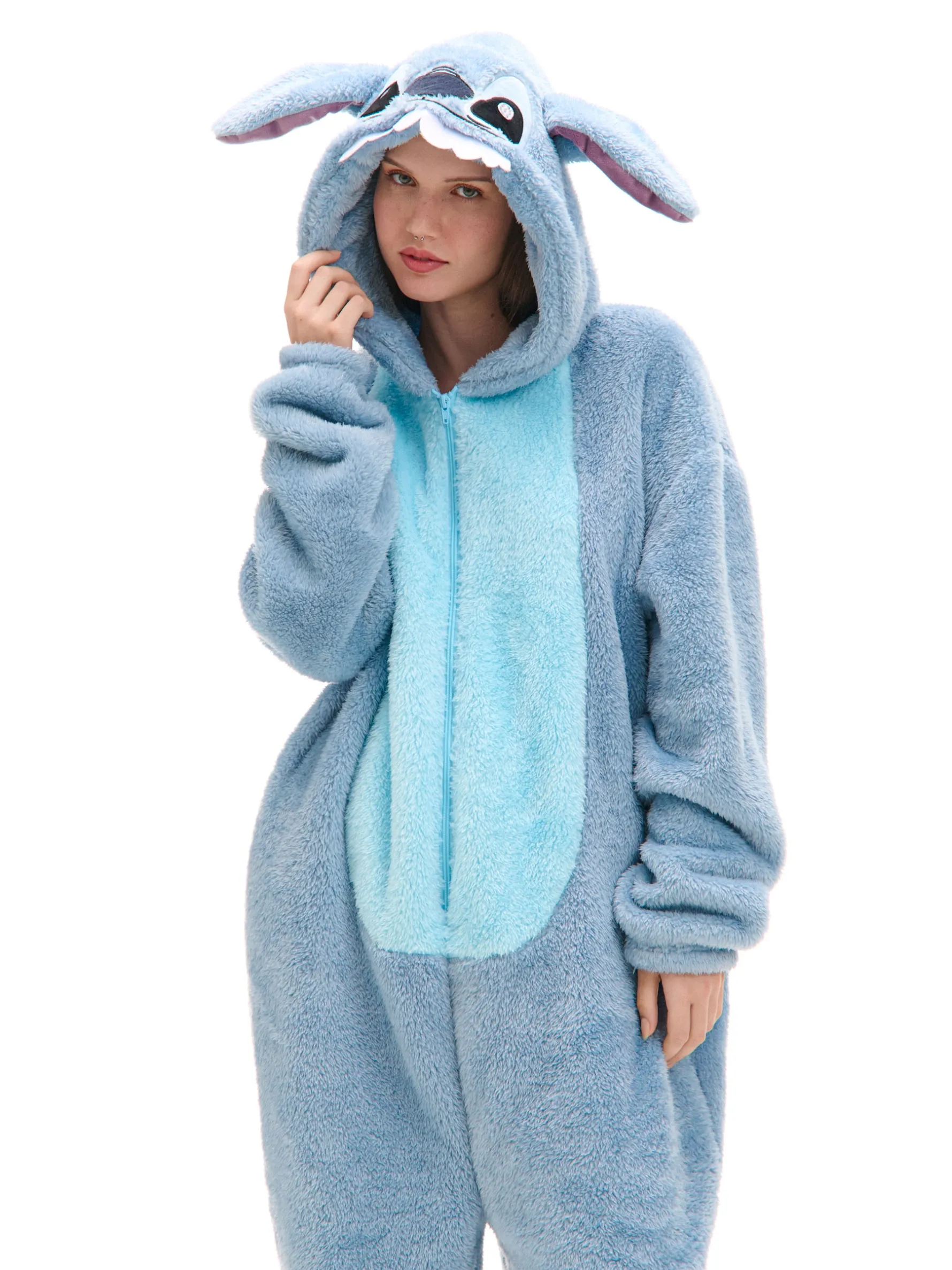 Piżama jednoczęściowa typu onesie uszyta z przyjemnego w dotyku pluszowego materiału w kolorze niebieskim. Na całości bajkowy motyw z serii Disneya „Lilo & Stitch”. Stitch nie zły! Stitch mechaty! uszyta z miękkiego, pluszowego materiału swobodny, luźny krój kaptur z uszami długie rękawy wykończone ściągaczami długa nogawka zakończona ściągaczem ozdobne naszywki motyw z bajki Disneya Tworzy zestaw z modelem: 734AU-MLC . © Disney, ©Disney / Pixar, © Disney Based on the „Winnie the Pooh” works by A. A. Milne and E. H. Shepard