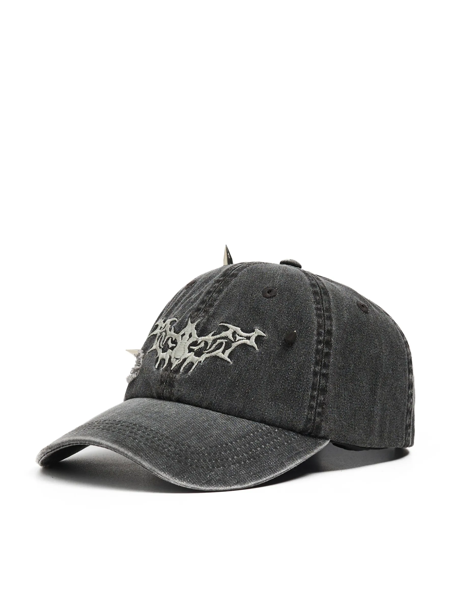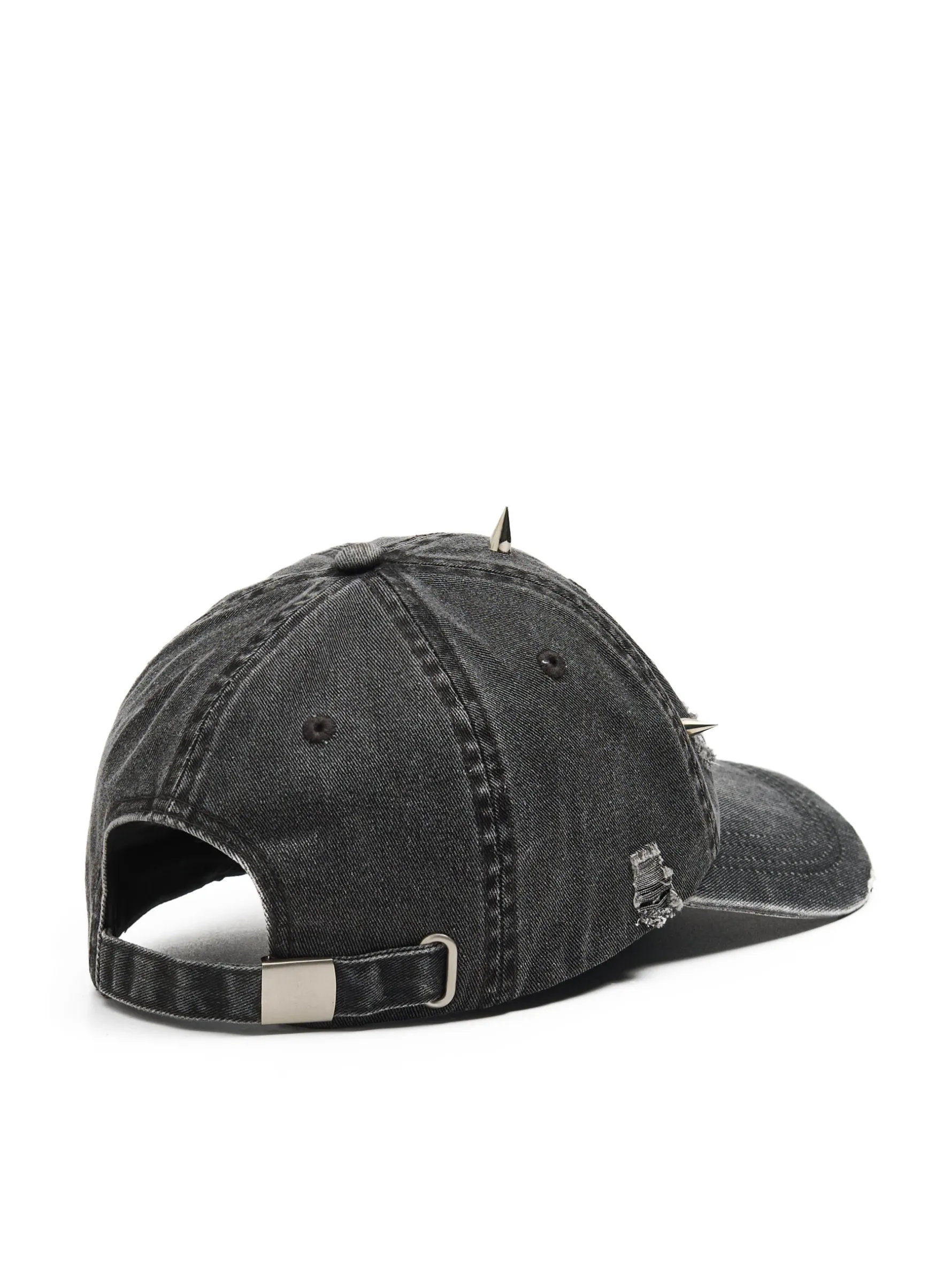 Damska czapka z daszkiem, uszyta z bawełny w szarym kolorze z efektem sprania. Dekoracją są metalowe ćwieki, przetarcia, postrzępienia i ozdobny haft na przodzie. 100% bawełny dół z regulacją obwodu efekt sprania na całości ozdobne przetarcia i postrzępienia na środku dekoracyjny haft metalowe detale