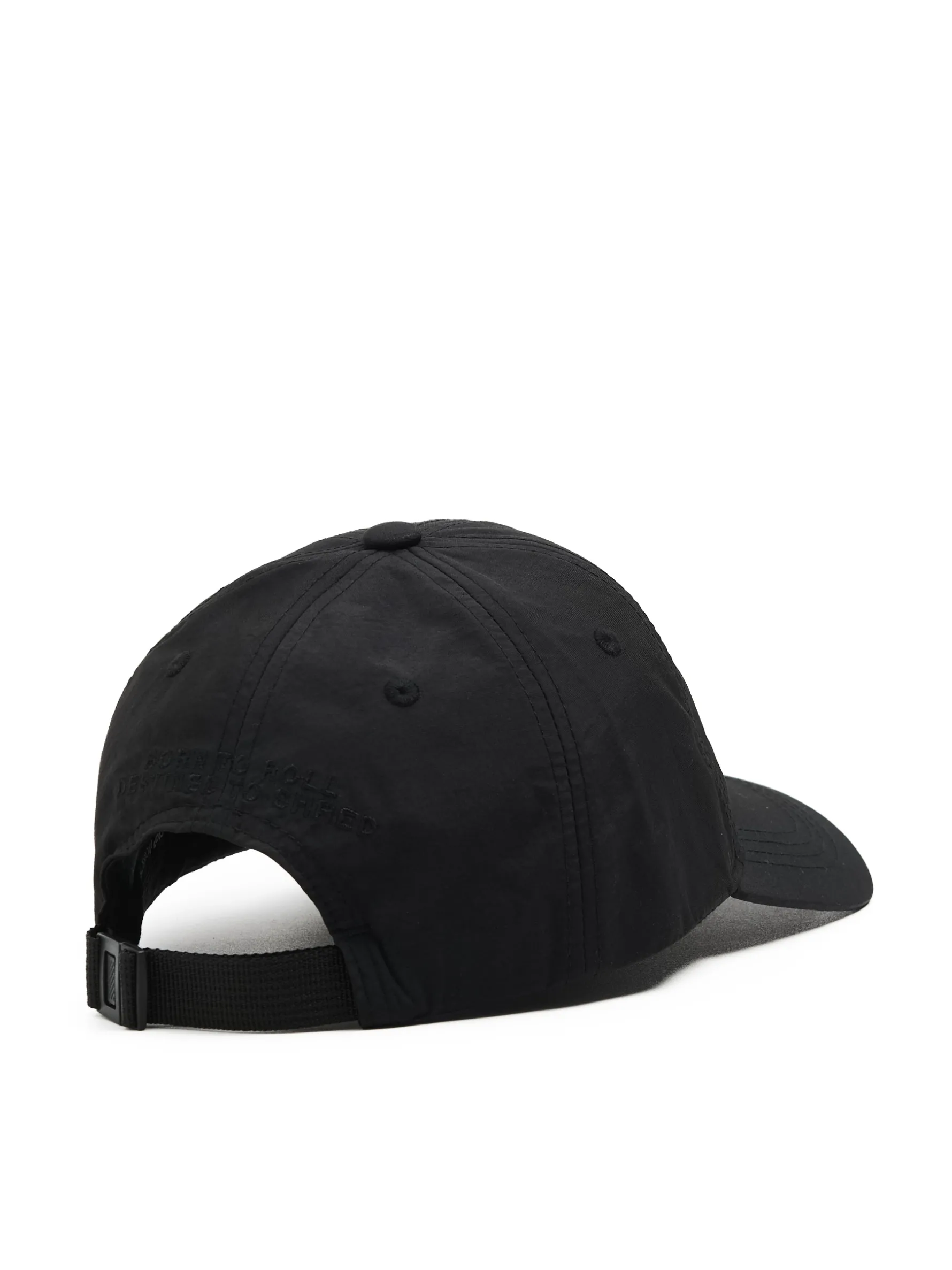 Czarna męska czapka z daszkiem, uszyta z gładkiej tkaniny. profilowany daszek z przodu niewielki streetwearowy haft z tyłu wyhaftowany napis „BORN TO ROLL, DESTINED TO SHRED” możliwość regulacji obwodu za pomocą paska z klamrą