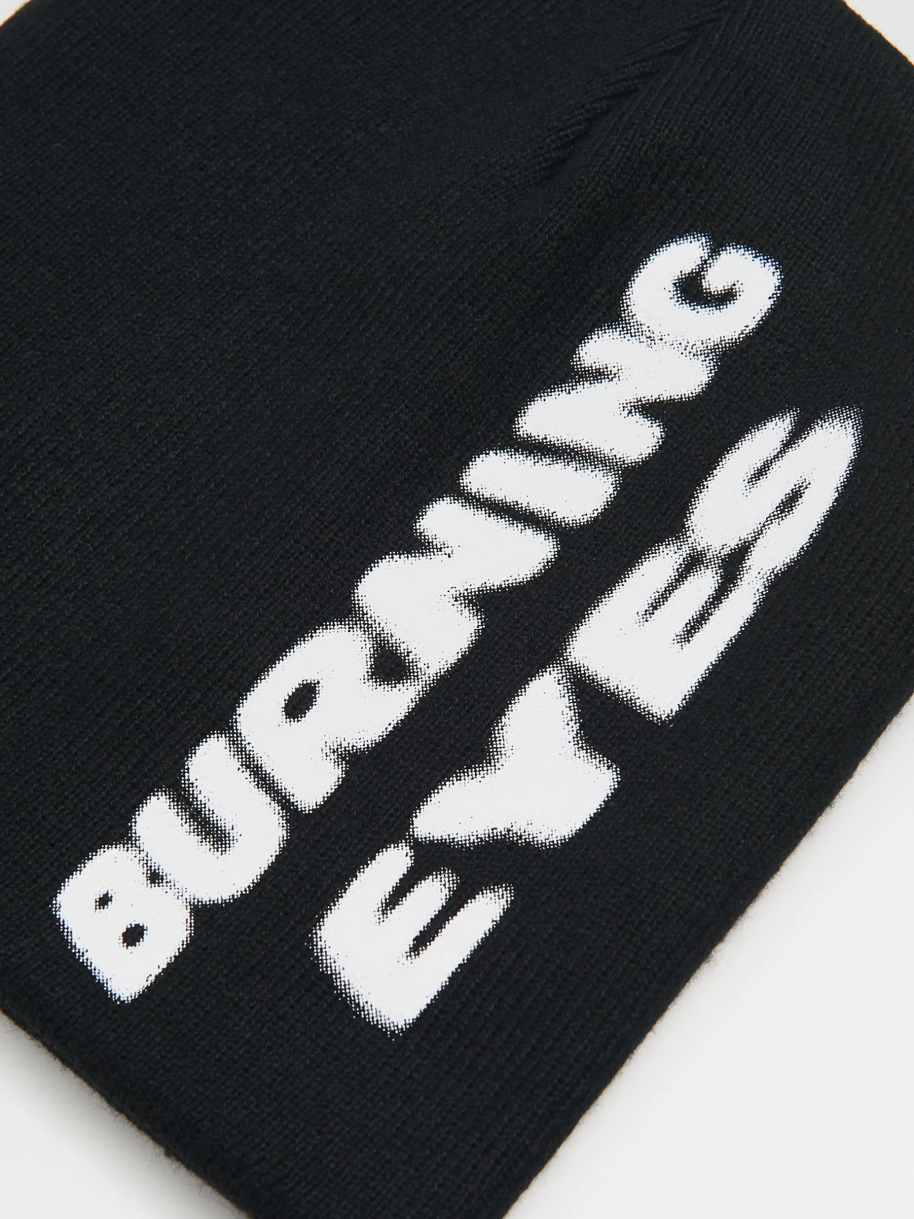 Gładka czarna czapka z dzianiny, idealna na zimę. Z przodu nadruk z napisem „BURNING EYES”.