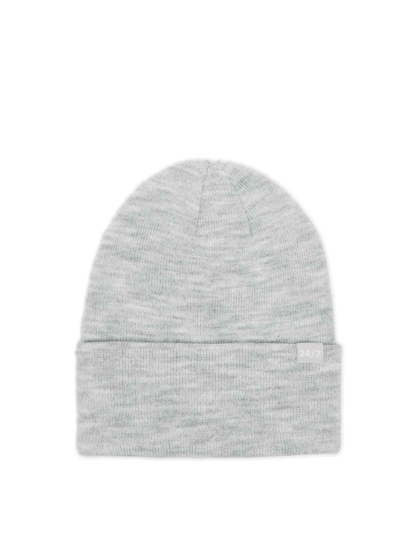 Prosta damska czapka typu beanie, uszyta z jasnoszarej dzianiny. Z przodu niewielka ozdobna metka.