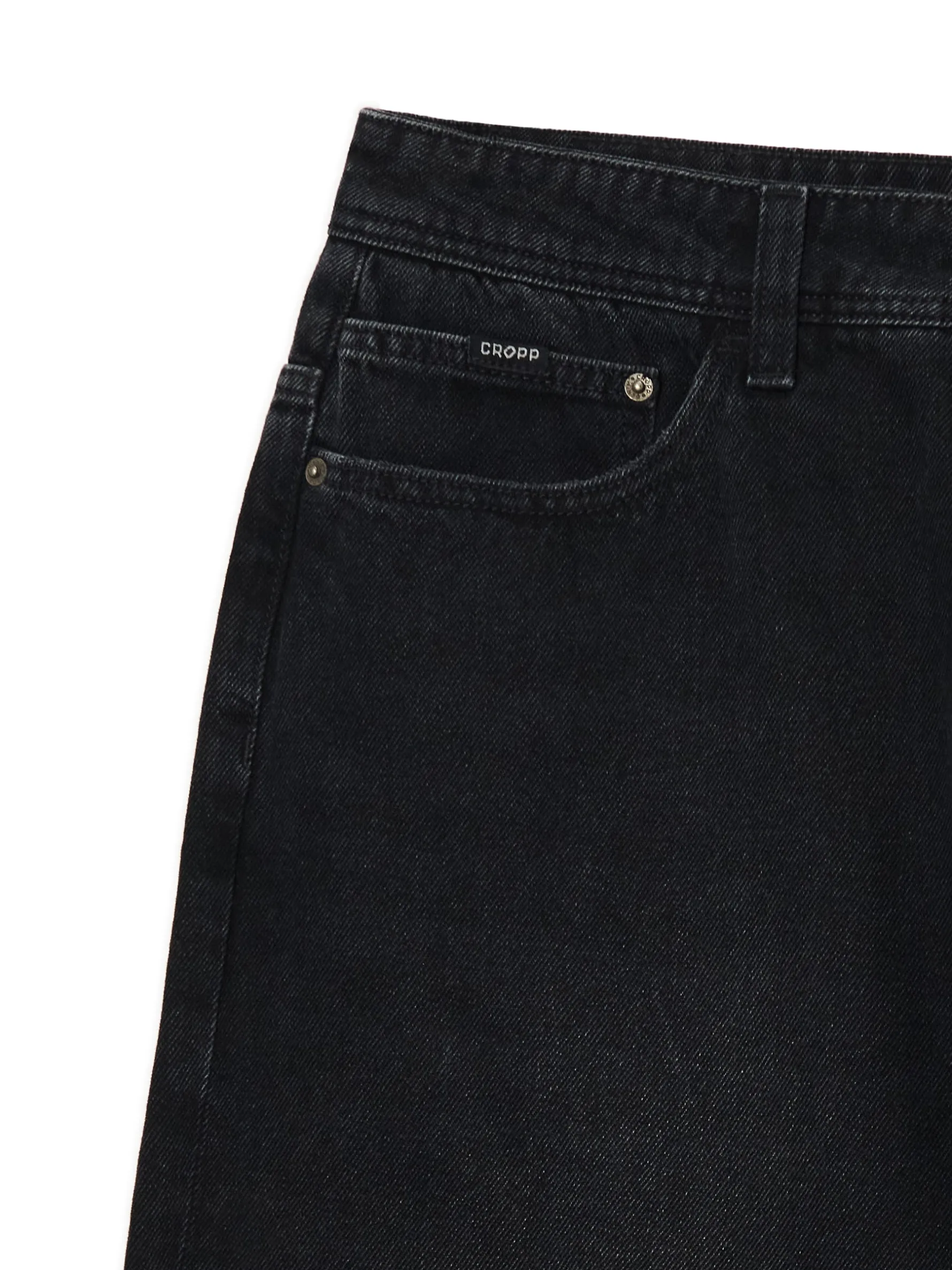 Spodnie męskie uszyte z denimowej tkaniny w kolorze czarnym z efektem sprania. Ten casual z ozdobnymi postrzępieniami będzie świetnym dodatkiem do Twoich stylizacji. 100% bawełny obszerny krój super baggy zapięcie na zamek i guzik długie, bardzo szerokie nogawki pięć kieszeni szlufki na pasek ozdobne postrzępienia efekt sprania na całości