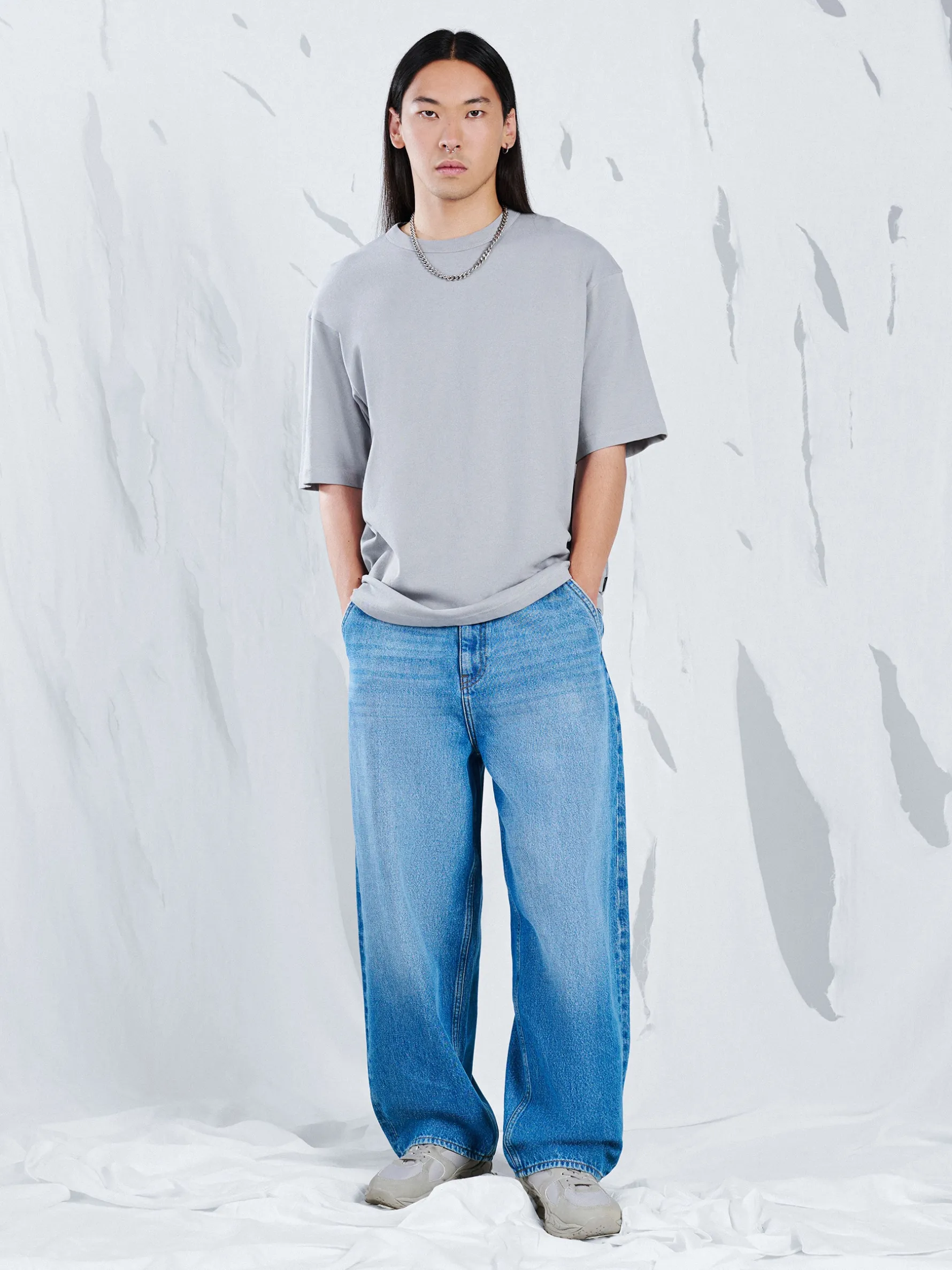 Denimowe męskie spodnie o kroju skater, uszyte z bawełnianej tkaniny. Fason charakteryzuje się mocno obniżonym krokiem i bardzo szeroką nogawką dla zapewnienia komfortu noszenia. 100% bawełny streetowy fason skater zapięcie na suwak i guzik długie, szerokie nogawki skośne kieszenie po bokach naszywane kieszenie z tyłu efekt sprania na całości
