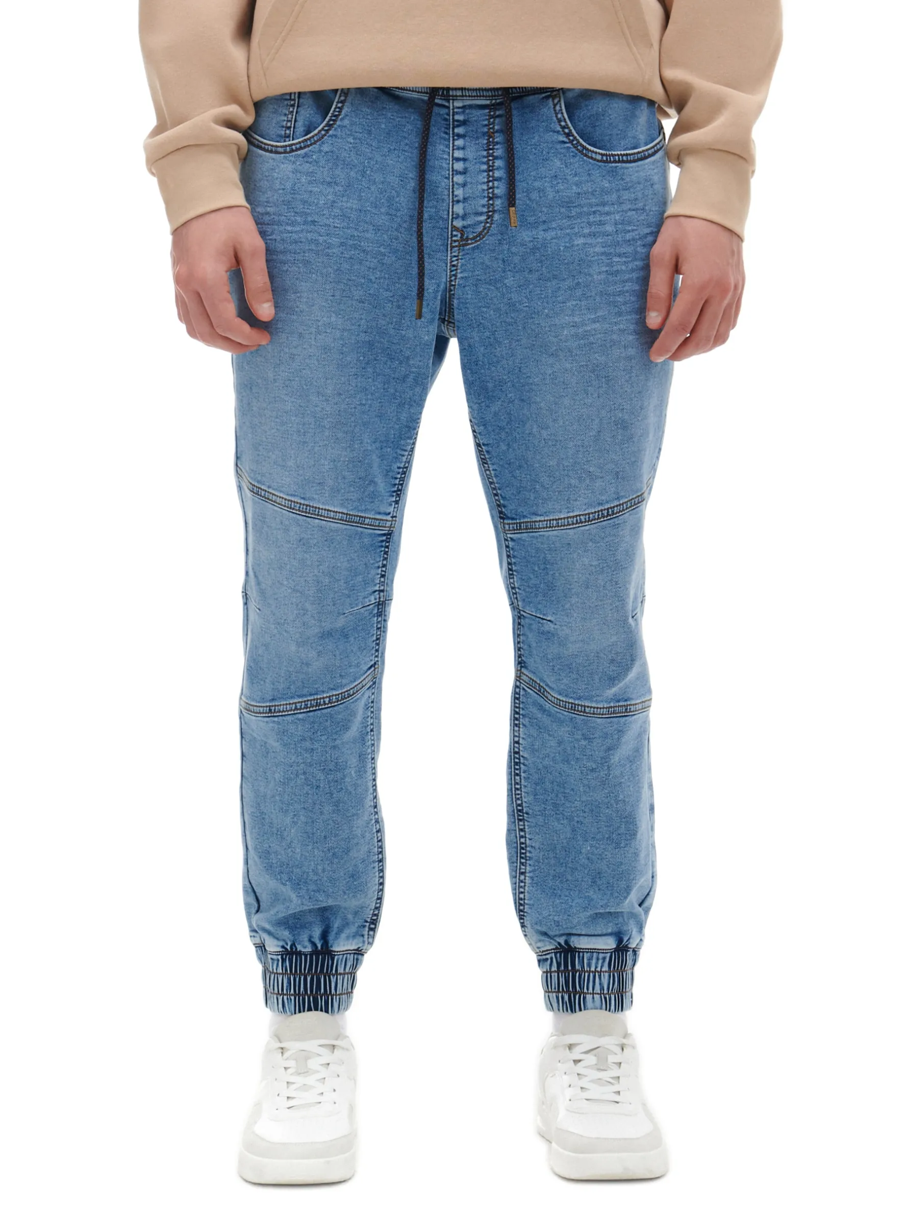 Męskie spodnie jeansowe typu jogger, uszyte z miękkiej, elastycznej tkaniny o wysokiej zawartości bawełny. w pasie gumka i sznurek do regulacji 5 kieszeni nogawka ze ściągaczem i technicznymi cięciami dostęone inne warianty kolorystyczne