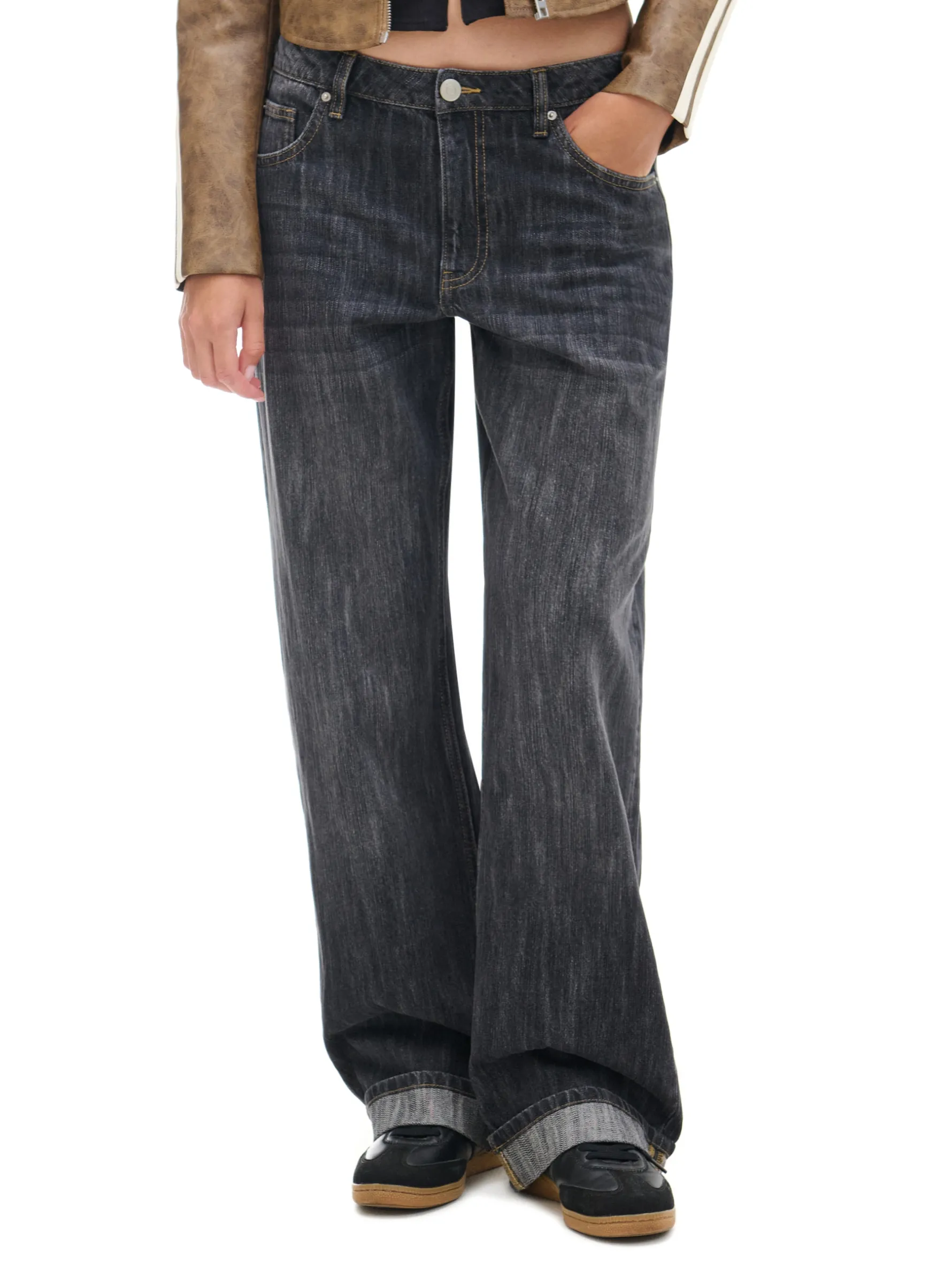 Mamy dla Ciebie wyjątkowe damskie denimowe spodnie baggy z podwiniętymi końcówkami nogawek. Delikatnie obniżony stan i efekt sprania nadaje im oryginalny oldschoolowy styl. 100% bawełny obszerny krój baggy delikatnie obniżony stan zapięcie na zamek i guzik długie, szerokie nogawki podwinięte nogawki cztery kieszenie jedna mała kieszeń na drobniaki Wzrost modelki: 177 cm