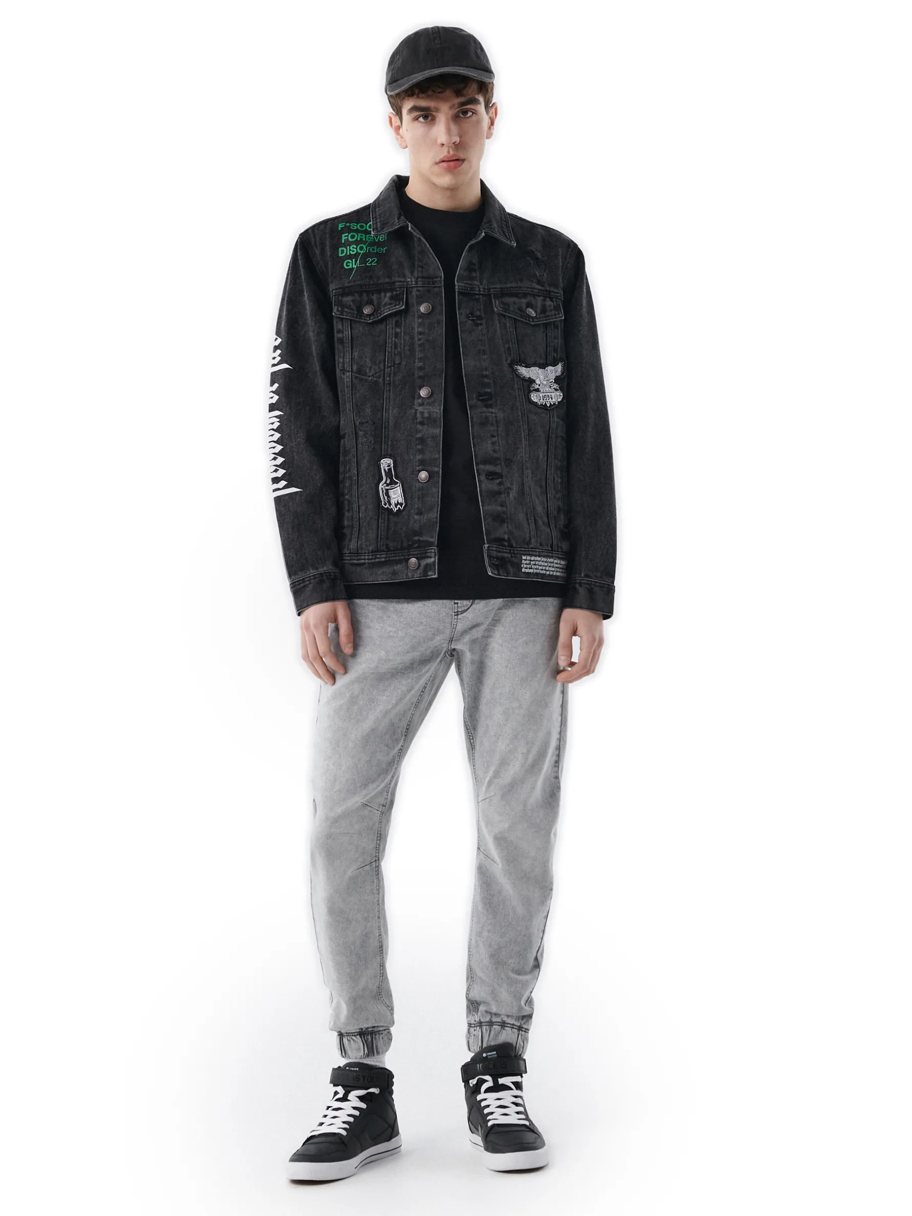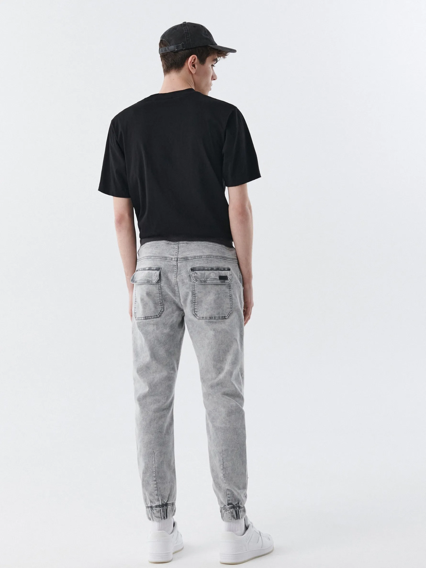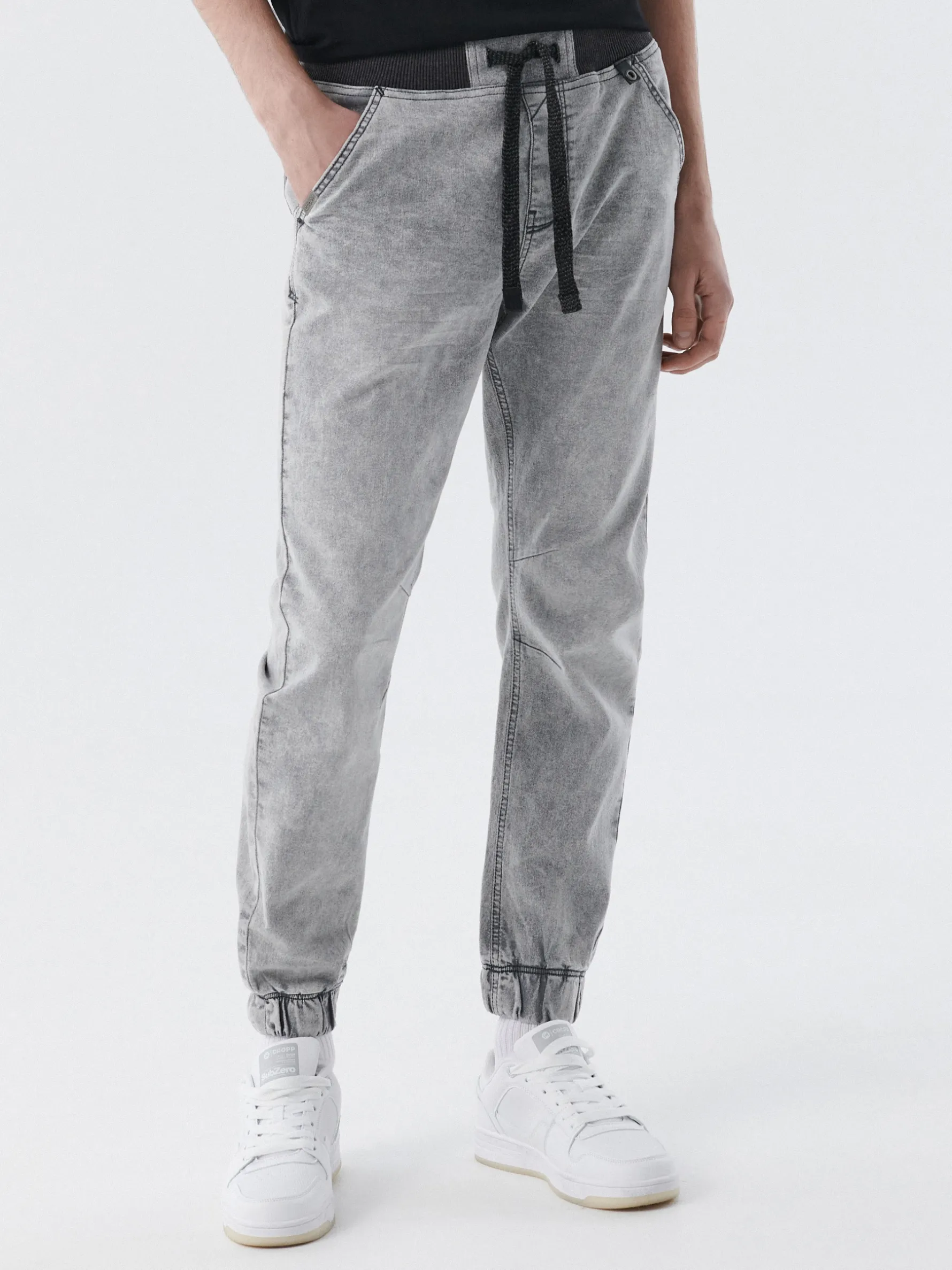 Męskie spodnie jeansowe, uszyte z tkaniny o wysokiej zawartości bawełny. wygodny krój jogger regularny stan elastyczna gumka w pasie i sznurek do regulacji, pas wykonany z miękkiego, dzianinowego ściągacza długa, wąska nogawka zakończona gumką cztery kieszenie, w tym dwie zapinane na zatrzaski mocny efekt sprania dostępne w innych kolorach Model prezentuje produkt w rozmiarze: 32/32 Wzrost modela: 187 cm