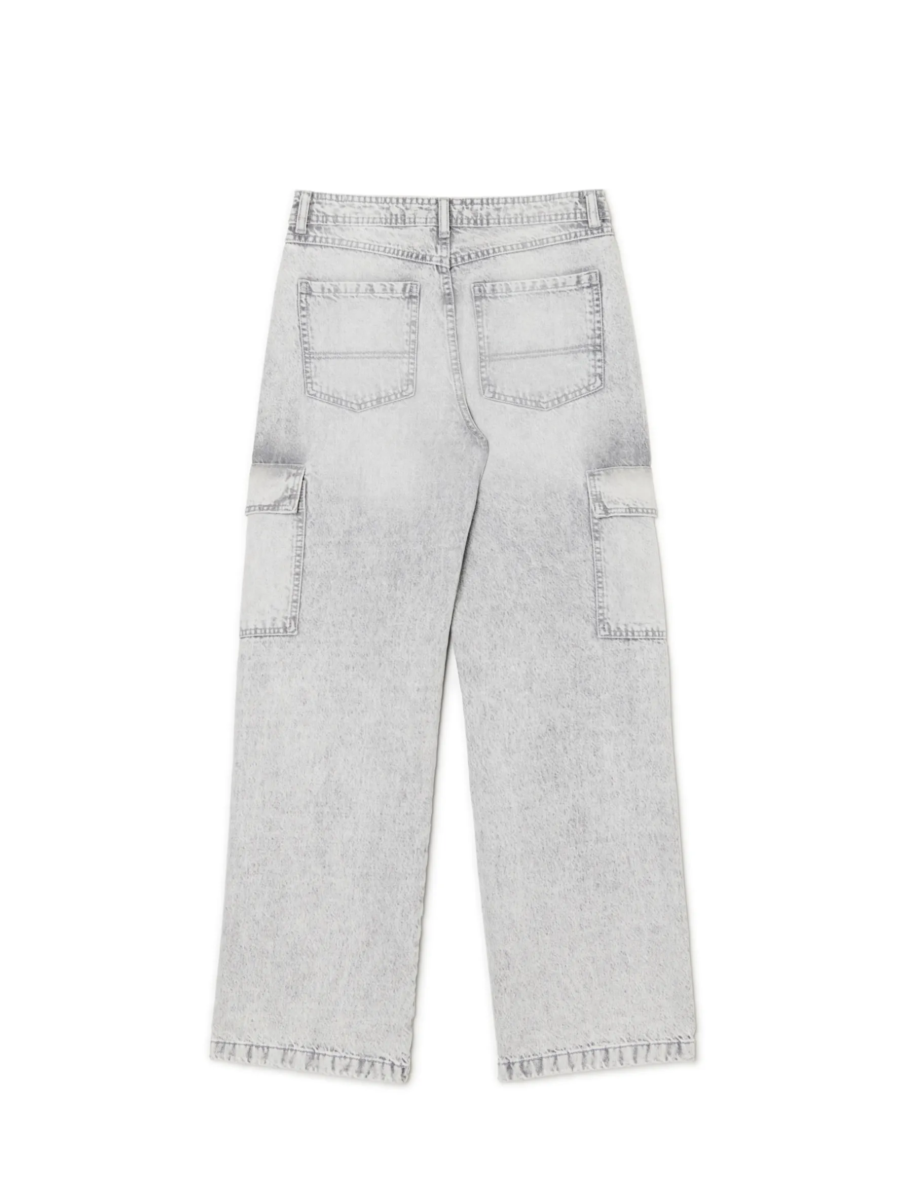 Damskie spodnie jeansowe uszyte z bawełnianej tkaniny. Szerokie nogawki, praktyczne kieszenie i szlufki blisko siebie – praktyczne rozwiązanie na pasek lub zmęczone ręce po całym dniu. denim o szarym odcieniu z delikatnym efektem sprania obszerny krój baggy zapięcie na zamek i guzik długie, szerokie nogawki pięć kieszeni dodatkowe kieszenie cargo na nogawkach Wzrost modelki: 177 cm
