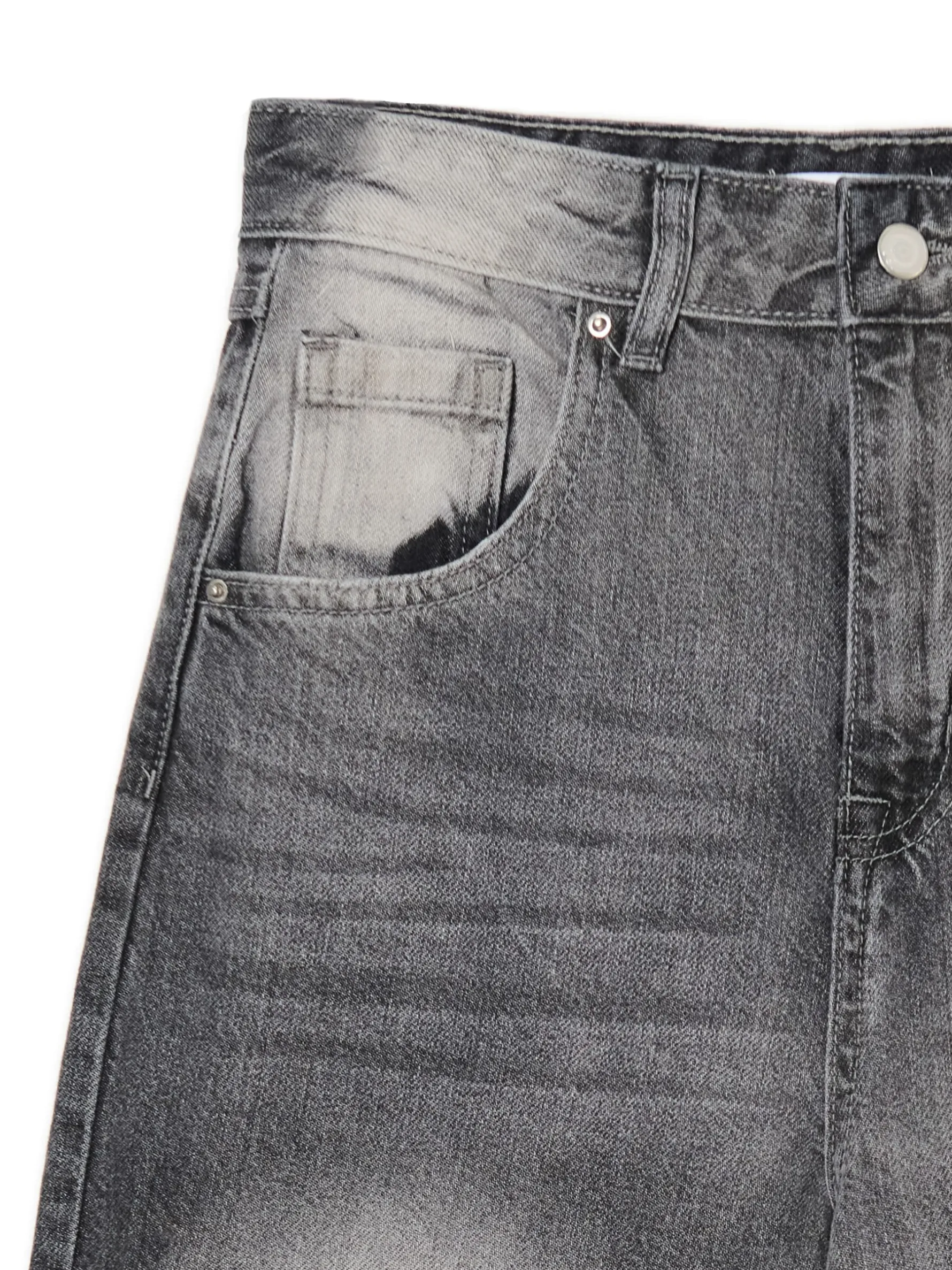 Damskie spodnie jeansowe uszyte z bawełnianej tkaniny. Szerokie nogawki, praktyczne kieszenie i wygodne zapiecie, zapewnią Ci komfort podczas każdej aktywności. denim o szarym odcieniu z delikatnym efektem sprania obszerny krój baggy zapięcie na zamek i guzik długie, szerokie nogawki pięć kieszeni Wzrost modelki: 177 cm
