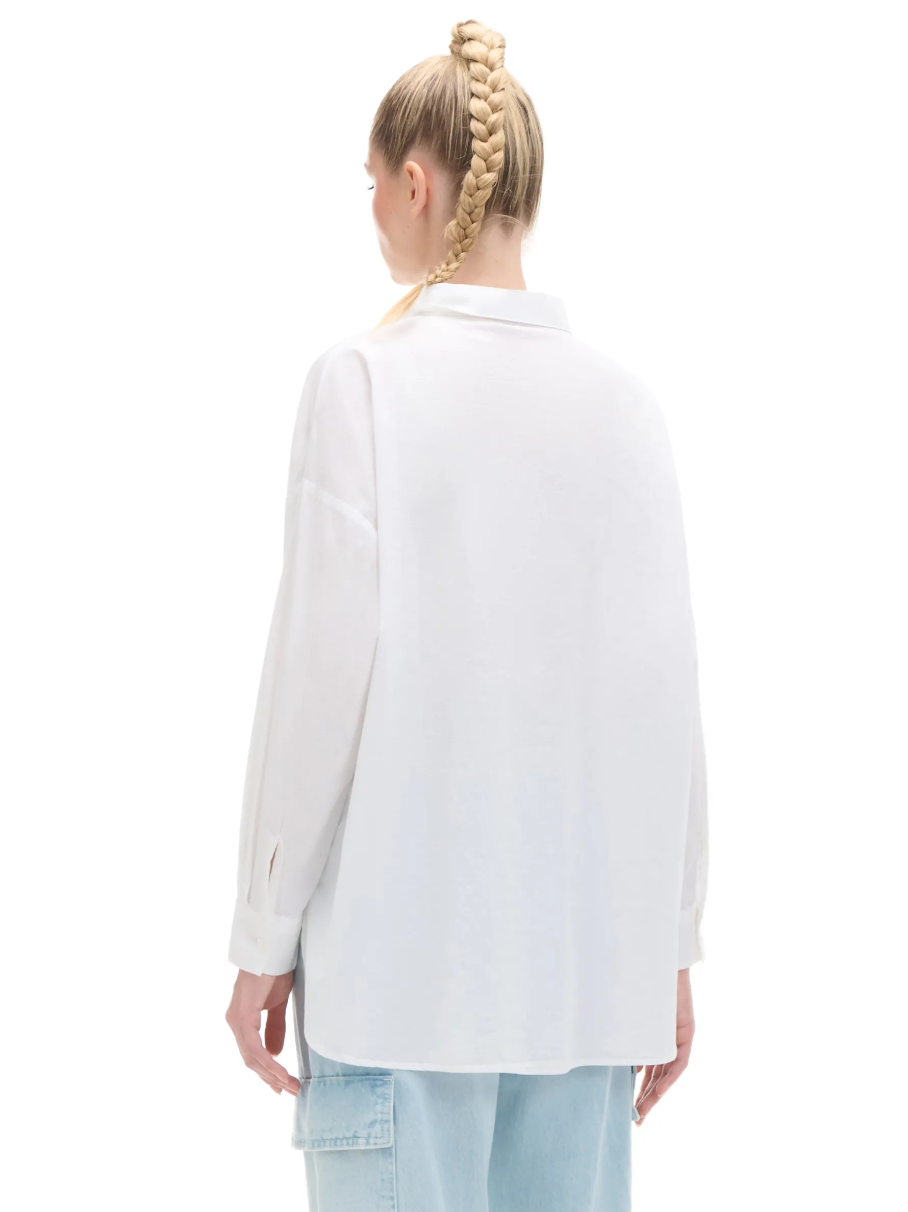 Damska koszula o kroju oversize, uszyta z bawełnianej tkaniny w kolorze białym. Idealna na eventy szkolne, pracownicze, czy na studiach. 100% bawełny krój oversize jednorzędowe zapięcie na guziki klasyczny kołnierzyk długie rękawy zakończone mankietem z guzikiem kieszeń piersiowa