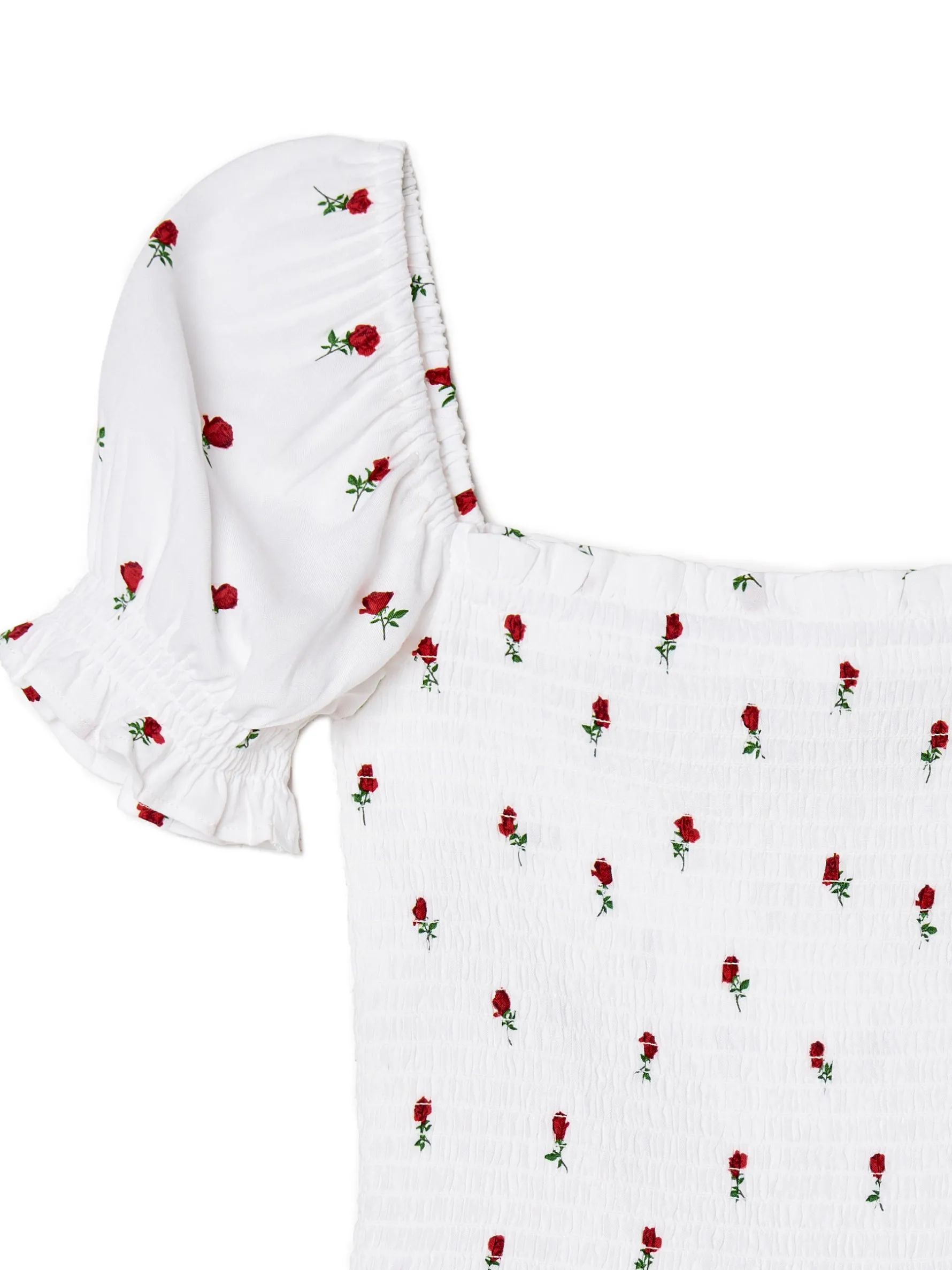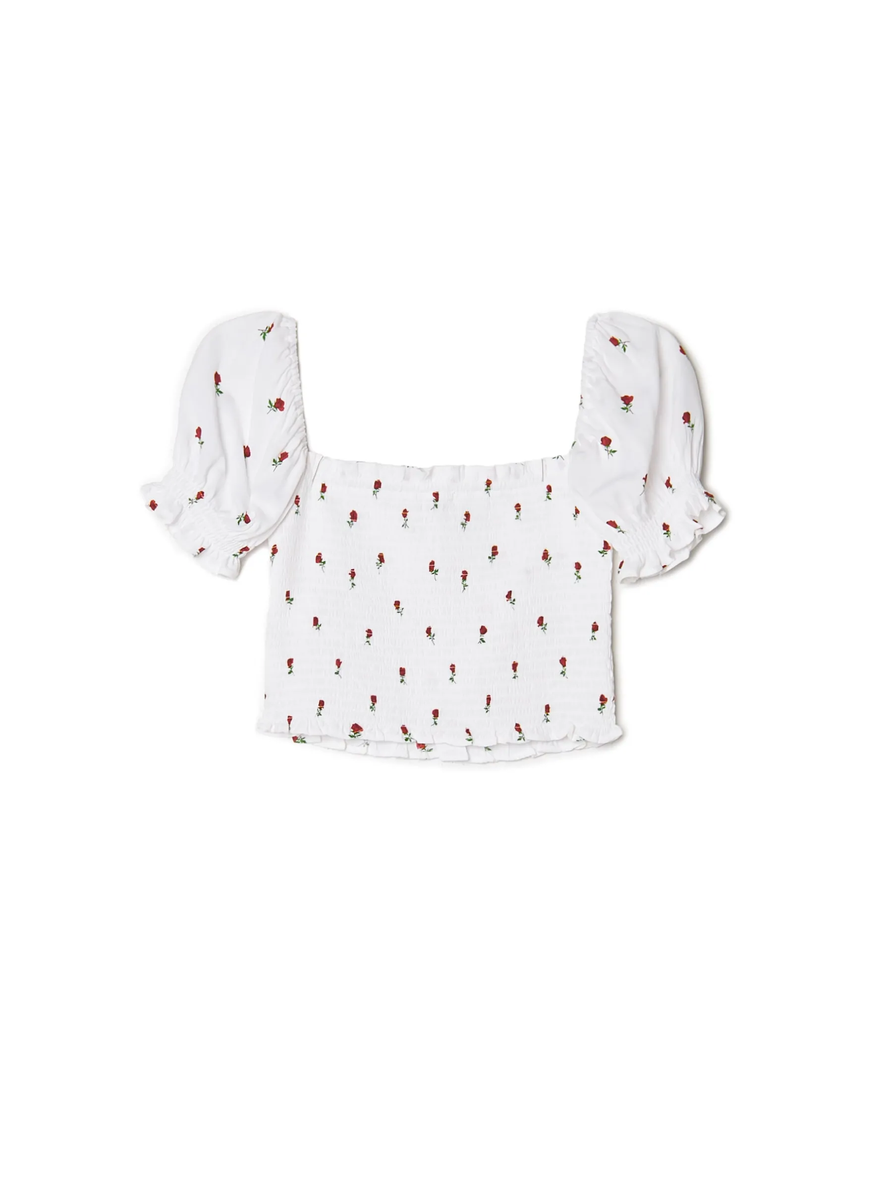 Bluzka damska typu crop top, uszyta z wiskozowej tkaniny. dopasowany krój podkreślający sylwetkę kwadratowy dekolt z przodu i z tyłu krótkie, bufiaste rękawy zakończone gumką ozdobne marszczenia dół wykończony falbaną kwiatowy wzór dostępne inne warianty kolorystyczne Wzrost modelki: 172 cm