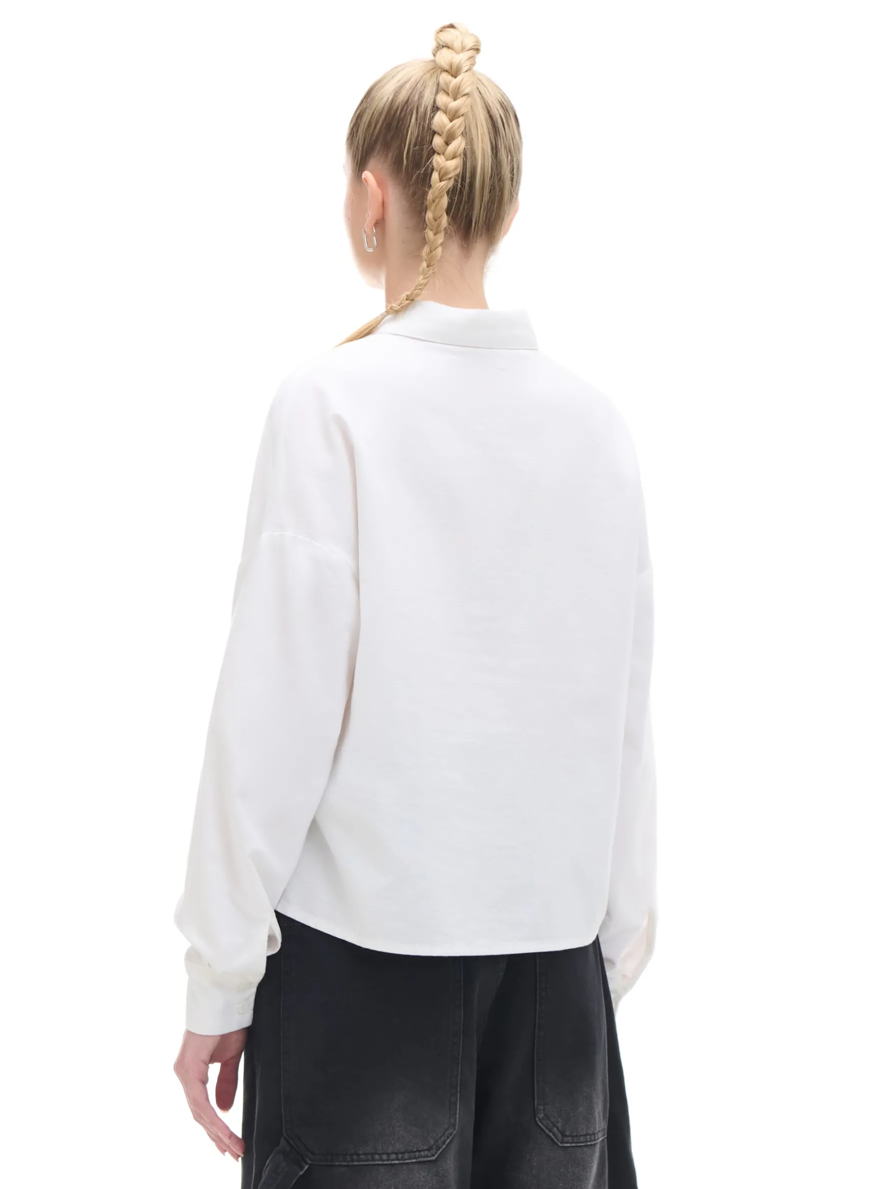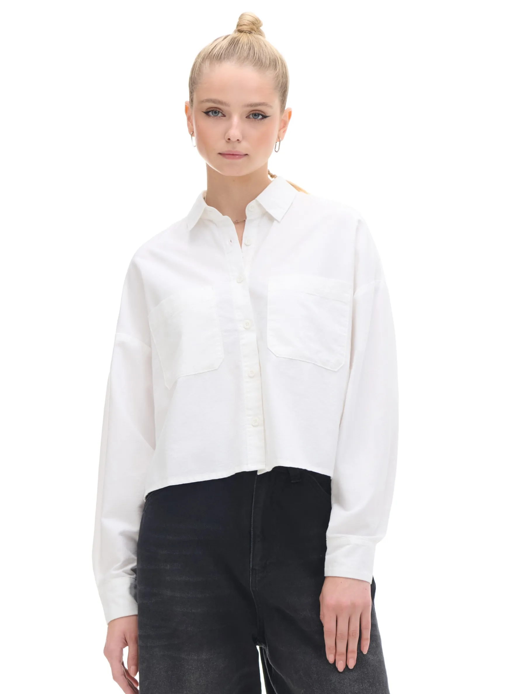 Damska koszula uszyta z bawełny w białym kolorze. Klasyk w swobodnej formie, czyli idealny dodatek do casualowych stylizacji. 100% bawełny swobodny krój zapięcie na jednorzędowe guziki klasyczny kołnierzyk długie rękawy zakończone mankietem z guzikami dwie naszywane kieszenie piersiowe ozdobne rozcięcia po bokach