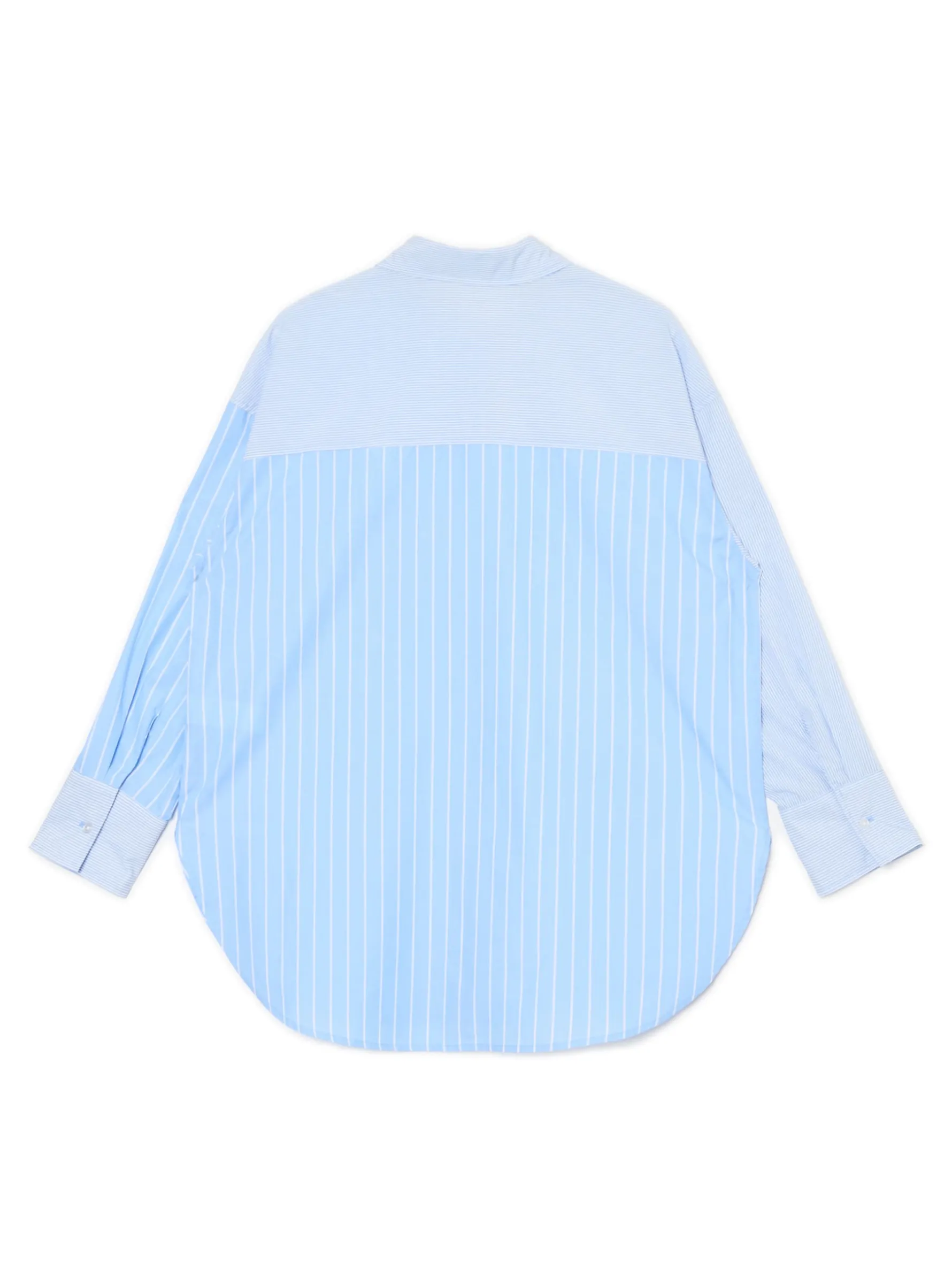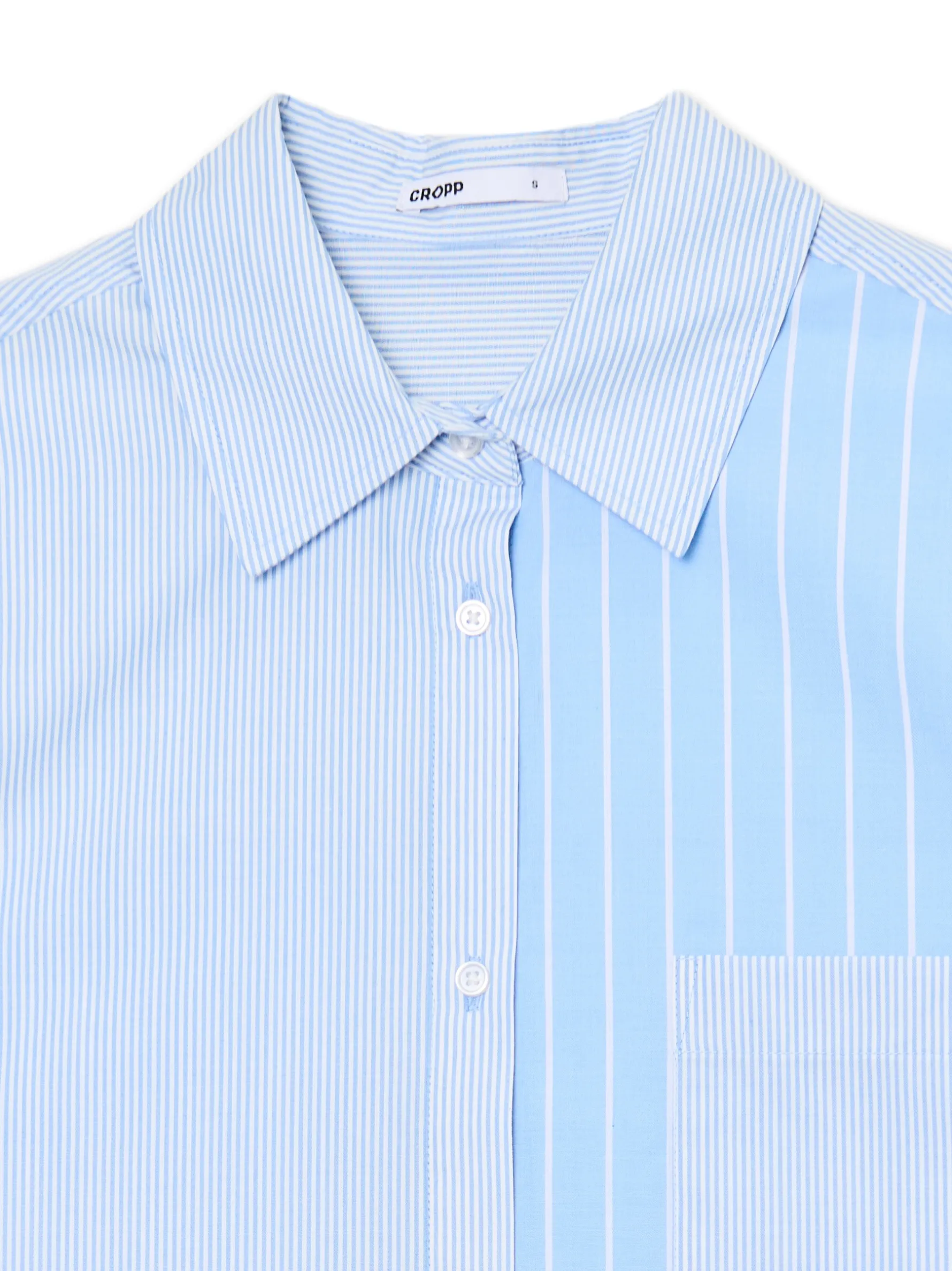 Damska koszula z długim rękawem, uszyta z lekkiej tkaniny zawierającej domieszkę bawełny. obszerny krój oversize klasyczny kołnierzyk długie rękawy z mankietami zapinanymi na guzik na piersi jedna otwarta kieszonka dwa typy różne typy pasków – patchworkowy efekt