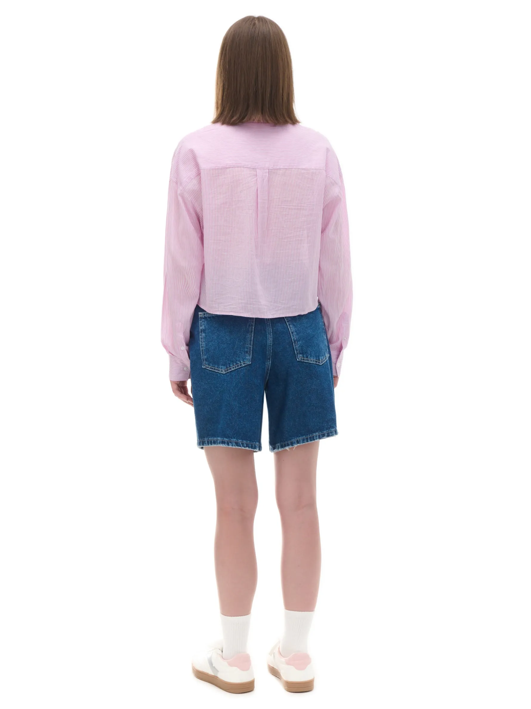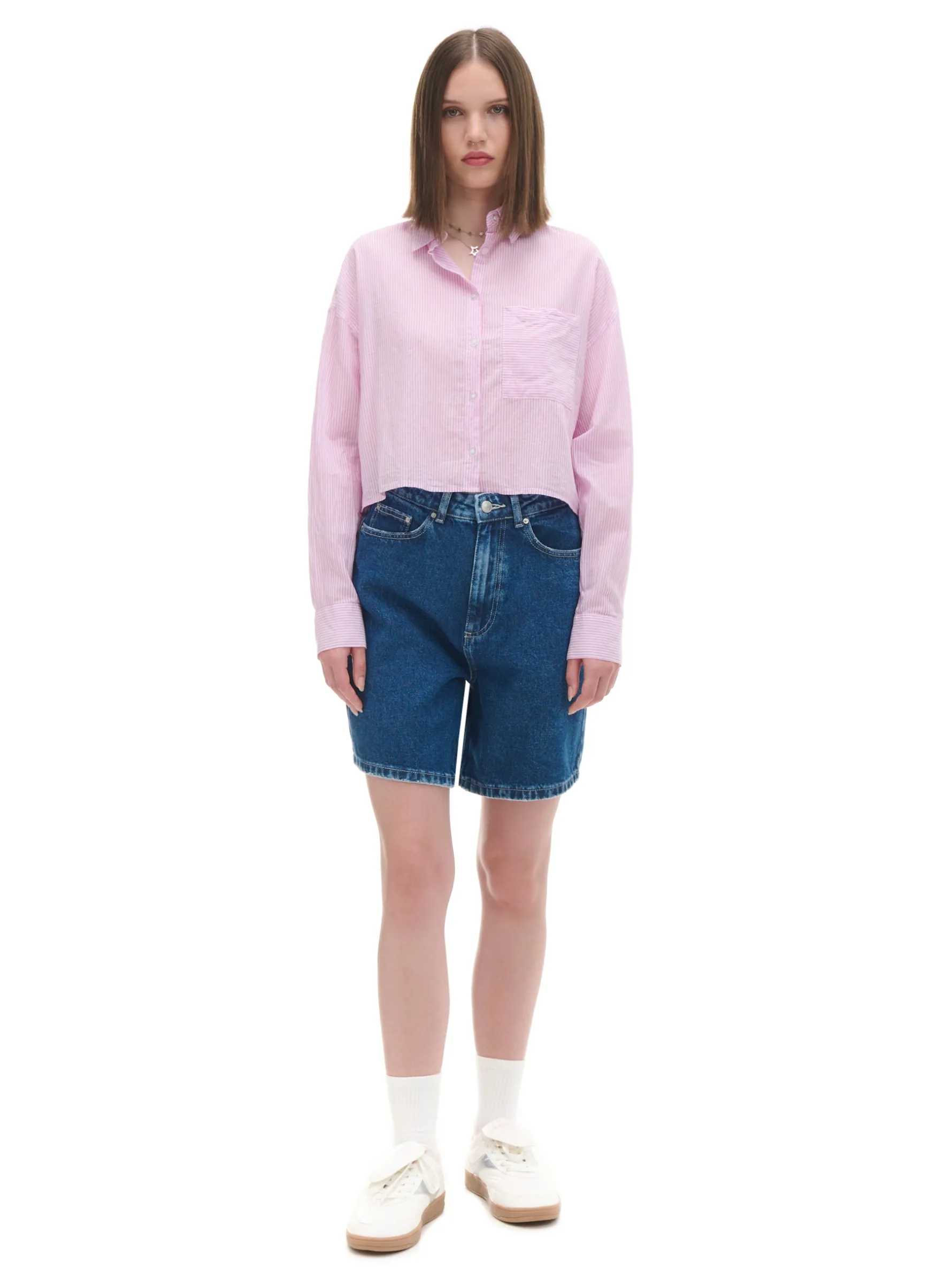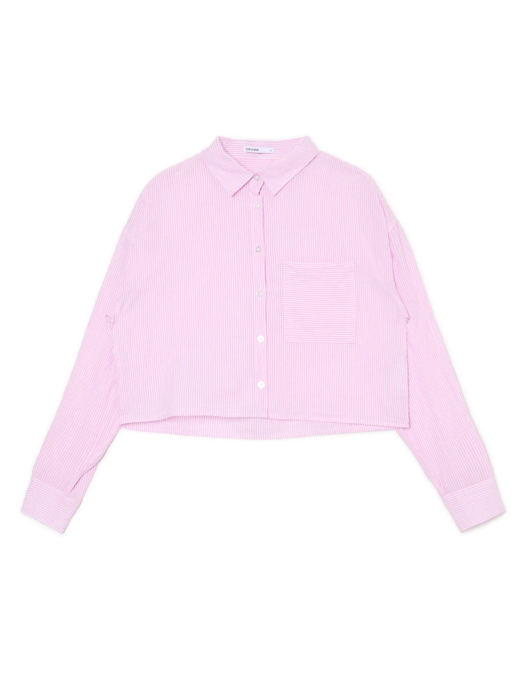 Damska koszula o krótszym kroju, uszyta z bawełny ze wzorem w paski. Dodatkowo na piersi wszyta kieszeń na drobiazgi. 100% bawełny krótki krój zapięcie na guziki na całej długości długie rękawy zakończone mankietem z guzikami klasyczny kołnierzyk kieszonka piersiowa wzór w paski na całości Wzrost modelki: 172 cm