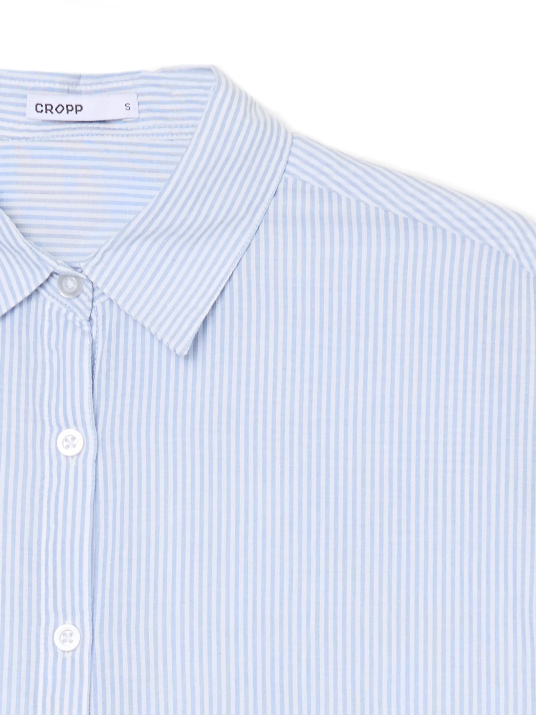 Damska koszula w kolorze niebieskim, uszyta w 100% z lekkiej bawełnianej tkaniny ze wzorem w paski. Możesz sparować ją z jeansami z wysokim stanem albo spódnicą mini – Twój wybór! obszerny, regularny krój zapięcie na guziki kołnierzyk pod szyją krótkie rękawy dwie kieszenie na piersiach wzór w paski na całości Wzrost modelki: 172 cm