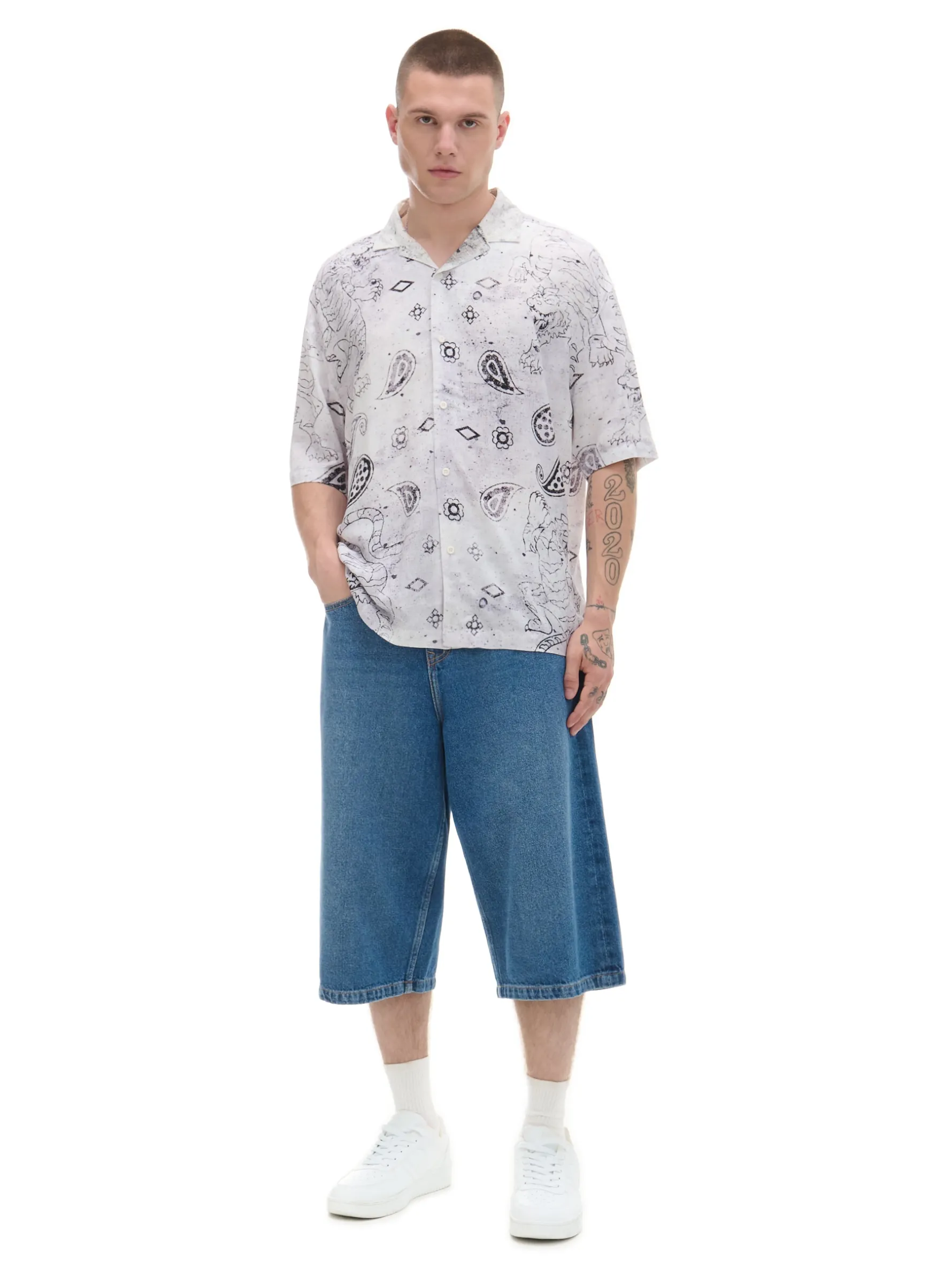 Męska biała koszula o kroju comfort, uszyta z lekkiego, wiskozowego materiału. Ozdobą jest wyjątkowy nadruk ze smokiem i elementami zgodnymi ze wzorem paisley. 100% wiskozy wygodny krój comfort jednorzędowe zapięcie na guziki kubański kołnierzyk krótkie, swobodne rękawy efektowny, malarski nadruk paisley na całości oryginalny print Model prezentuje produkt w rozmiarze M/L. Wzrost modela: 185 cm