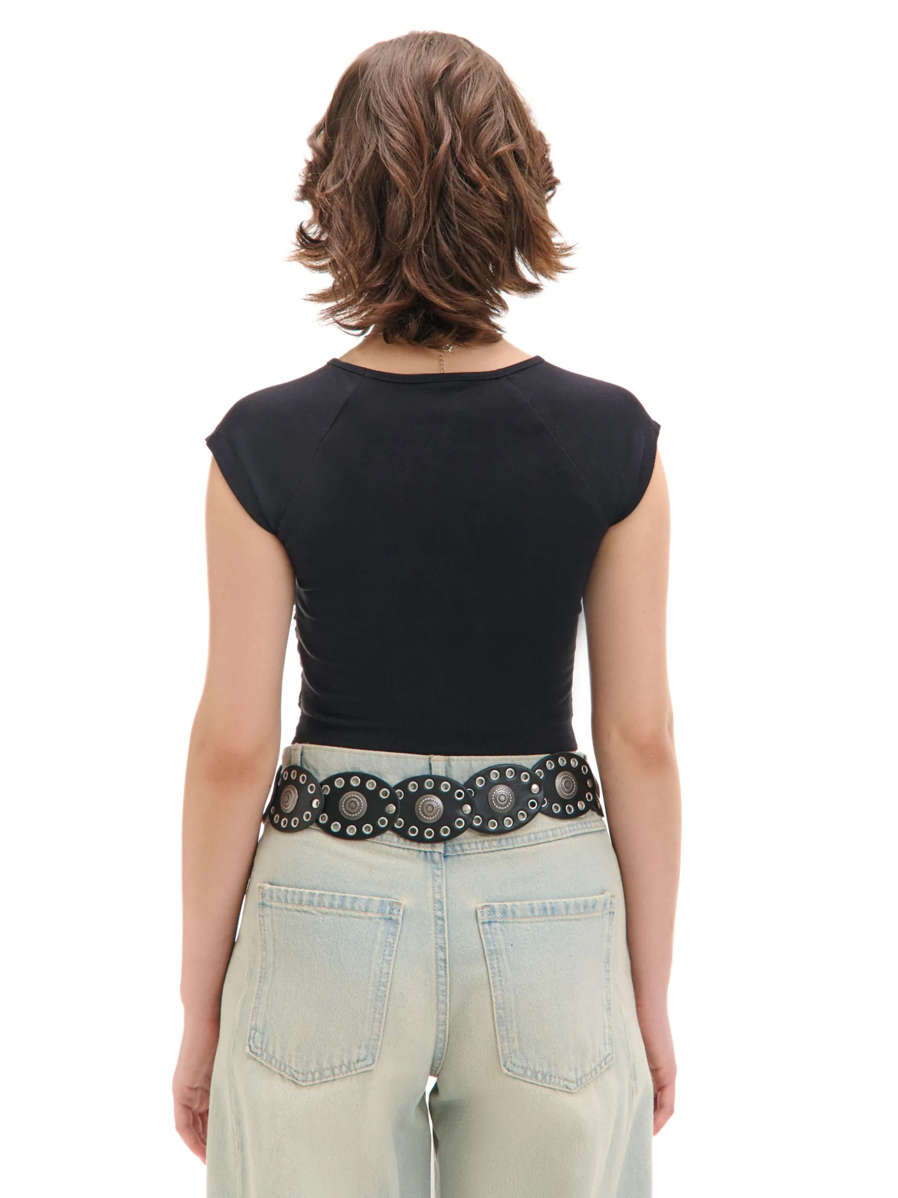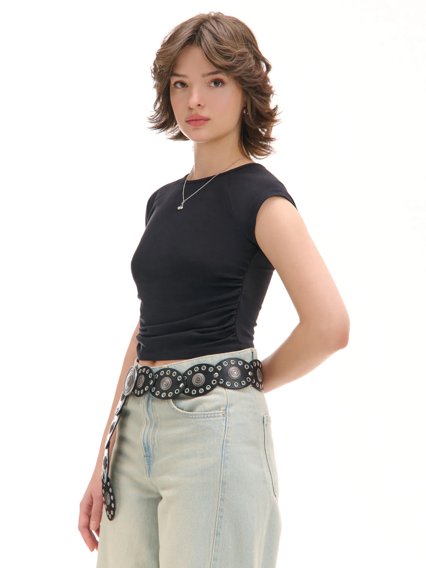 Bluzka damska z krótkimi rękawami uszyta z mieszanki dzianin w gładkim, czarnym kolorze. Klasyczny dodatek do wielu stylizacji. bawełna z dodatkiem elastycznych włókien dopasowana bluzka okrągły dekolt krótkie, ścięte rękawy lekkie marszczenia po bokach dla idealnego dopasowania materiału wokół brzucha