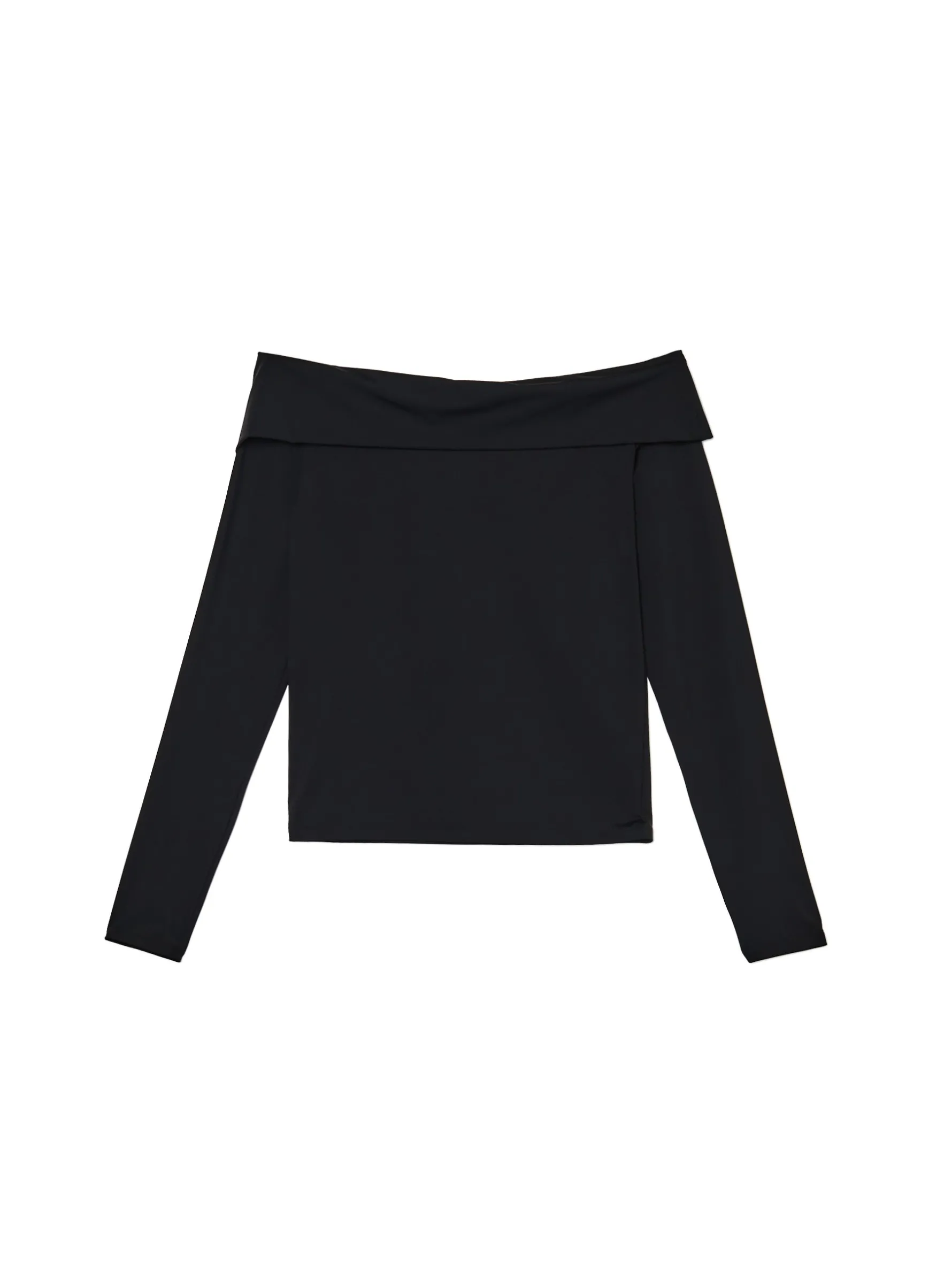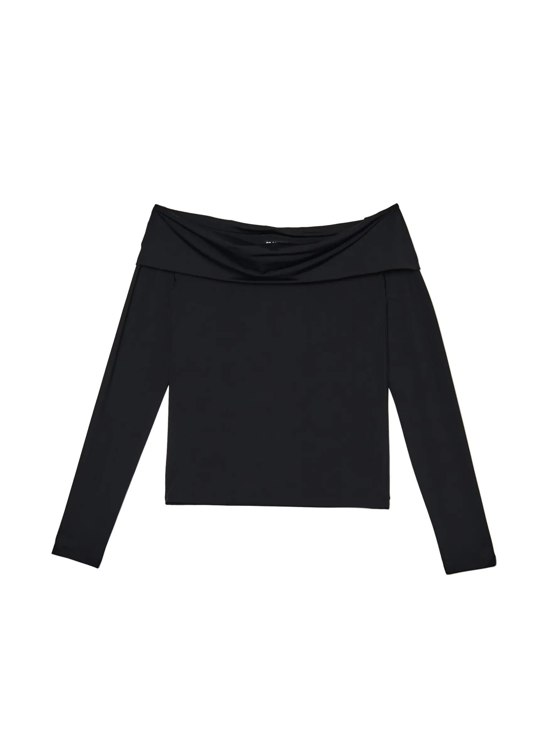 Damska bluzka typu carmen z długimi rękawami uszyta z mieszanki tkanin. Długie, wygodne rękawy i oryginalna, szeroka zakładka przy dekolcie to hity tego modelu! dzianina z dodatkiem elastycznych włókien dopasowany krój podkreślający sylwetkę dekolt typu carmen długie rękawy z obniżoną linią ramion wyraźnie zaznaczone ramiona szalowy kołnierz