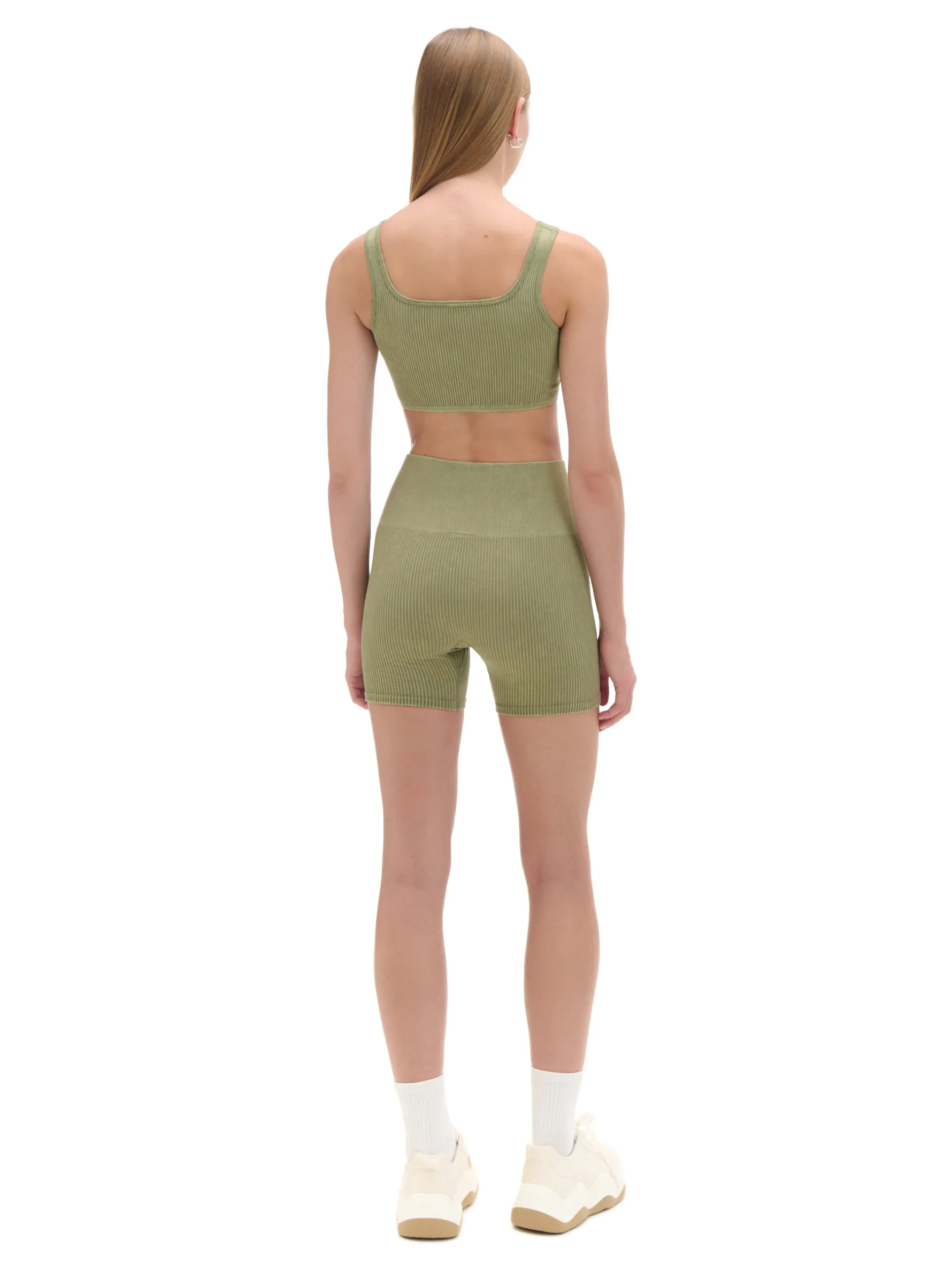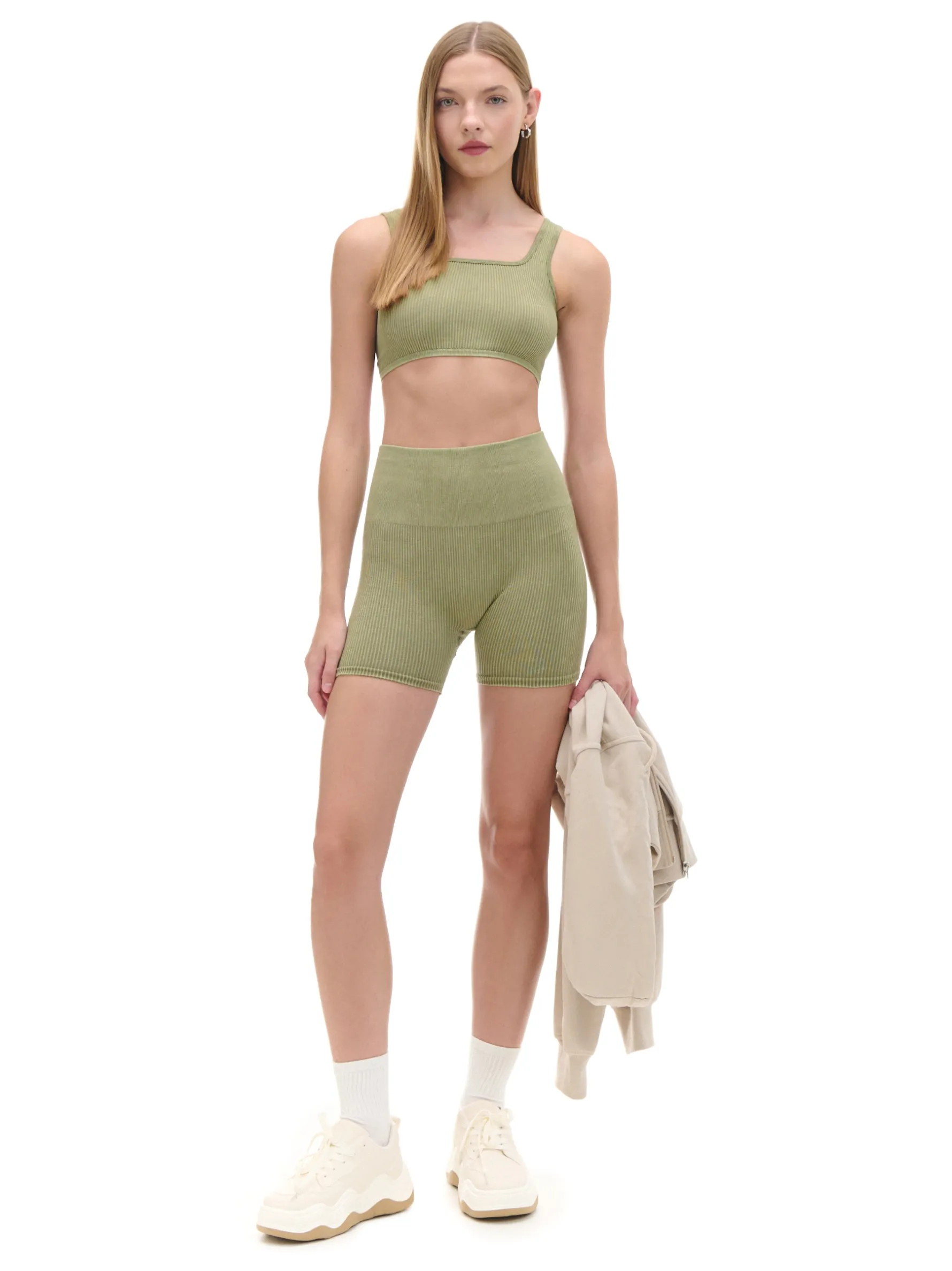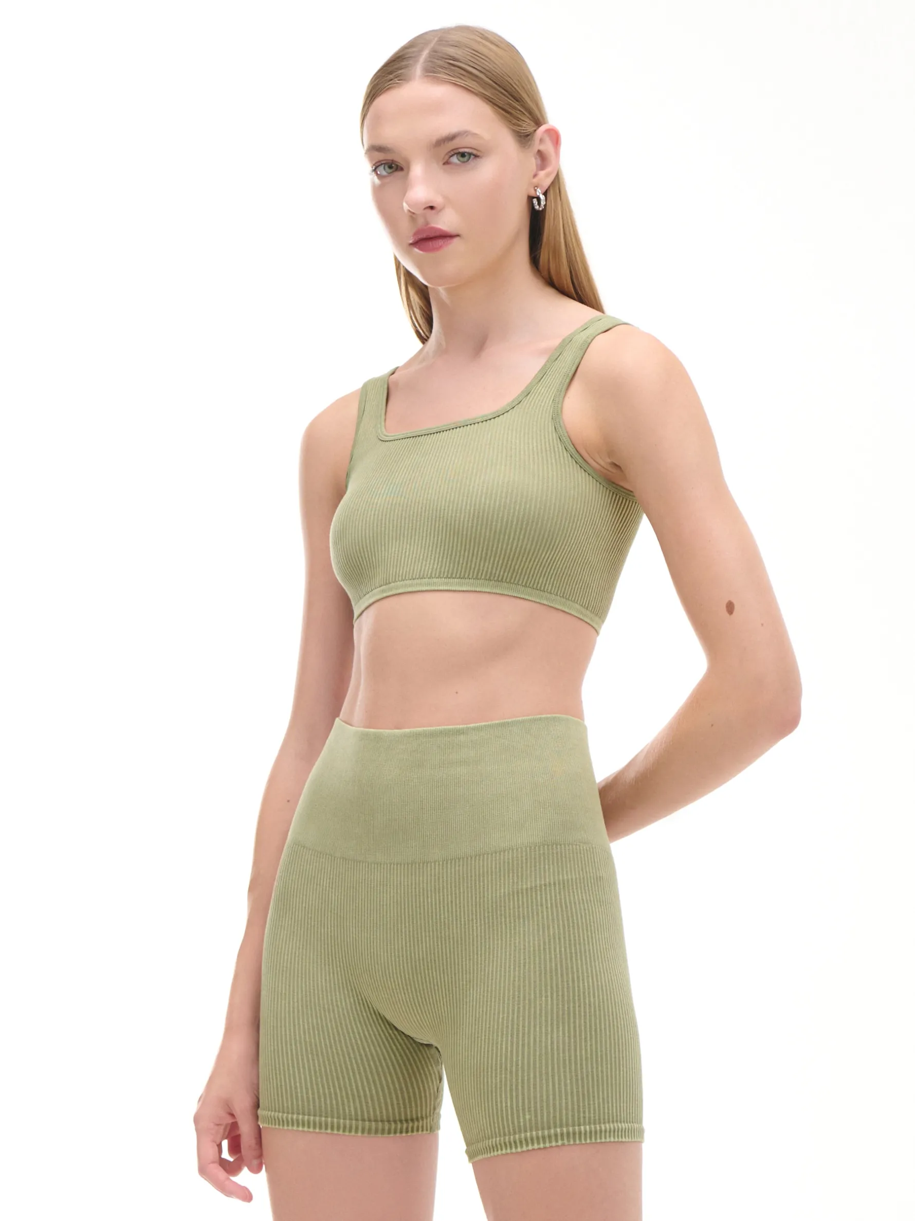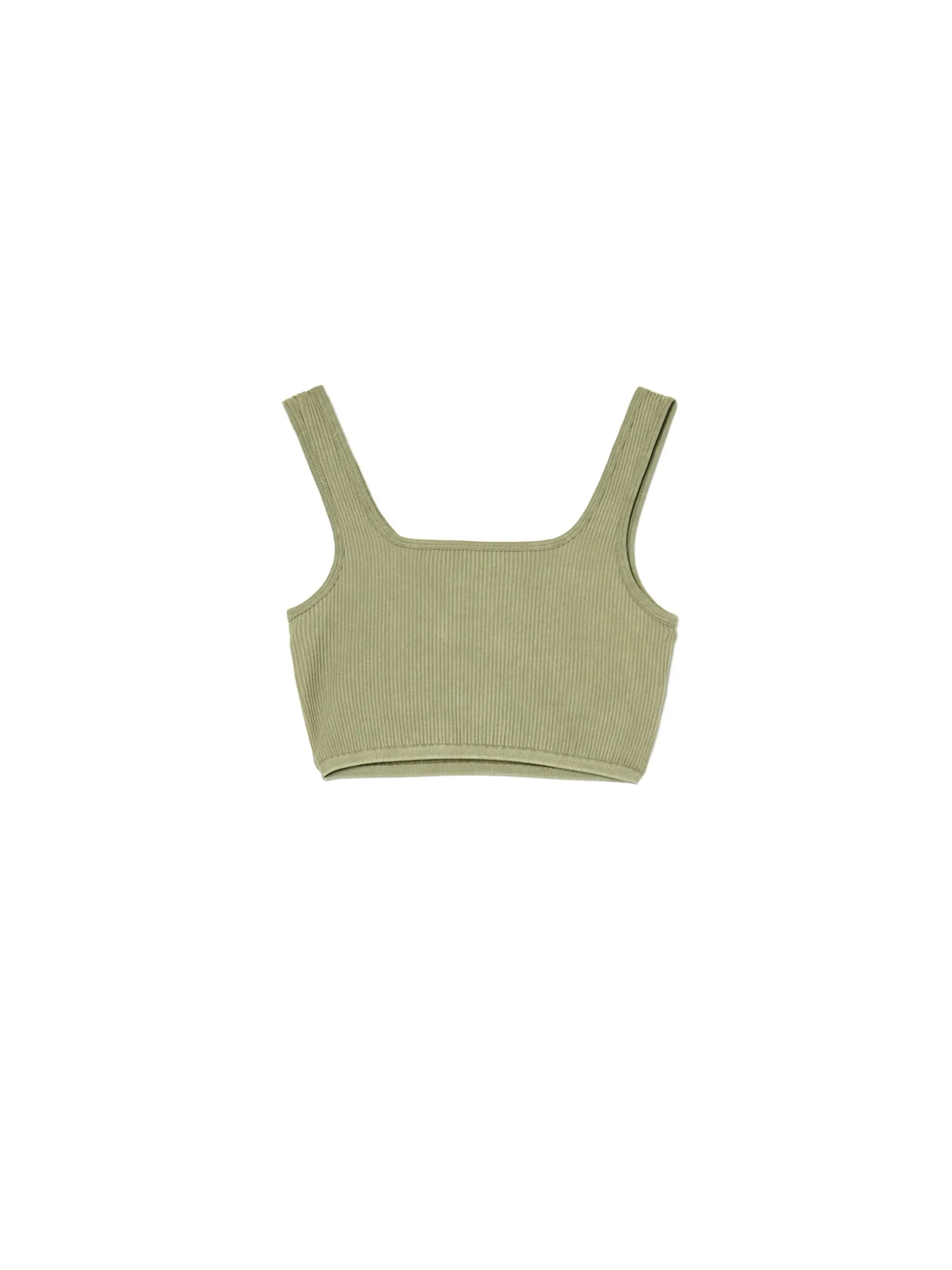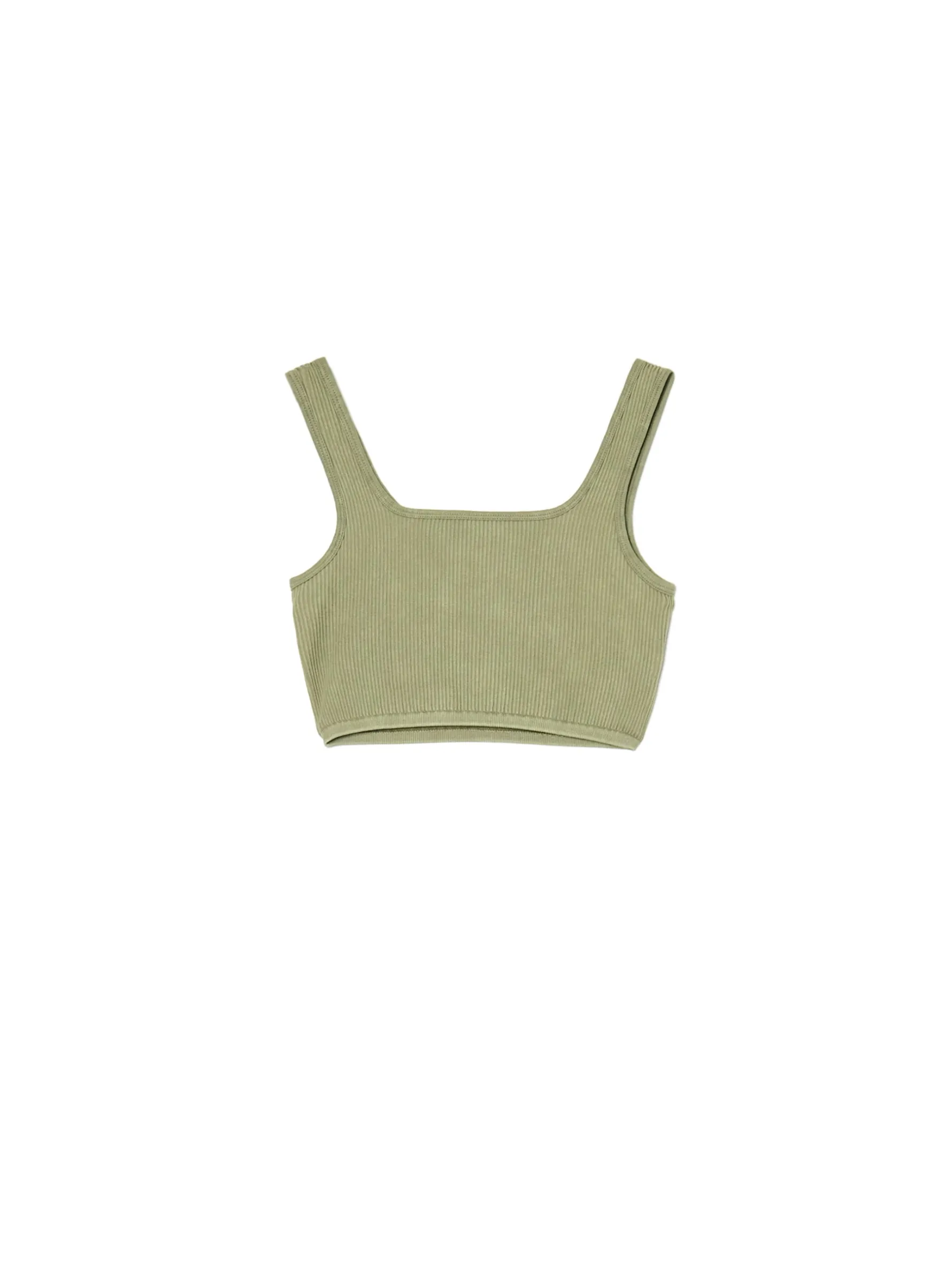 Damski gładki top w kolorze oliwkowym, uszyty z wytrzymałego materiału z dodatkiem elastycznych włókien. Idealny na aktywne dni! dzianina z dodatkiem elastycznych włókien krótki, dopasowany fason kwadratowy dekolt z przodu i z tyłu cienkie ramiączka