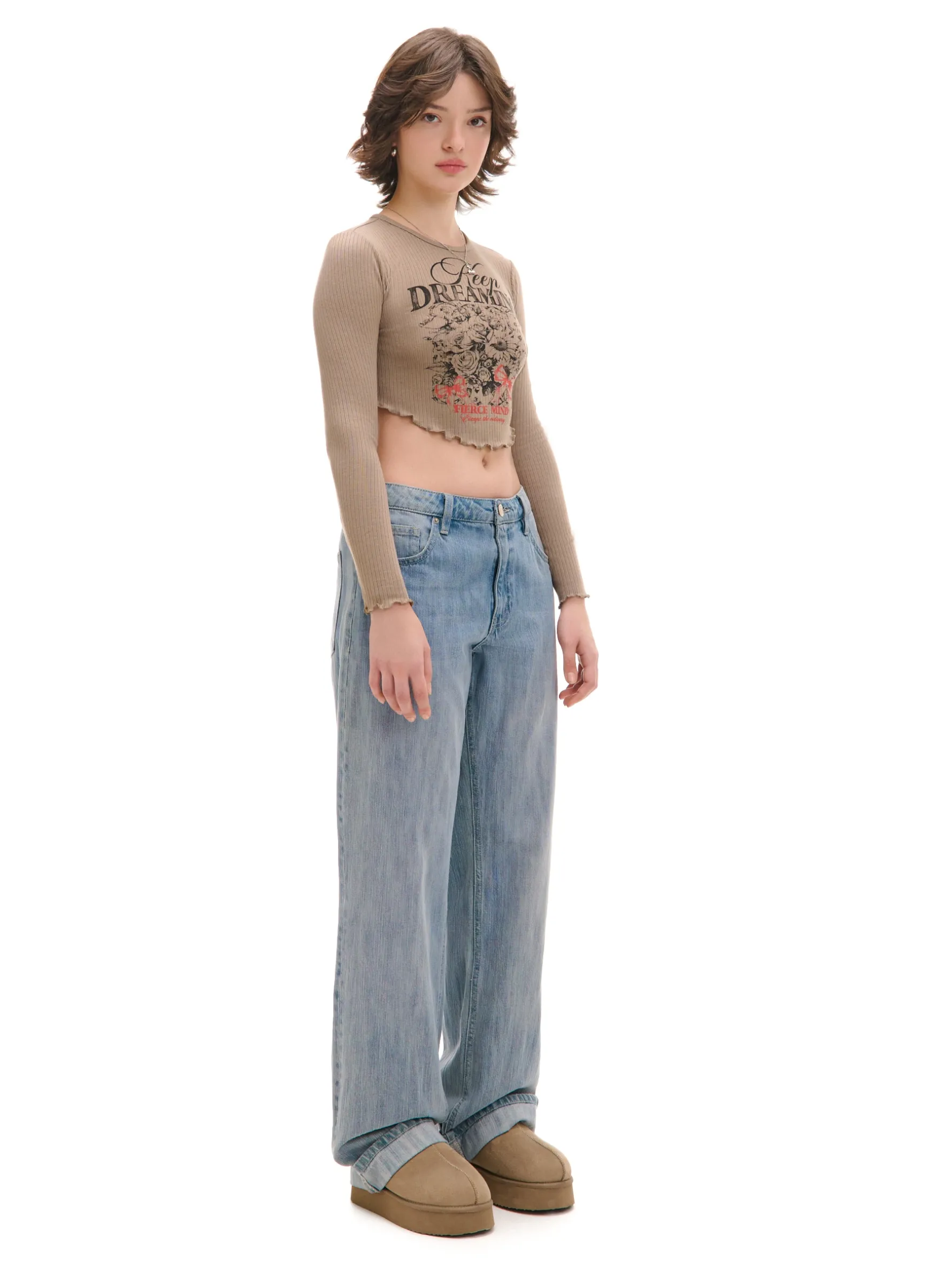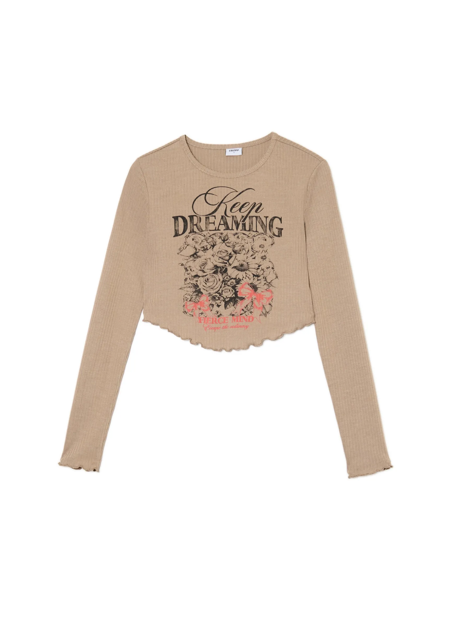 Damski T-shirt z długimi rękawami uszyty z prążkowanej dzianiny. Ozdobę stanowią marszczenia na dole i przy rękawach oraz wyjątkowy print na przodzie. Idealnie fituje z jeansami typu baggy czy skater. uszyta z prążkowanej dzianiny zawierającej wiskozę dopasowany krój podkreślający sylwetkę okrągły dekolt z lamówką długie, dopasowane rękawy dekoracyjne zakończenie brzegów ozdobne marszczenia kwiatowy wzór tekstowy nadruk z przodu