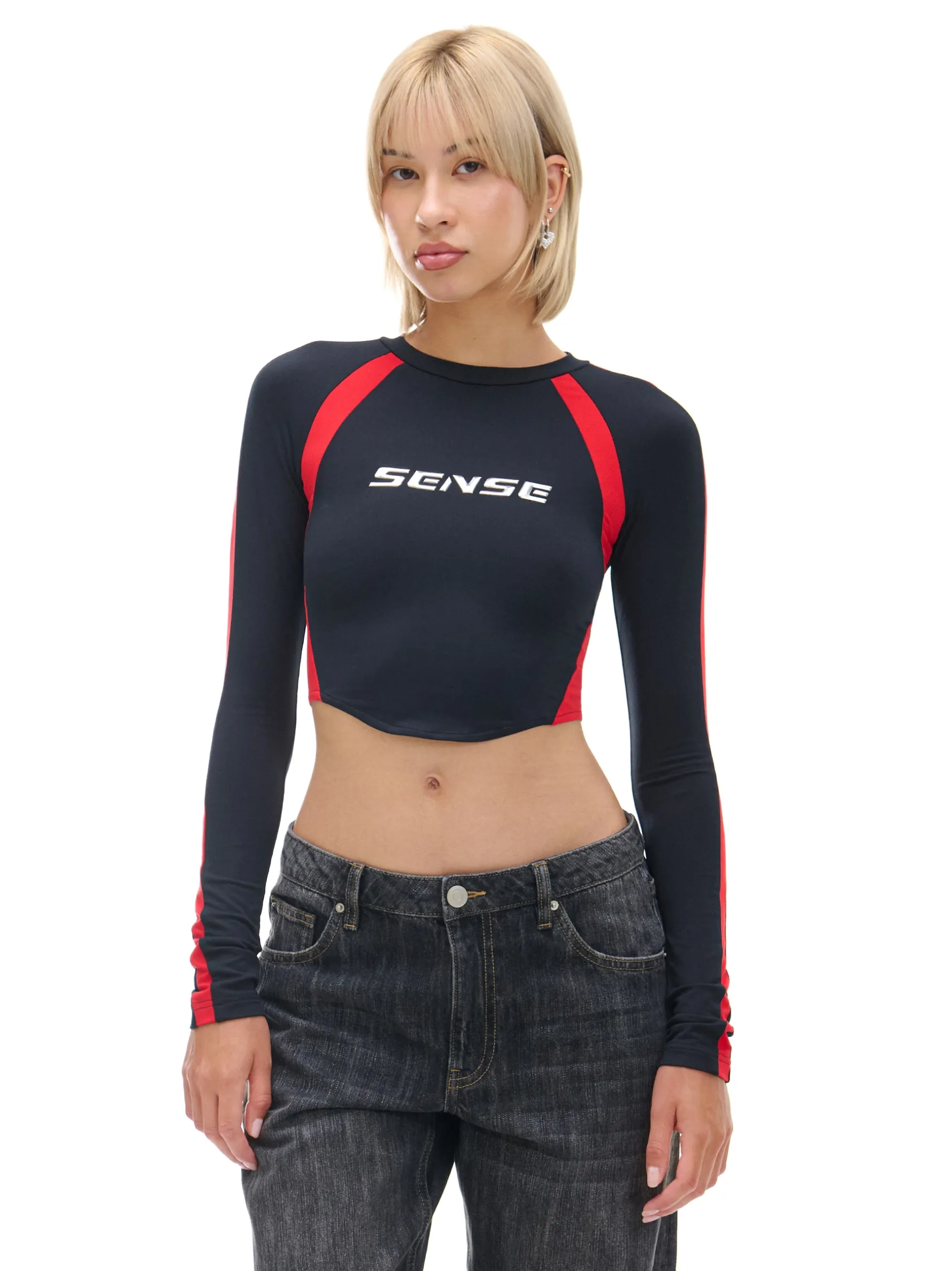 Czarno-czerwona koszulka z długim rękawem o krótszym, dopasowanym kroju. Delikatnie profilowanie na dole i charakterystyczne nadruki podkreślają jej racingowy styl. dzianina z domieszką elastycznych włókien krótki krój zabudowany, okrągły dekolt z lamówką długie, dopasowane rękawy kontrastowy nadruk tekstowy Wzrost modelki: 177 cm