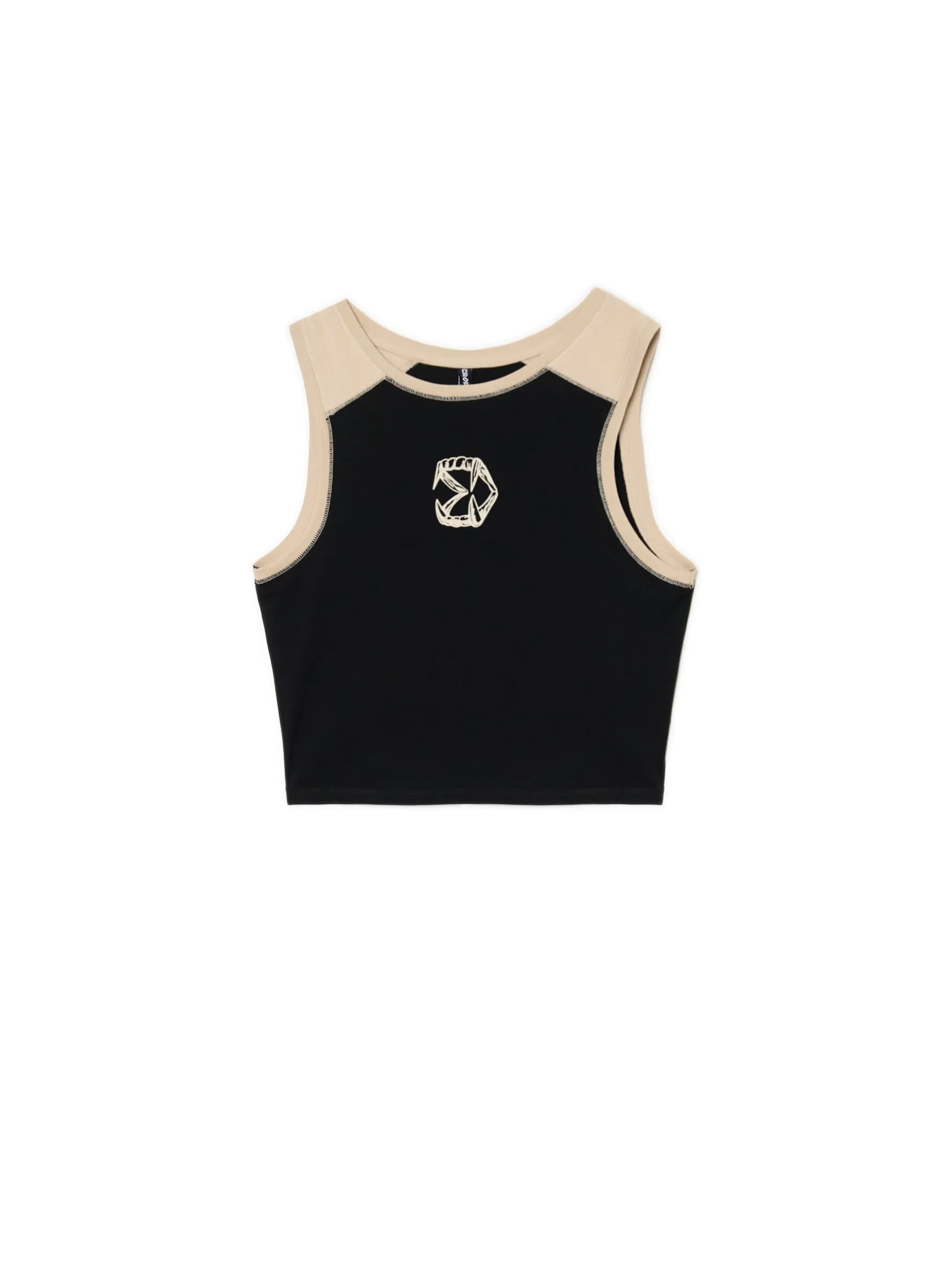 Damska koszulka na szerokich ramiączkach, uszyta z elastycznej dzianiny w kolorze czarnym. Hitem tego modelu są beżowe wstawki i nadruk z motywem szczęki. bawełna z dodatkiem elastycznych włókien dopasowany krój podkreślający sylwetkę bez rękawów nadruk z przodu