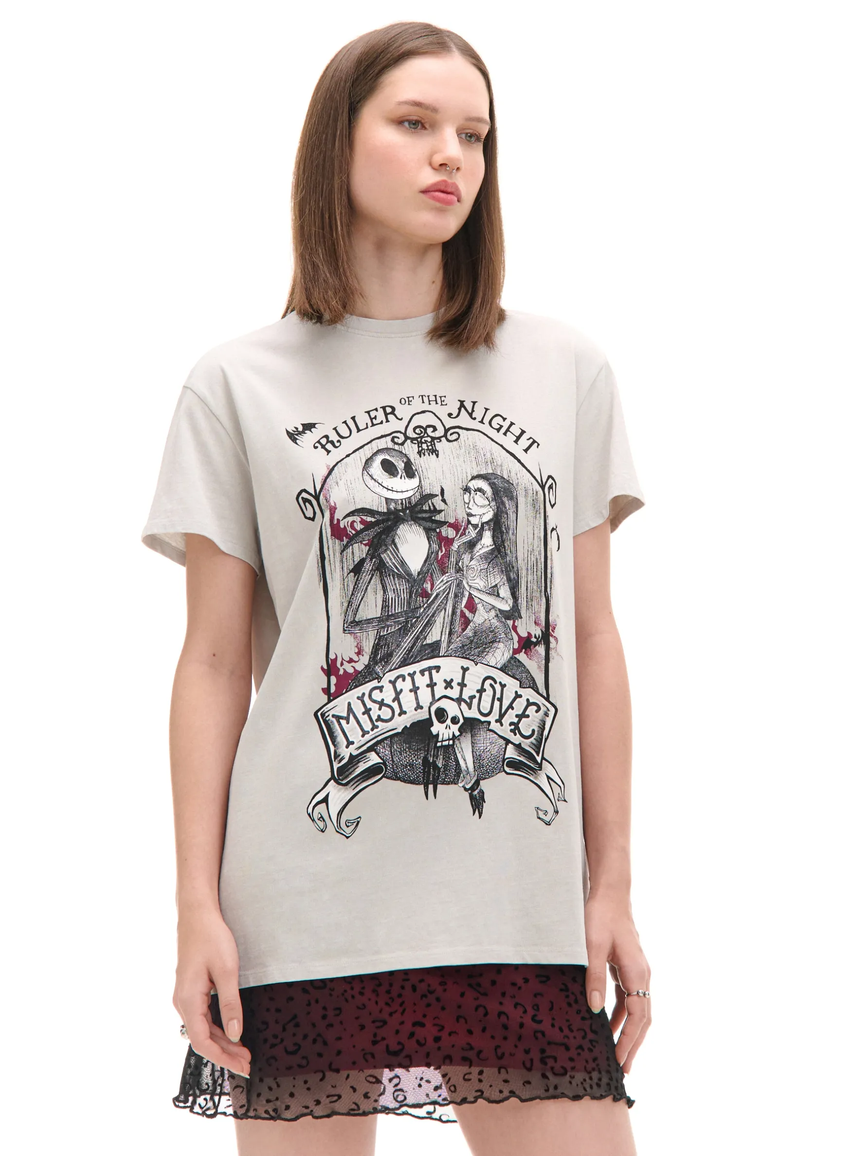 Bawełniana damska koszulka w jasnoszarym odcieniu na before lub after halloweenowy. Na przodzie grafika inspirowana disneyowskim filmem Tima Burtona „Miasteczko Halloween”. Buaaah! 100% bawełny oversizowy krój okrągły dekolt z lamówką krótkie rękawy delikatnie obniżona linia ramion nadruk z motywem Halloween Wzrost modelki: 172 cm ©Disney