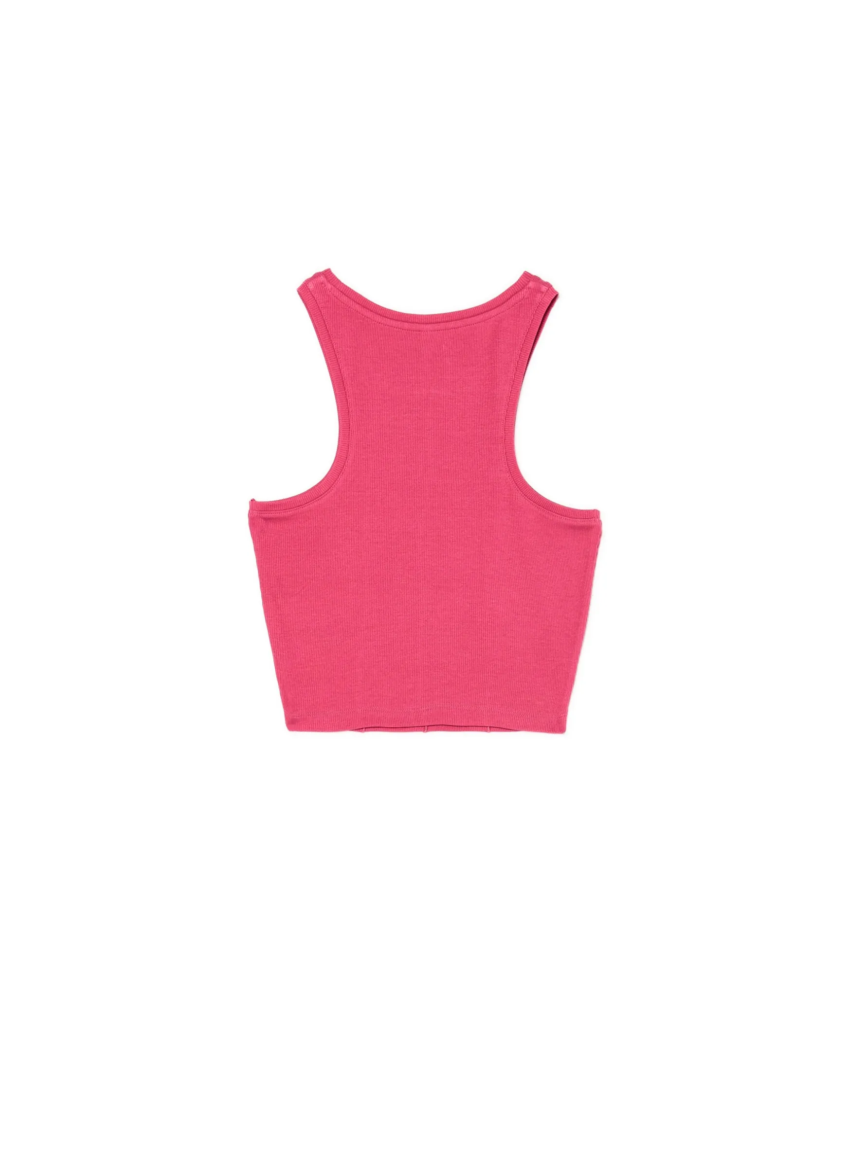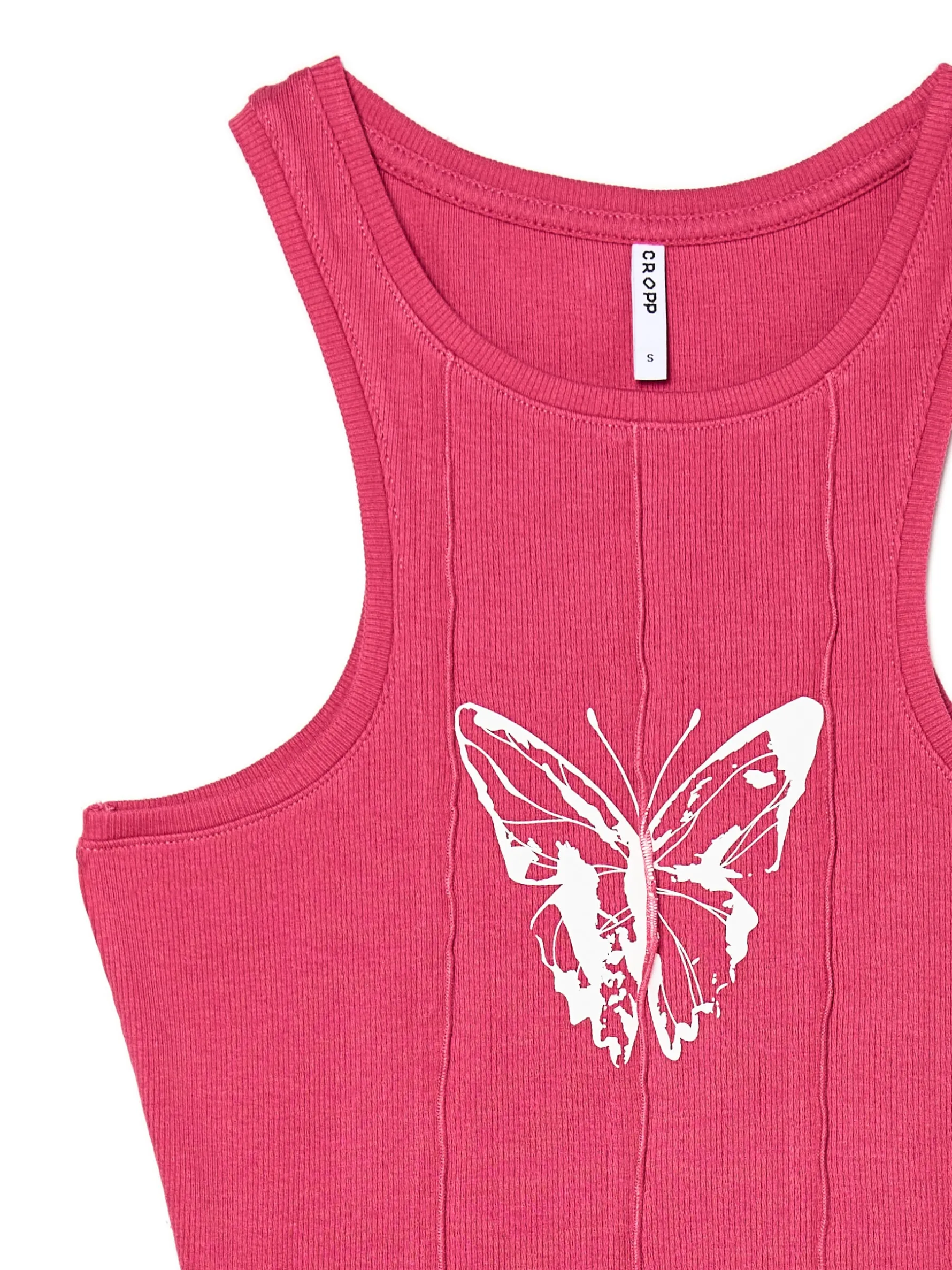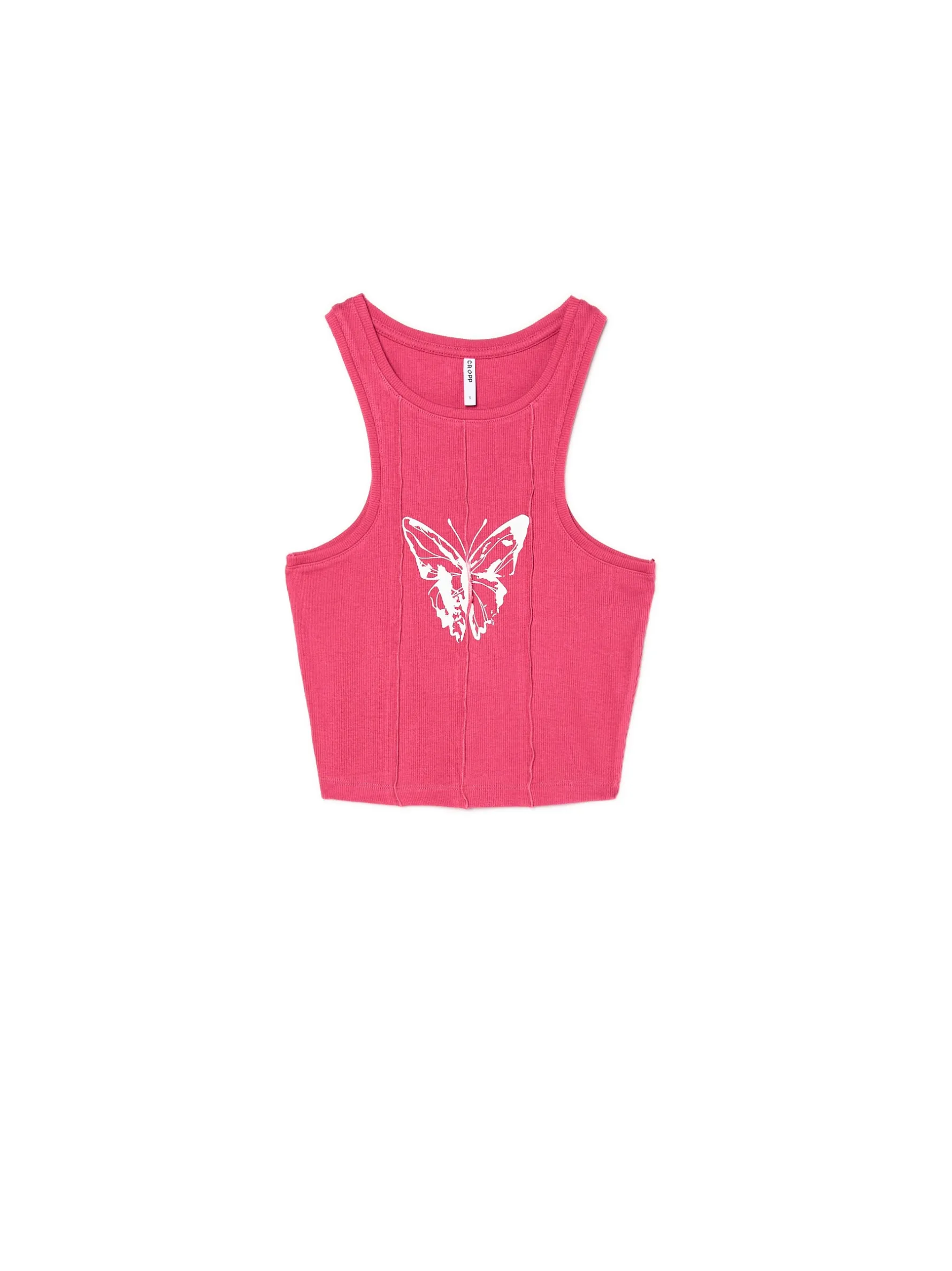 Różowy damski top, uszyty z dzianiny o bardzo wysokiej zawartości bawełny. Domieszka elastanu zapewnia idealne dopasowanie do sylwetki. dzianina z domieszką elastycznych włókien krótki, dopasowany krój szersze ramiączka dekolt typu halter ozdobne przeszycia z przodu nadruk z motylem Wzrost modelki: 172 cm
