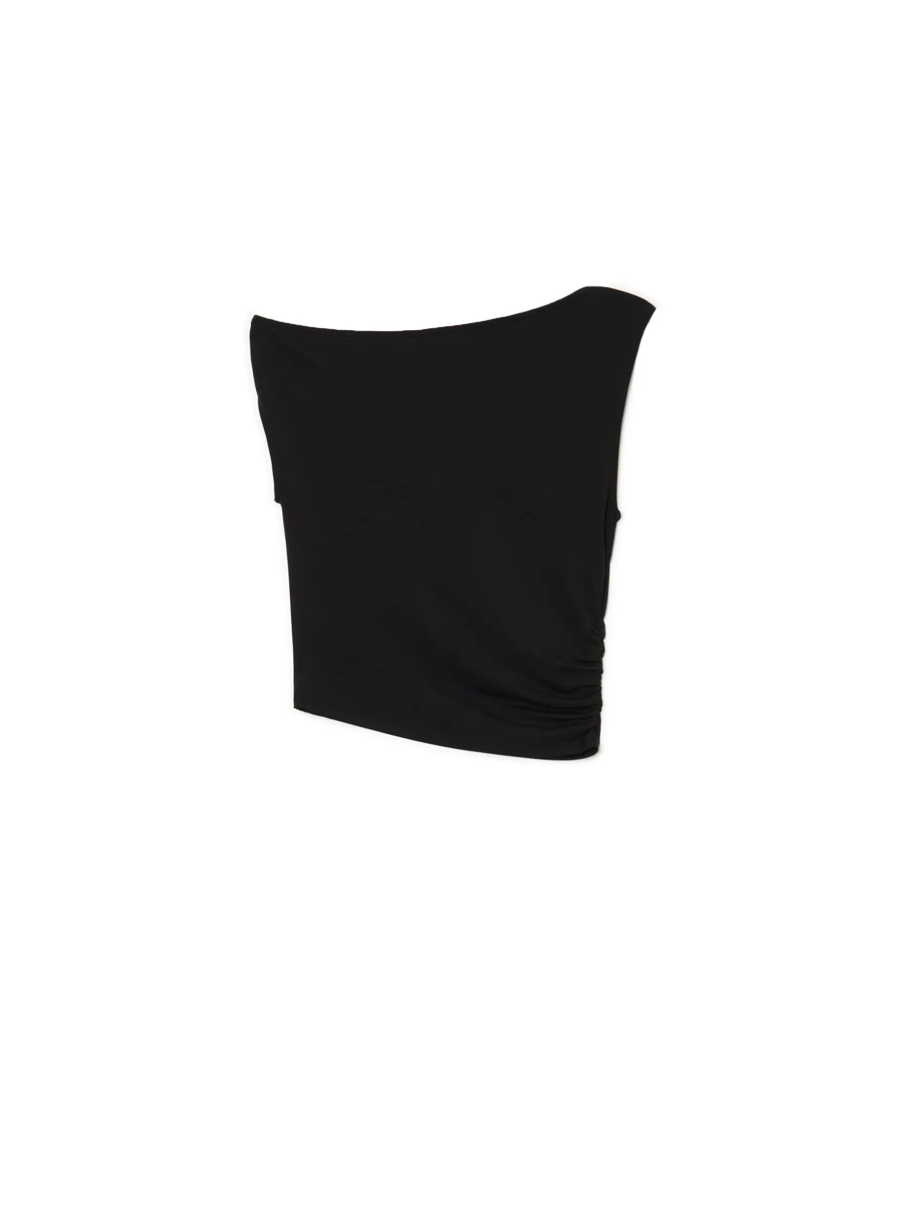 Damski top, uszyty z dzianiny z domieszką elastanu. krótki, dopasowany krój dekolt typu łódka w talii marszczenia Wzrost modelki: 177 cm
