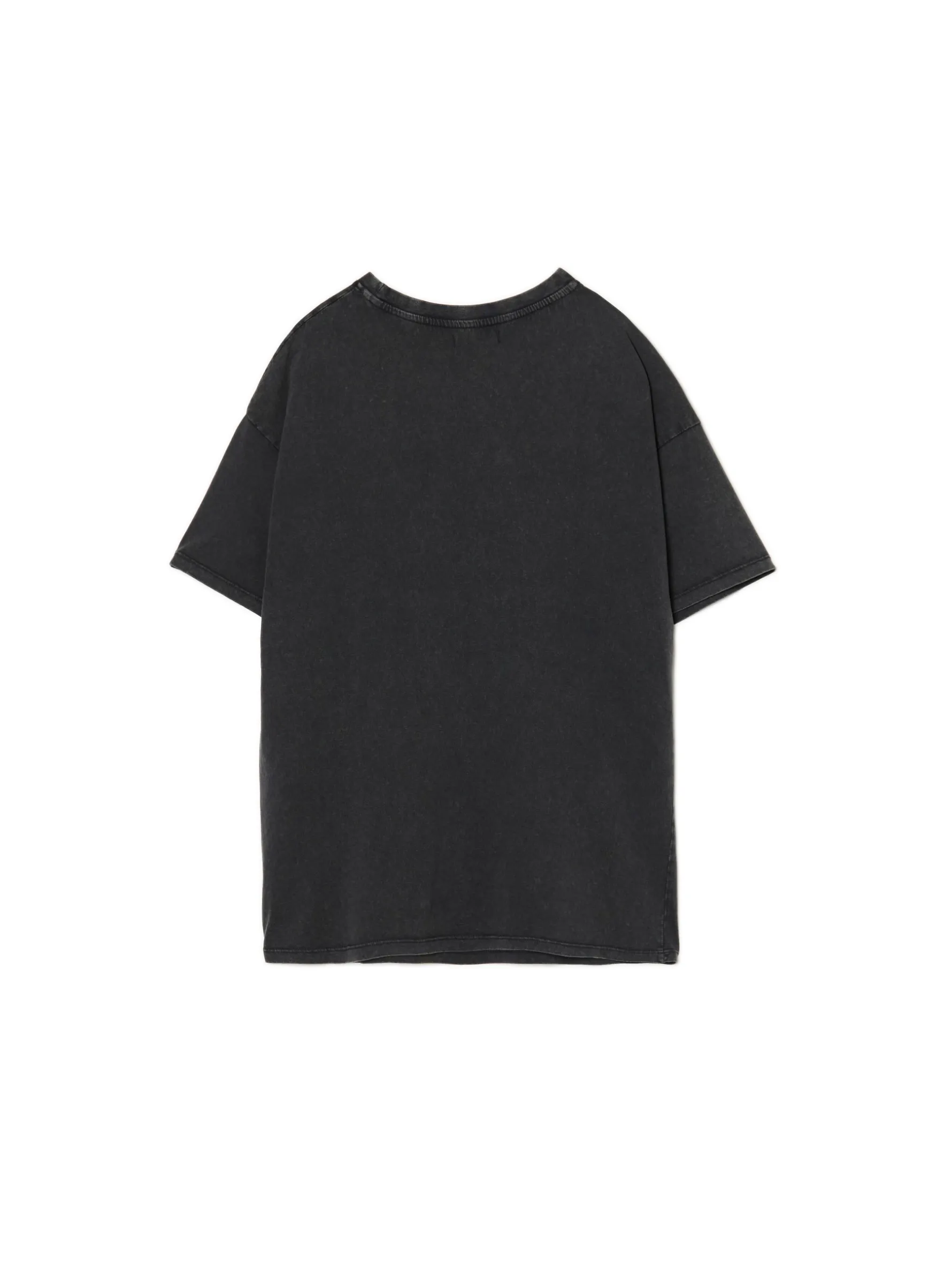 Bawełniana damska koszulka uszyta z dzianiny w kolorze szarym i efektem sprania. Na przodzie duży nadruk z motywem kości. 100% bawełny krój oversize krótkie, swobodne rękawy delikatnie obniżona linia ramion półokrągły dekolt z lamówką efekt sprania na całości duży nadruk z przodu